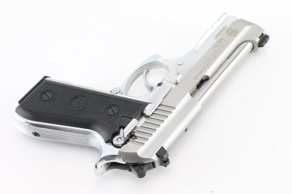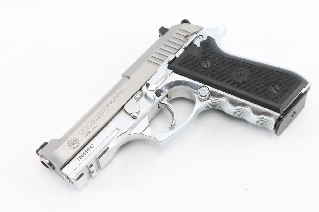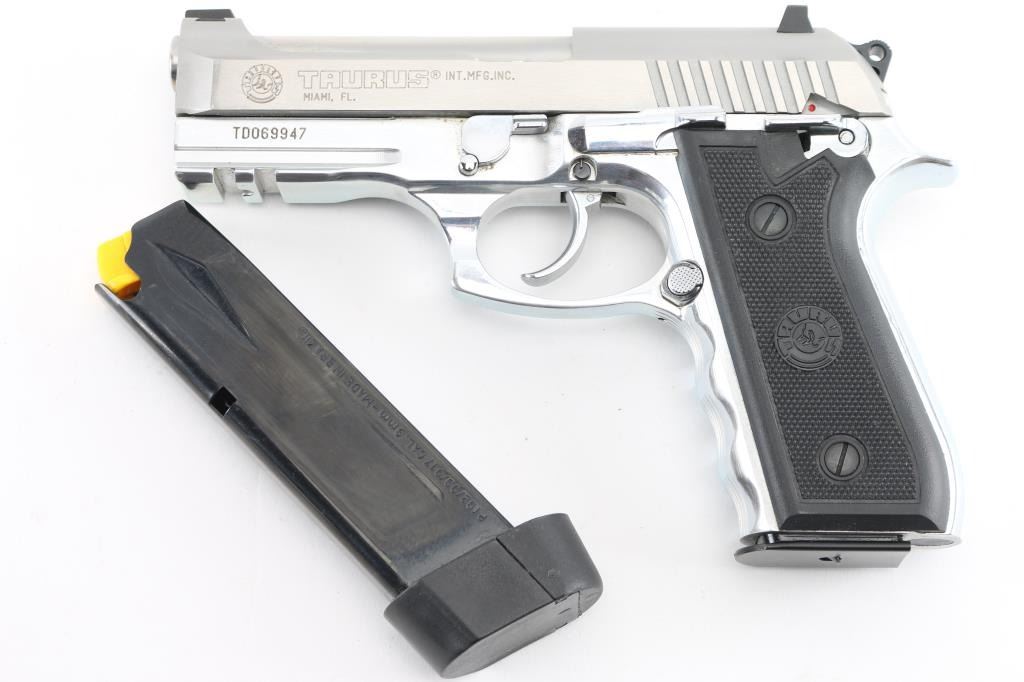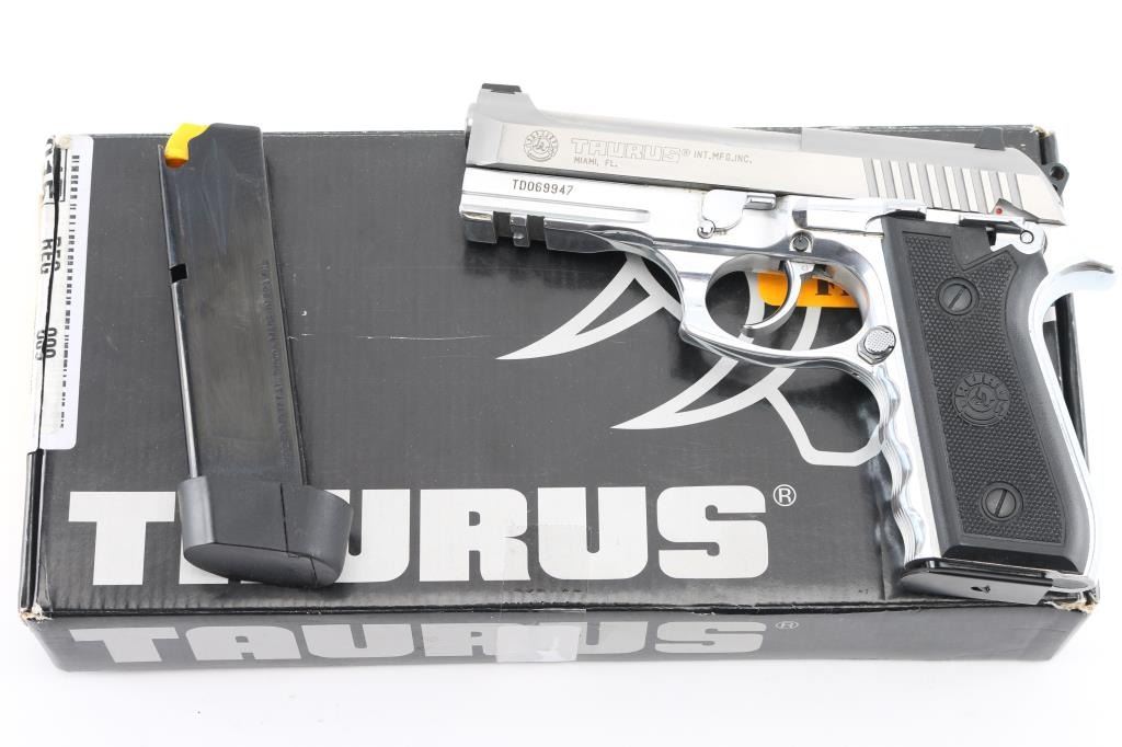 Made in Brazil. D/S action pistol is all stainless with 4" barrel, 3-dot combat sights, ambidextrous safety-decocker, accessory rail on frame, serrated straps with contoured finger grooved fore strap. Comes with standard 17 rd magazine. Bore is excellent, bright, grips are excellent, action is smooth, and the finish is very good with some very minor scratches. Comes in factory Box with extended 19 rd magazine.