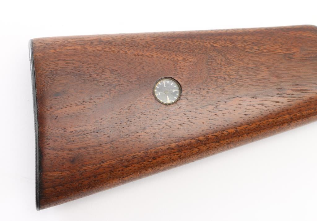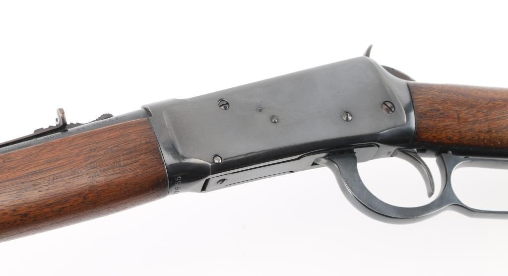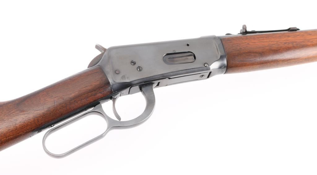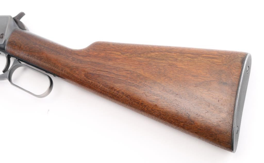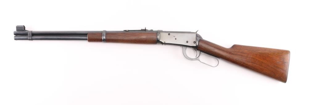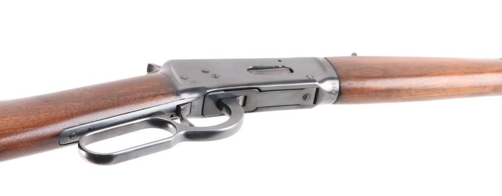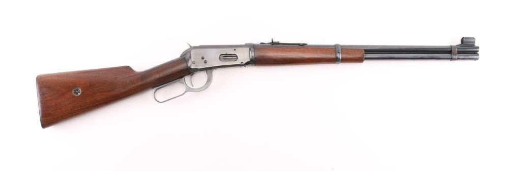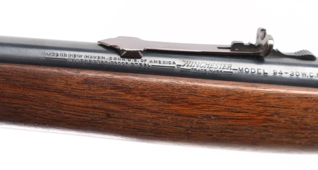 'Pre-64 Eastern Carbine' Lever action repeating rifle manufactured in New Haven, CT circa 1942. Features a blued finish, 20" tapered barrel, full-length tube magazine, ramped, hooded, post/bead front sight, sporting adjustable rear sight, smooth trigger, serrated hammer spur, two barrel bands, smooth walnut forend and straight grip shoulder stock with checkered steel buttplate. Bore is very good condition. Retains 98% re-blued finish with edge losses, scratches. Wood is very good condition with dents & scuffs. Has a small compass inletted in the right buttstock. (Working) NRA Condition-Very Good/Re-Blued. C&R Firearm.