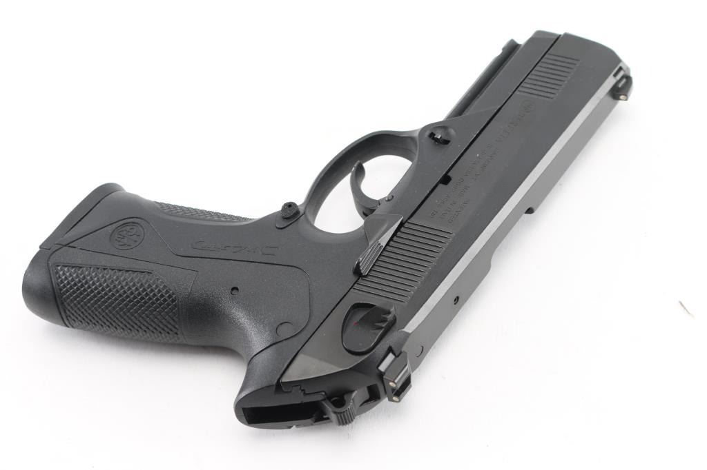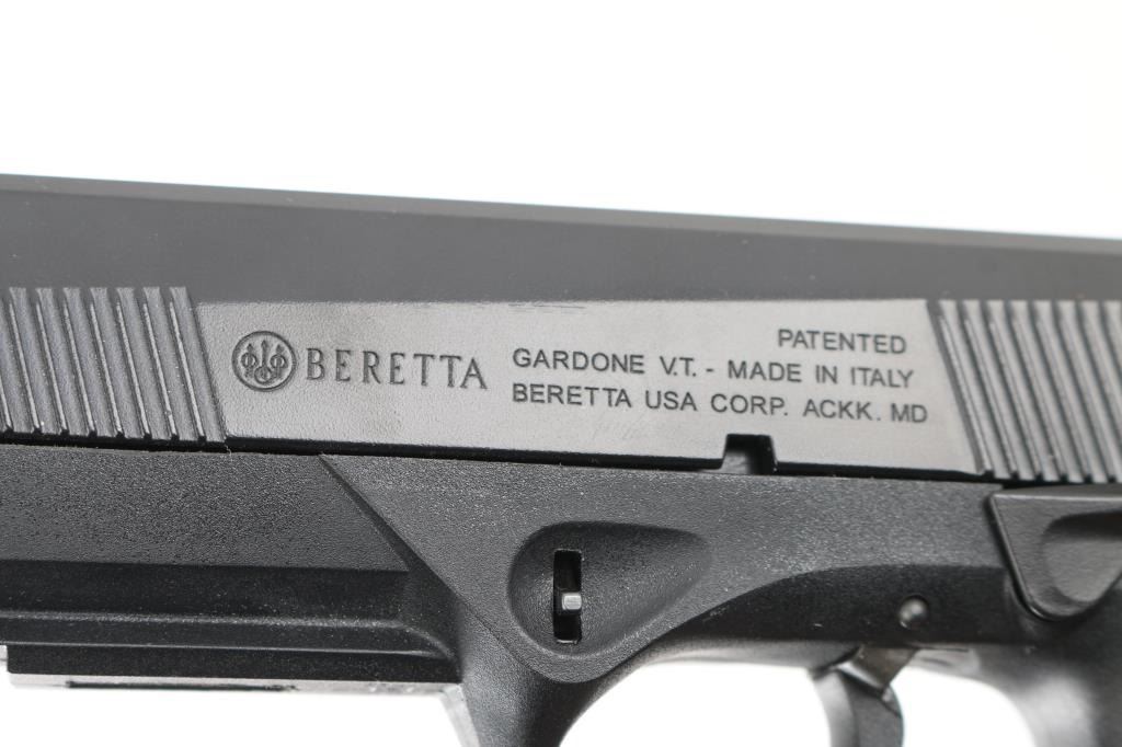 Italian made DA/SA semi-auto pistol chambered for 9x19mm. It features a 3.25" blued barrel with a matte black finished slide, polymer frame with textured grip, ambi safety/decocker, smooth trigger, serrated hammer spur, accessory rail, Dovetailed 3-dot sights. Comes with original hard case, (3) three 12 round magazines, cleaning gear, and manual. Bore is excellent. Overall finish shows little if any signs of use, wear or handling. NRA Condition-Excellent. Modern Firearm.