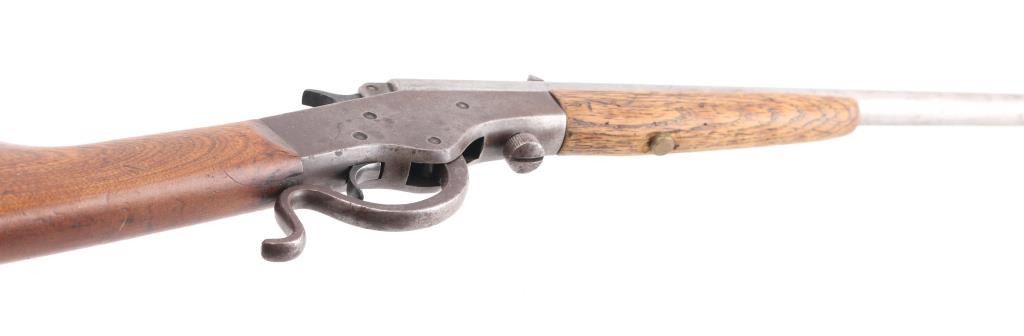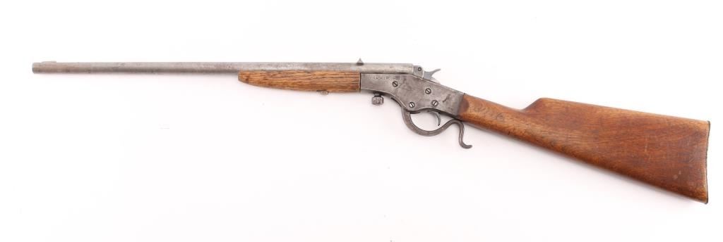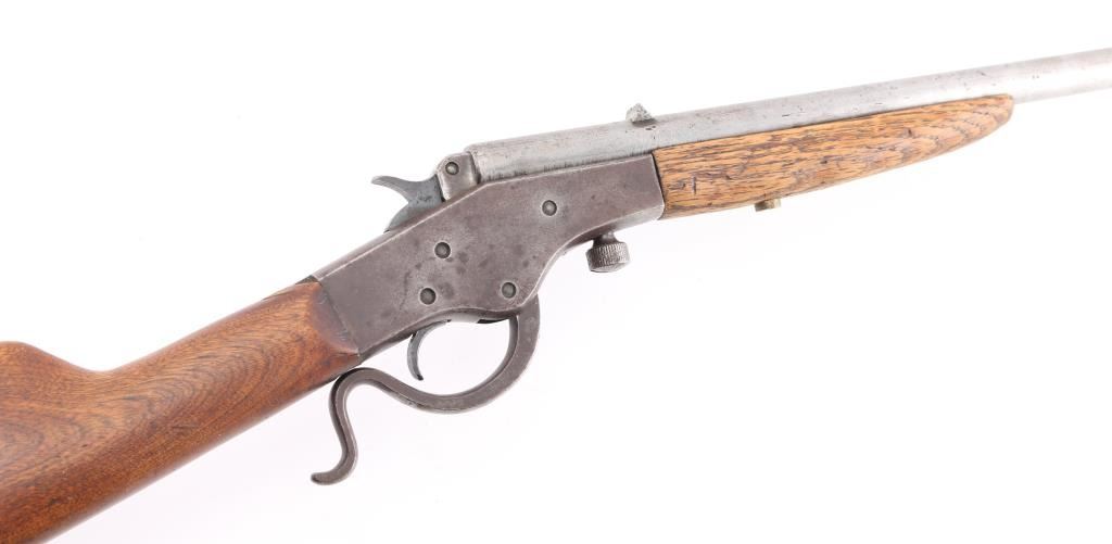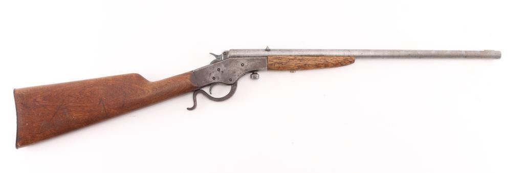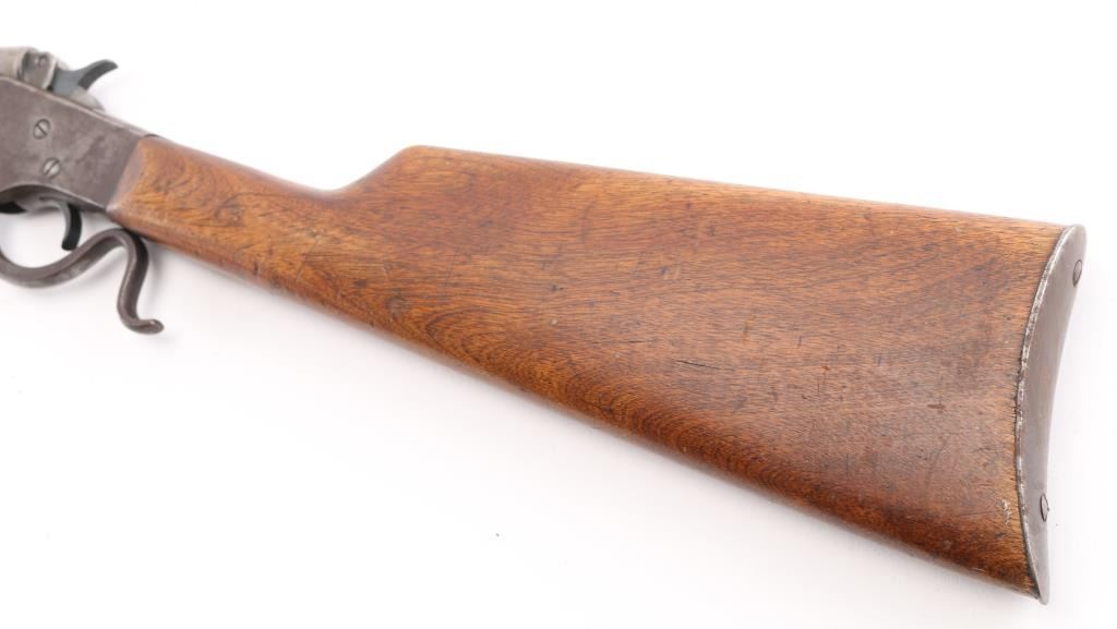 Vintage single shot falling block rimfire rifle, manufactured circa 1912-1939. Features blued finish, blade front & notch rear sights take-down screw under action, exposed hammer, bottom breech block opening lever, smooth wood forend & straight wrist shoulder stock, steel buttplate. Bore is fair condition, lightly pitted throughout, good rifling remaining. Barrel is mostly in the white, gray color, some slightly rough texture. Action is brown color. Wood is very good condition, minor scratches/dents. Action works well. NRA Condition-Fair to Good. C&R Firearm.