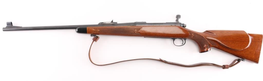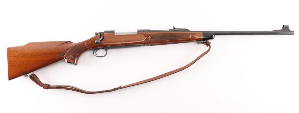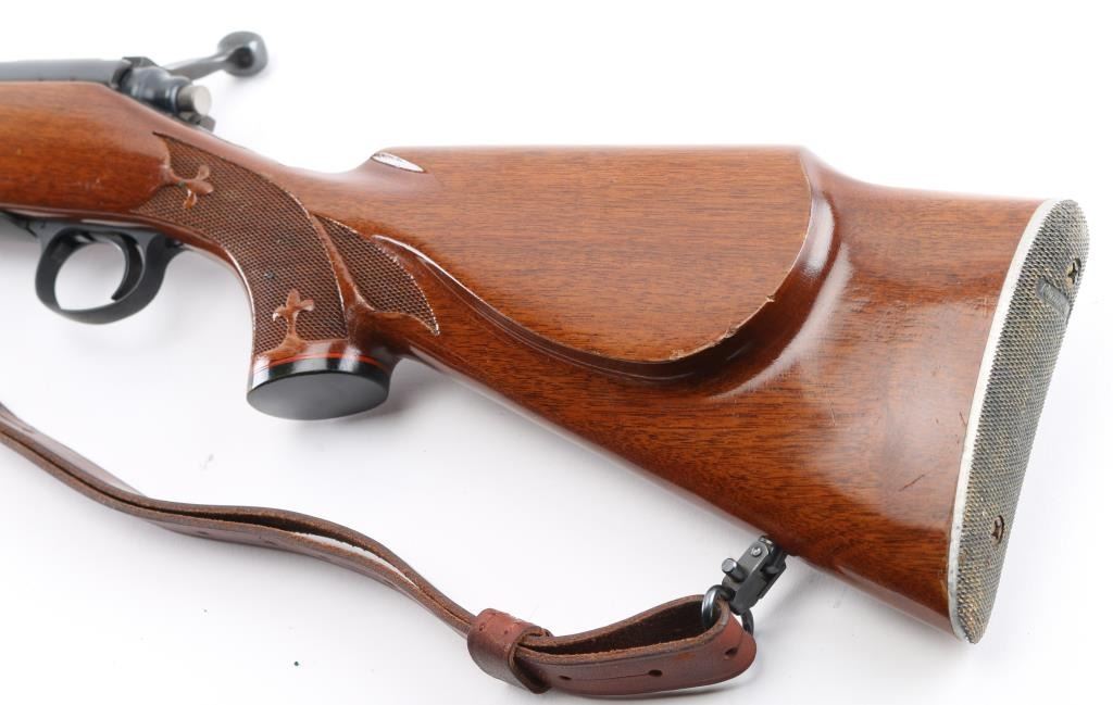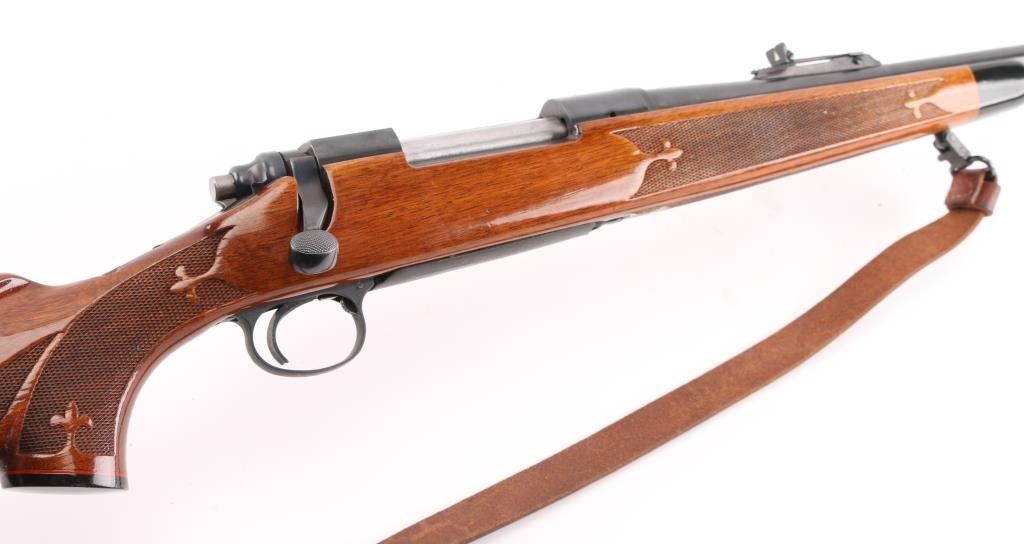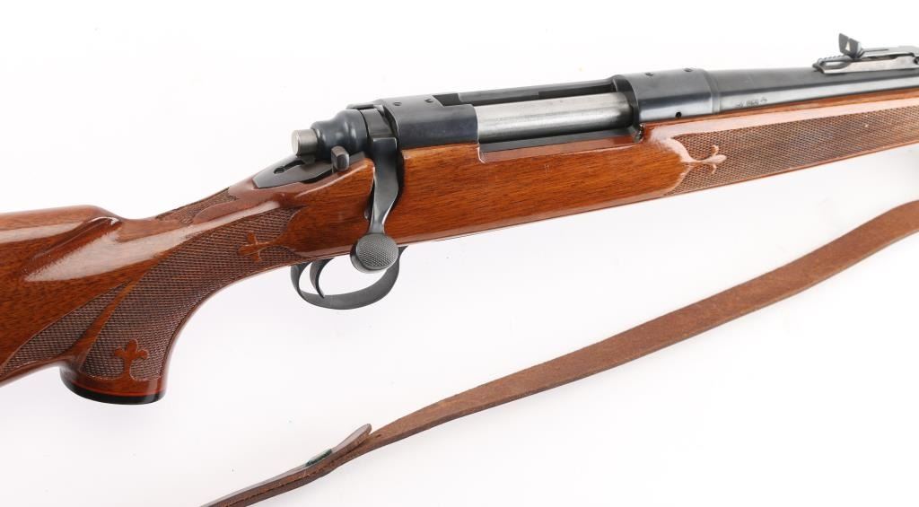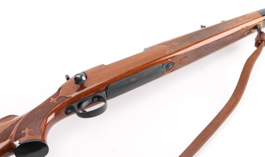 Bolt action sporting rifle features blued finish, Remington brown laminate wood stock with impressed checkering on wrist & forearm with Fluer de lis points, right handed shadow line cheek piece, ebony fore tip, & grip cap. 22' tapered barrel, hooded blade/bead front & rear sporting sights, blind magazine, manual safety, serrated trigger. Receiver drilled/tapped for optics. Bore is very good, needs cleaning. Retains 98% blue finish. Stock is near excellent with some minor scratches/scuffs. Action is smooth/tight. NRA Condition-Near Excellent. Modern Firearm.