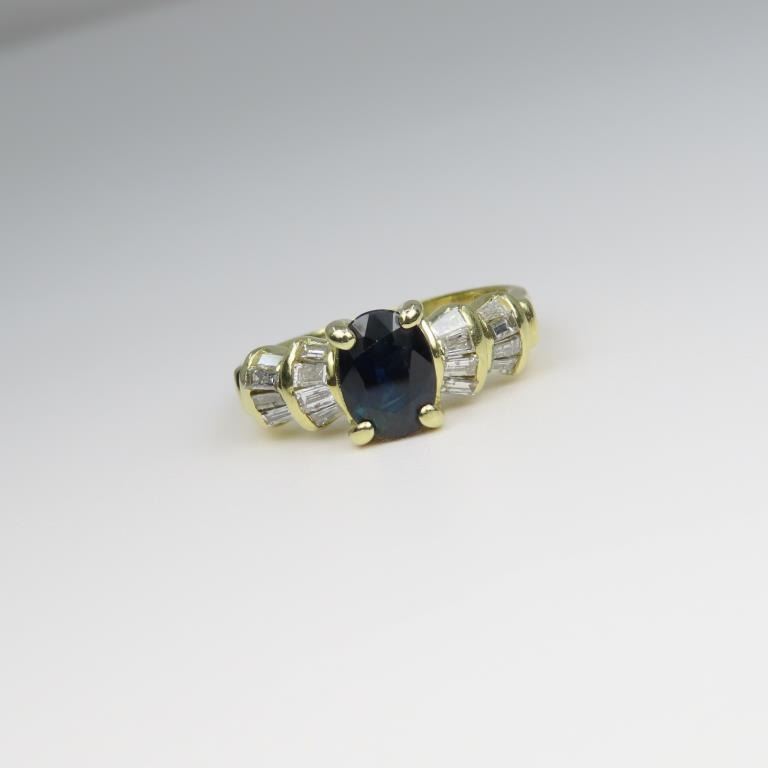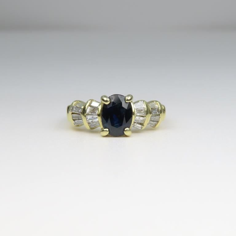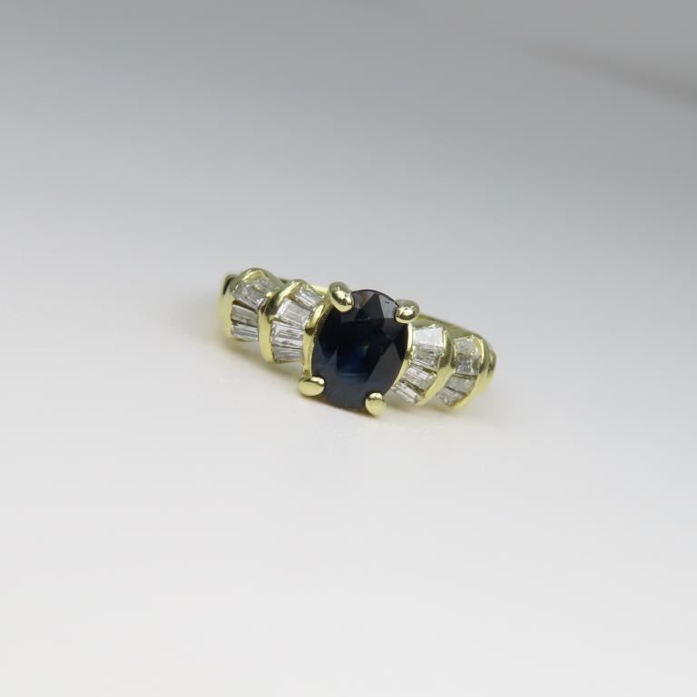 featuring Blue Sapphire weighing over 1.00 carat accented with 20 channel set baguette cut Diamonds weighing approx. 0.50 carats with H-I colors set in 14 karat yellow gold setting, size 6 ½.
