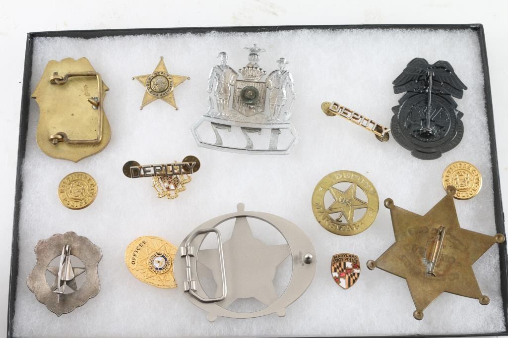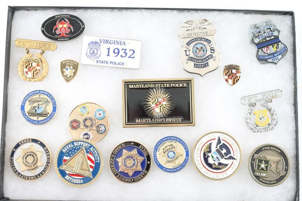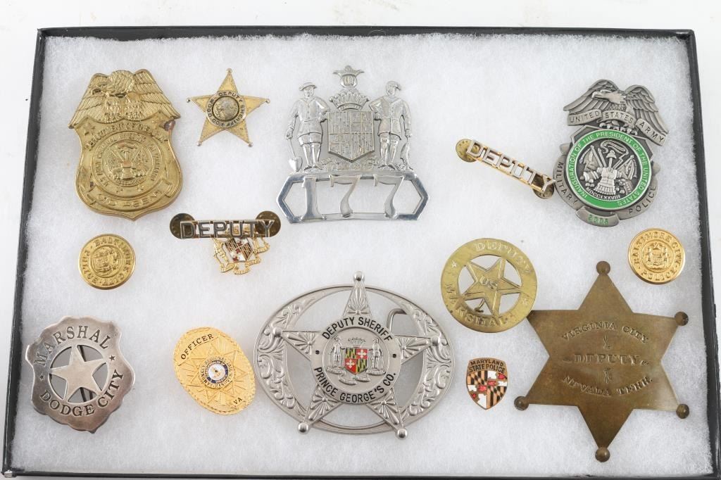 Includes badges from US Army CID to Virginia City, NV Deputy; misc. police insignia and coins from various police agencies.