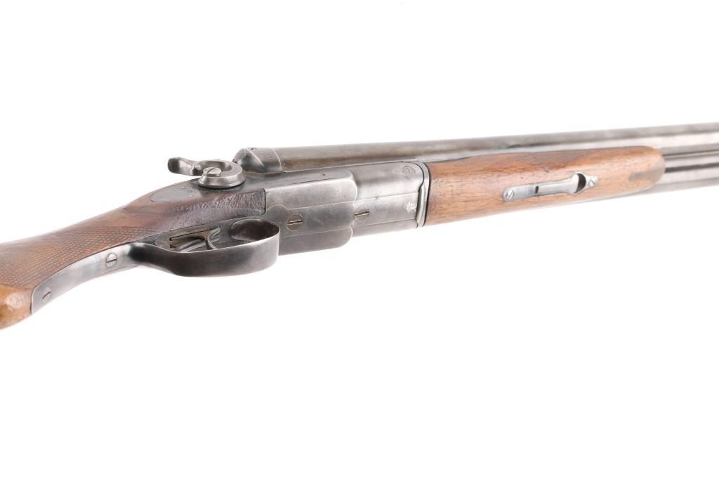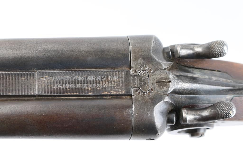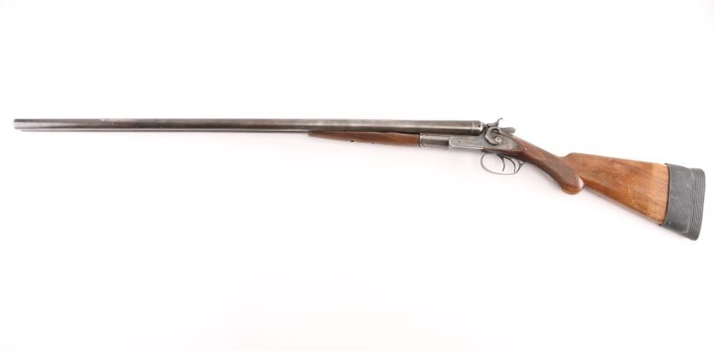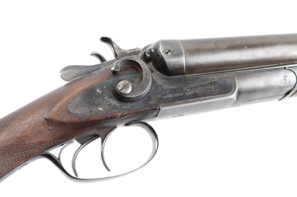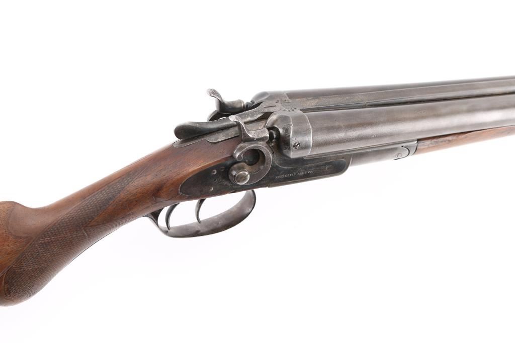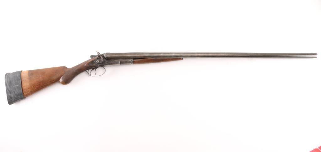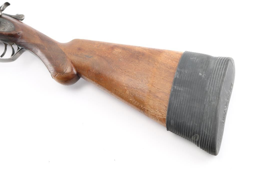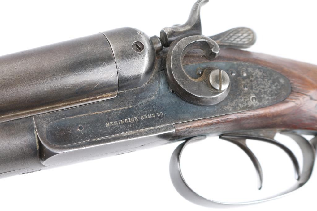 Double barrel side by side shotgun has side lock action with external circular "C" hammers, 30" barrels, front sight bead. Manufactured 1888-1908, this one after 1900, 200,000 block started 1900. Bores are very good, barrels lock up tight, matching serial numbers, factory plastic buttplate is missing, has a slip-on rubber recoil pad, "Remington Arms Co." address on knurled rib, and "Remington Arms Co." marked lock plates. Buttstock with bag grip is fair with cracks in wrist, forearm has scratches/dings with most of the checkering gone. There are old repairs, brazed under the forearm to the catch & peening around the dolls head, Blue is about 20% with most turned a dull gray patina. NRA Condition-Fair. C&R Firearm.