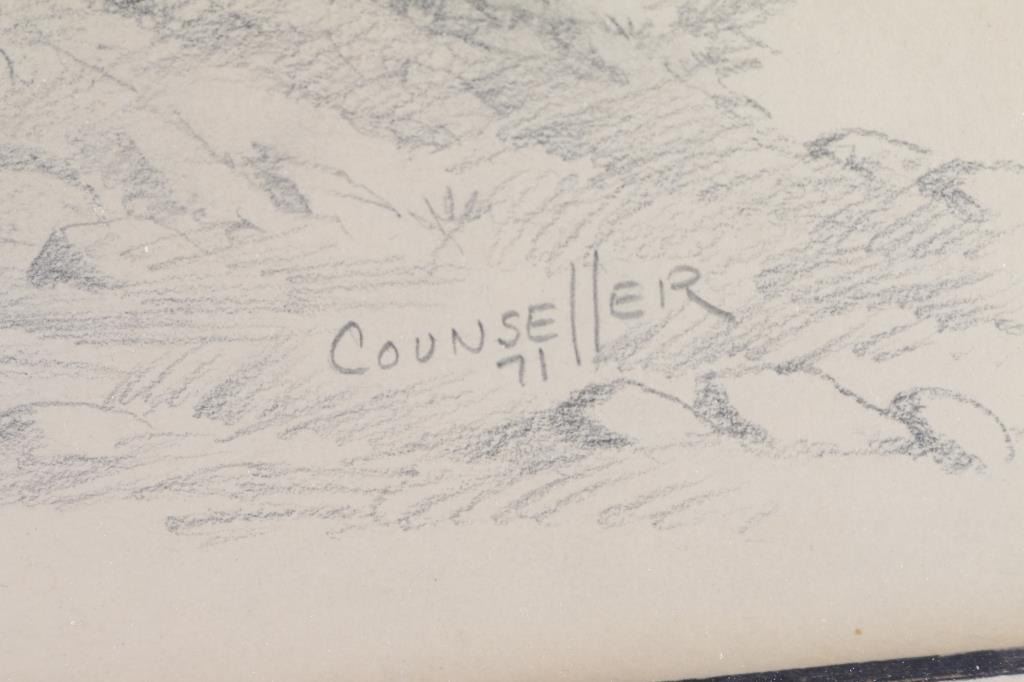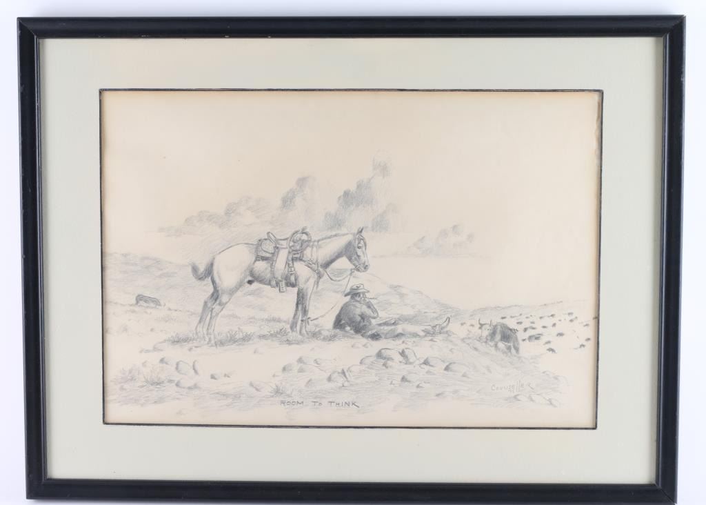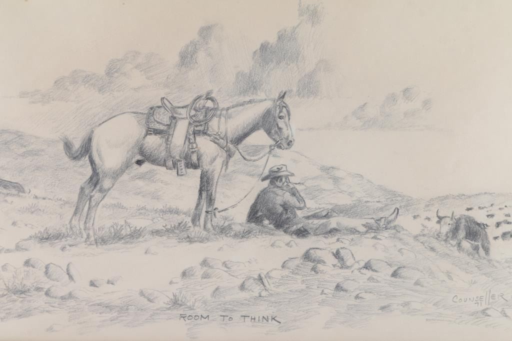 By artist "Mel Counsell" entitled "Room To Think" signed and dated lower right. Framed in wood frame, image size measuring 17x12. Bio- Melanie Counsell (born 25 January 1964) is a Welsh filmmaker, installation artist and sculptor. She works with a multitude of media such as 16 mm film, drawing, printed matter, sculpture and sound for context. Counsell has been resident at a range of art institutions, has undertaken roles in teaching and has won multiple awards for her works. She also worked with profound Arizona artist zane grey who directed western films and books.