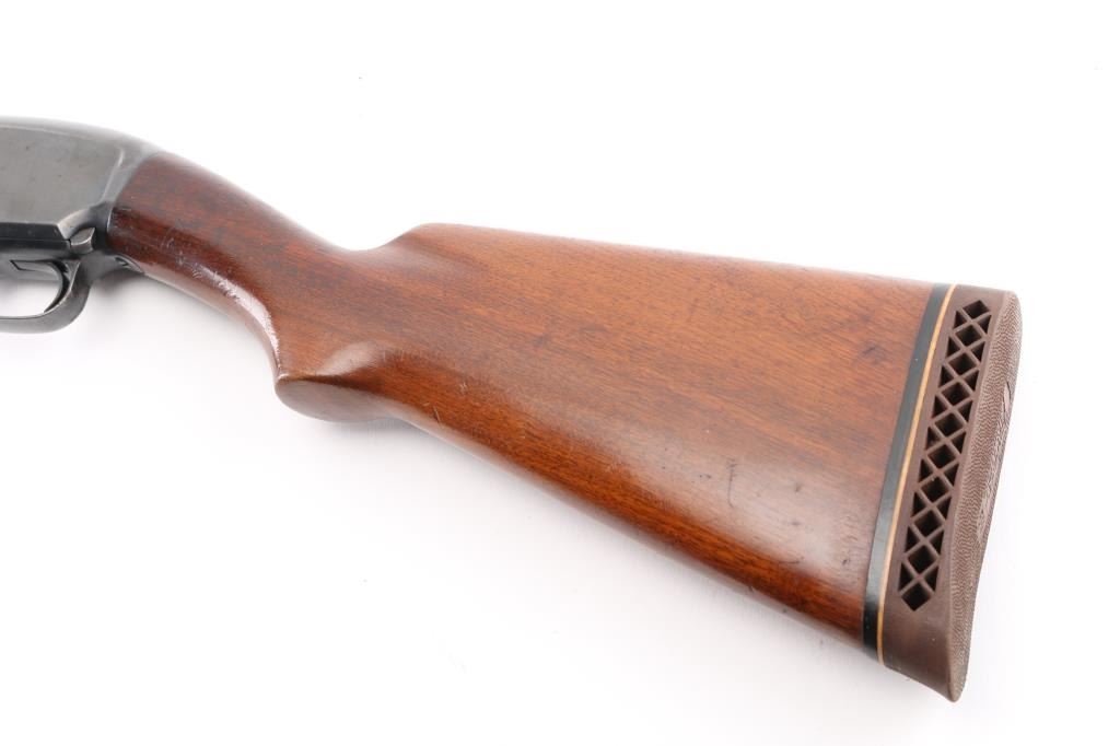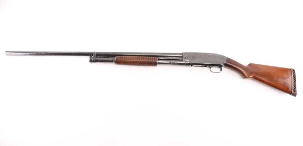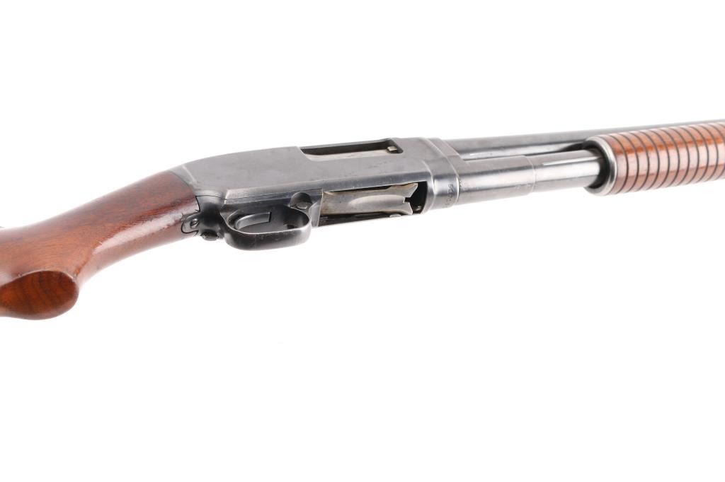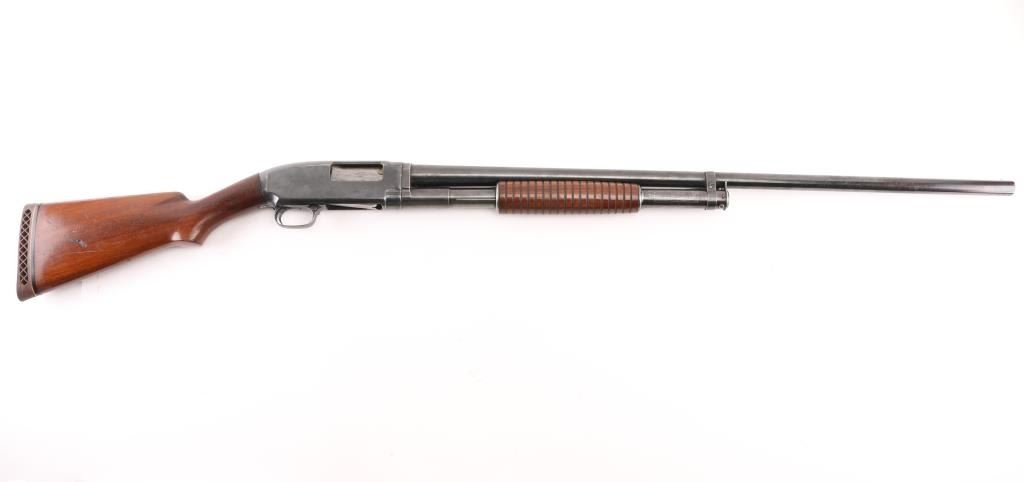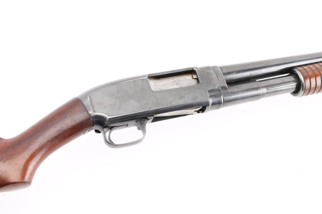 Vintage take down pump action shotgun manufactured circa 1927. Features 32" round barrel, barrel marked "FULL" choke, steel front bead, blued finish, walnut stock & pump handle, lined pump handle, Pachmayr recoil pad. (13 1/4" LOP), push button safety. Bore is excellent/bright. Retains 75% blue with handling marks & small scratches, rubbing wear where pump handle slides, light muzzle wear. Wood is very good condition with dents and small scrapes. Numbers match on receiver & extension. (Extension number is faint/readable). Action is smooth. NRA Condition-Good+. C&R Firearm.
