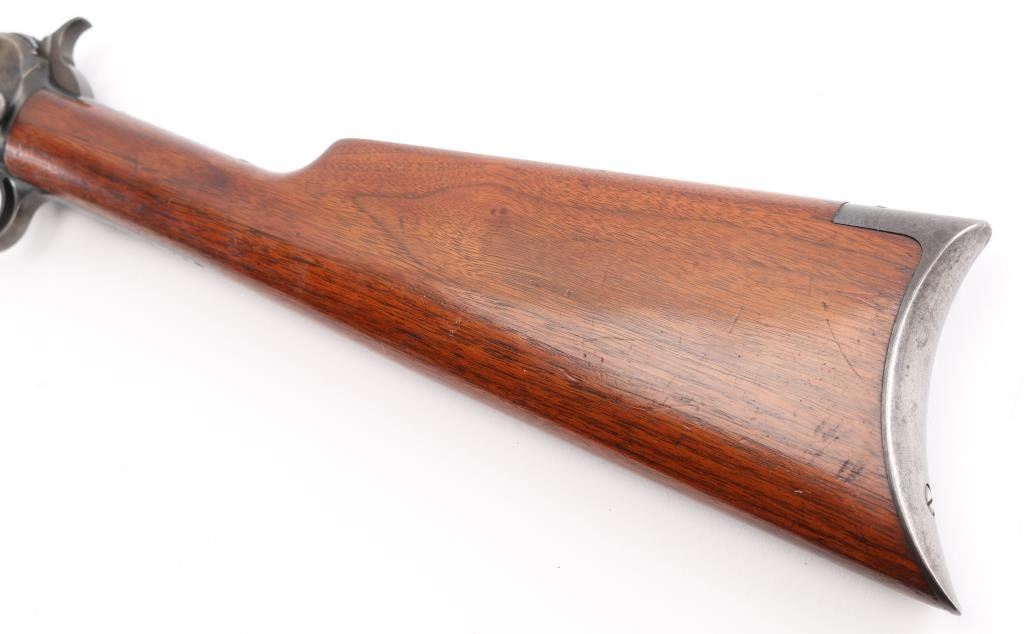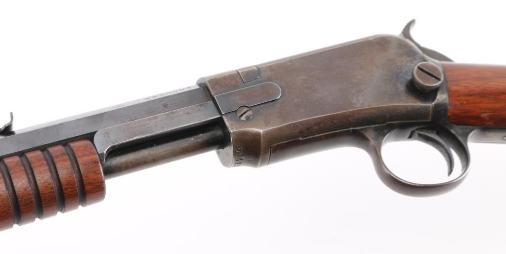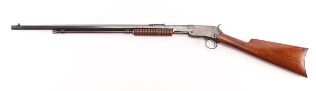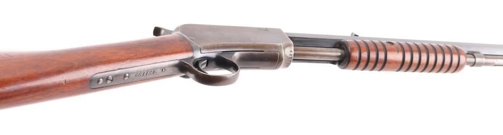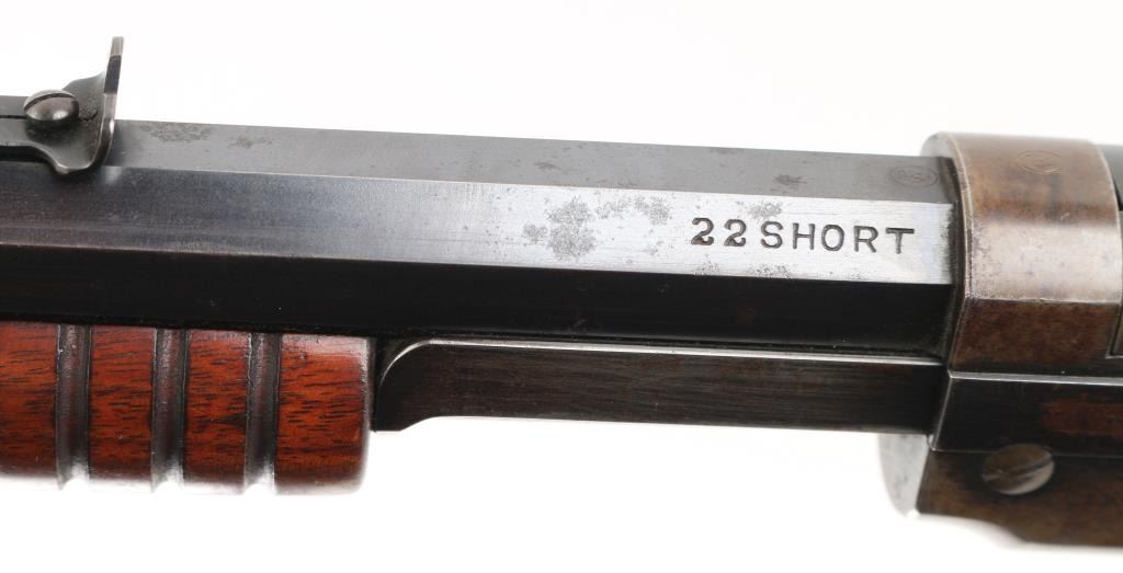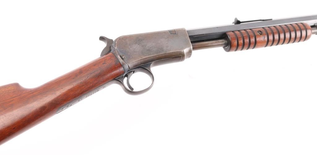 Pump action rimfire rifle manufactured circa 1909. Features blued finish, grooved 'corn cob' wood pump handle and shoulder stock with straight grip area, crescent steel buttplate, 24" octagonal barrel, blade/bead front sight, adjustable rear sight, magazine tube under barrel, external hammer, take down screw in receiver. Bore is good with strong rifling, light pitting. Blue finish is about 65% with handling loss, mostly on the receiver, & tube.. Numbers match on receiver & lower tang. Markings are crisp.. Condition is NRA Good. C&R Firearm.