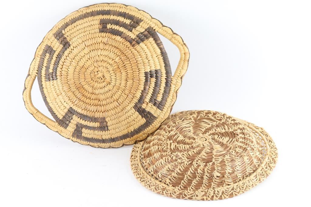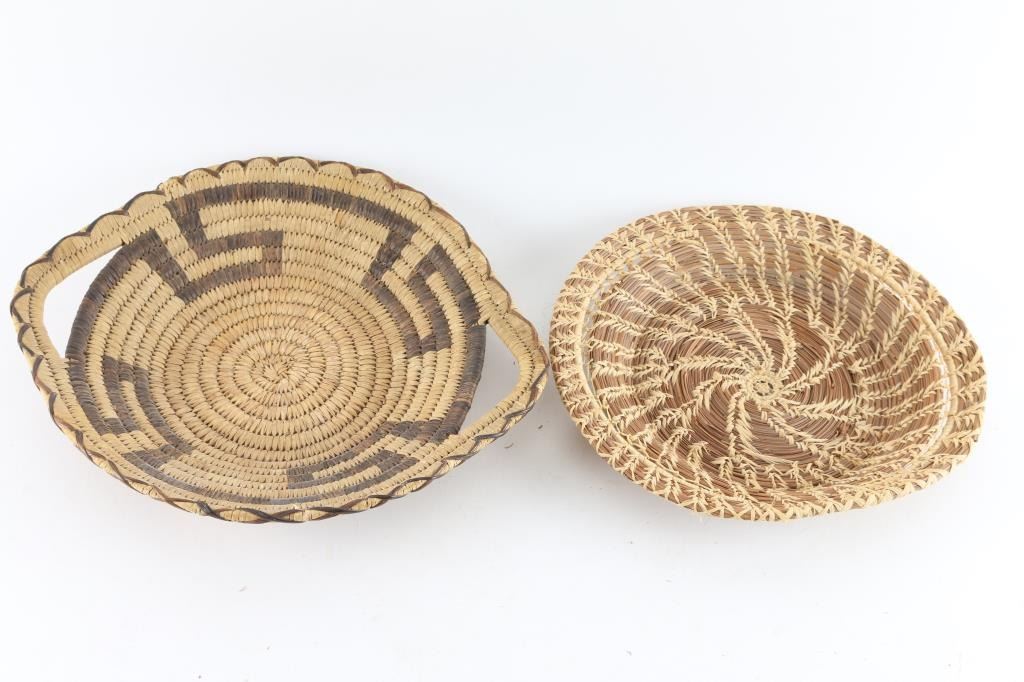 (1)Papago Handled Basket overall very good measures 12" in diameter. (1) Pine Needle basket measures 10" Diameter