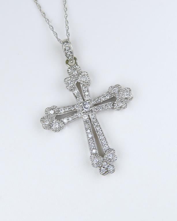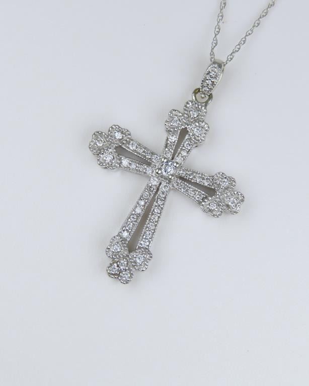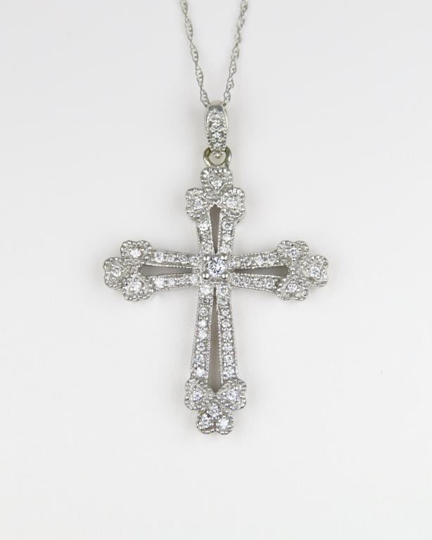 Stunning Vintage Design Diamond cross pendant pave set with over 60 round Diamonds weighing approx. 0.60 carats with F-G colors and VS clarity set in 14 karat white gold vintage design setting.