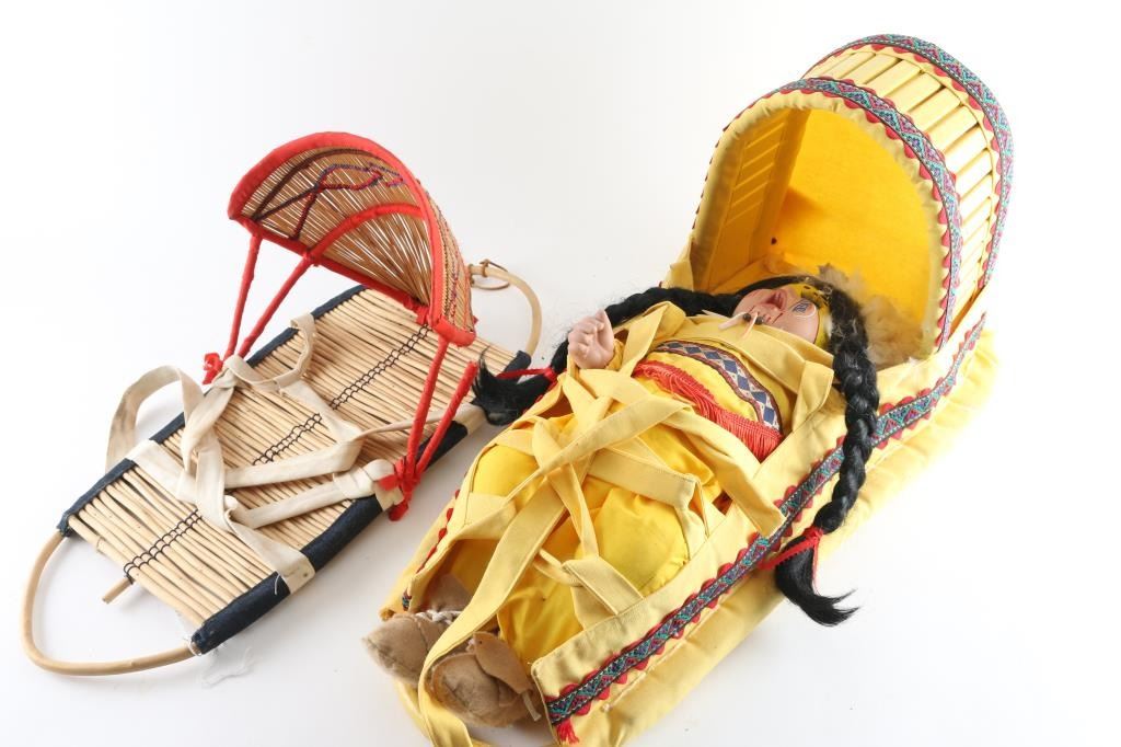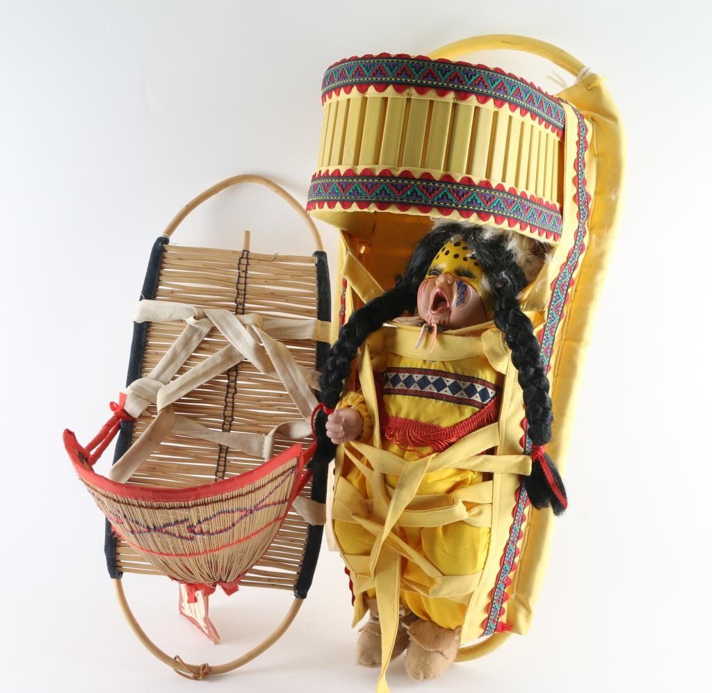 1.) By artist "Christy Gibbs" wood back and north west coast design with "Red, white and blue motif" loss to one of stick post to shader(2.) Unsigned baby cradle with yellow cloth and stitched embroidered indian design on side. In good condition, with doll included with minor loss to deer skin headdress.