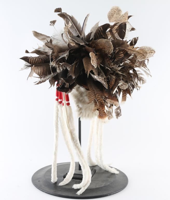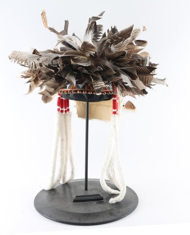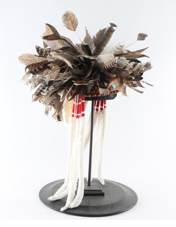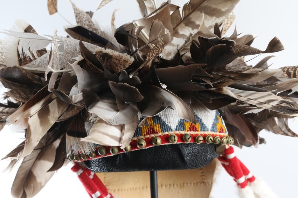 Beaded band with bells, dangling white fur tassels, top is decorated with turkey feathers.
