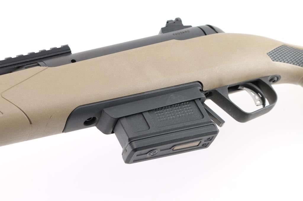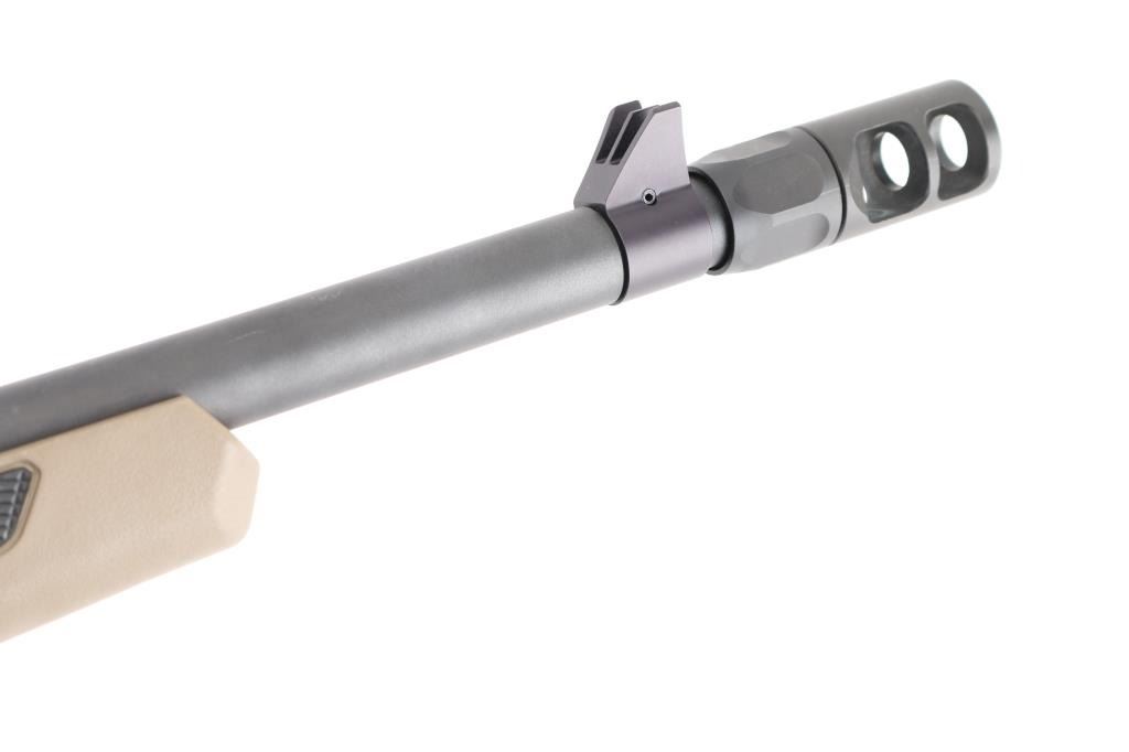Bolt action rifle chambered in .450 Bushmaster, features matte black finish, Flat Dark Earth synthetic stock with black checkered pistol grip & black checkered forearm panels, 16.5" tapered barrel with a 2" muzzle brake, pinned and protected blade front sight and adjustable peep rear sight, manual tang safety, sling studs, 6.5" Picatinny rail section on top of receiver and top of forend, Accu-trigger, 4 rd Magpul magazine. Bore is excellent but a little dirty. Action is smooth and tight. Comes with (1) 4 rd Magpul magazine. Condition is NRA Excellent. *** Modern Firearm ***