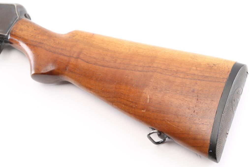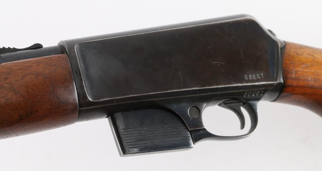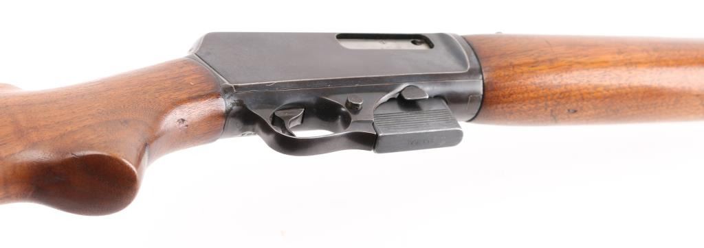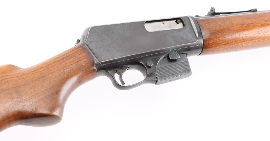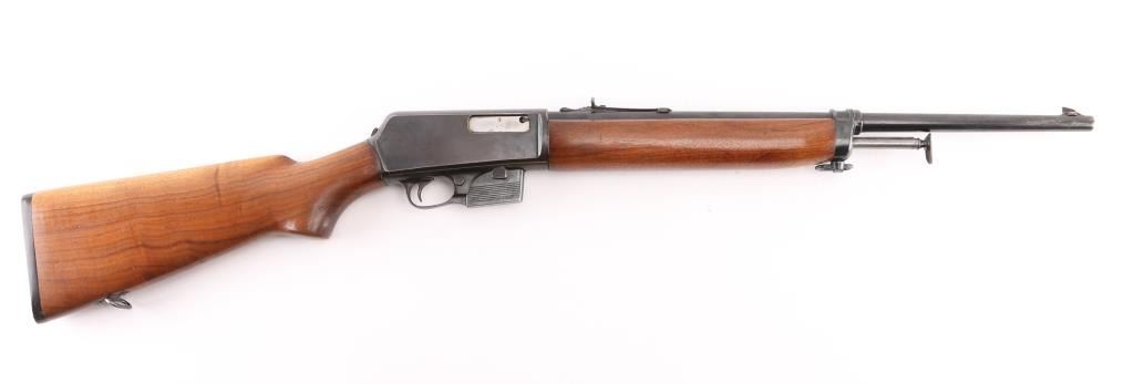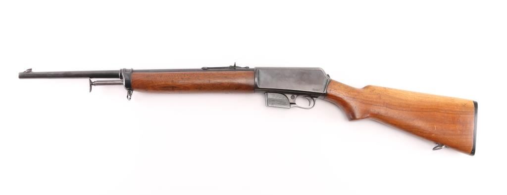 Post-war magazine fed semi-automatic police rifle chambered in .351 Winchester Self-Loading, manufactured circa 1952. Features a blued finish, 20" round barrel, dovetailed blade front sight, semi-buckhorn adjustable rear sporting sight, 5 round detachable magazine, take-down receiver, smooth trigger, push button safety, sling swivels, smooth walnut beavertail forend and pistol grip shoulder stock, composition or hard rubber buttplate (checkered, marked with fancy "AG Co" monogram). Serial numbers match on trigger guard and receiver. Bore is very good condition. Rifle retains approximately 80% re-blued finish, with scattered small pits, handling marks, scratches & losses. Wood stocks are very good, lightly sanded & varnished, with small dents, some oil staining next to receiver. Includes one very good condition magazine. Condition is near NRA Very Good as refinished *** C&R Firearm ***