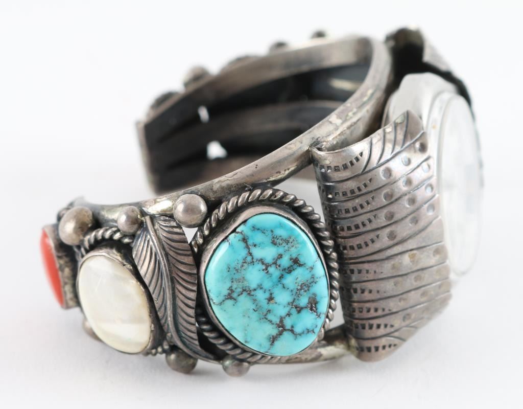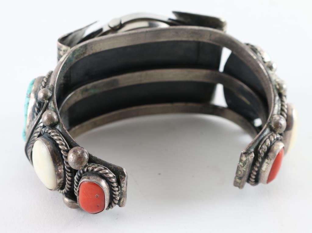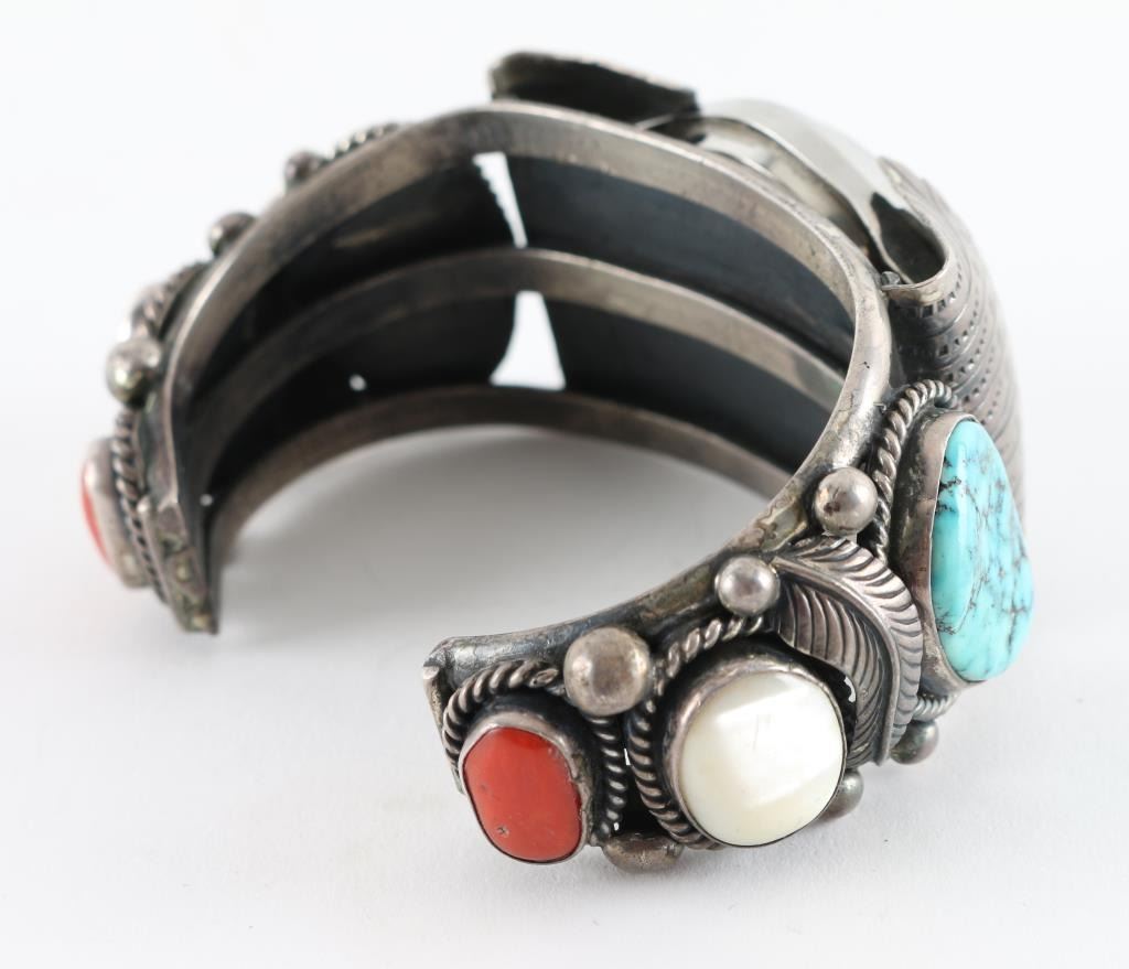 heavy sterling with turquoise, mother of pearl and coral side stones. Unsigned very high quality.