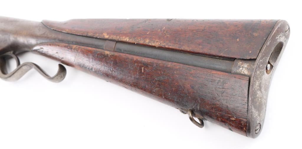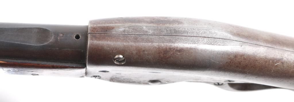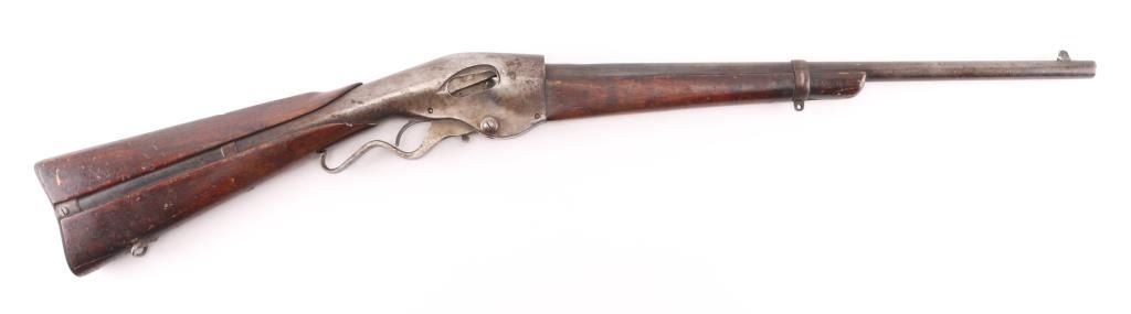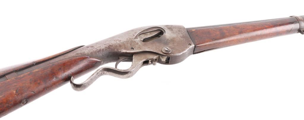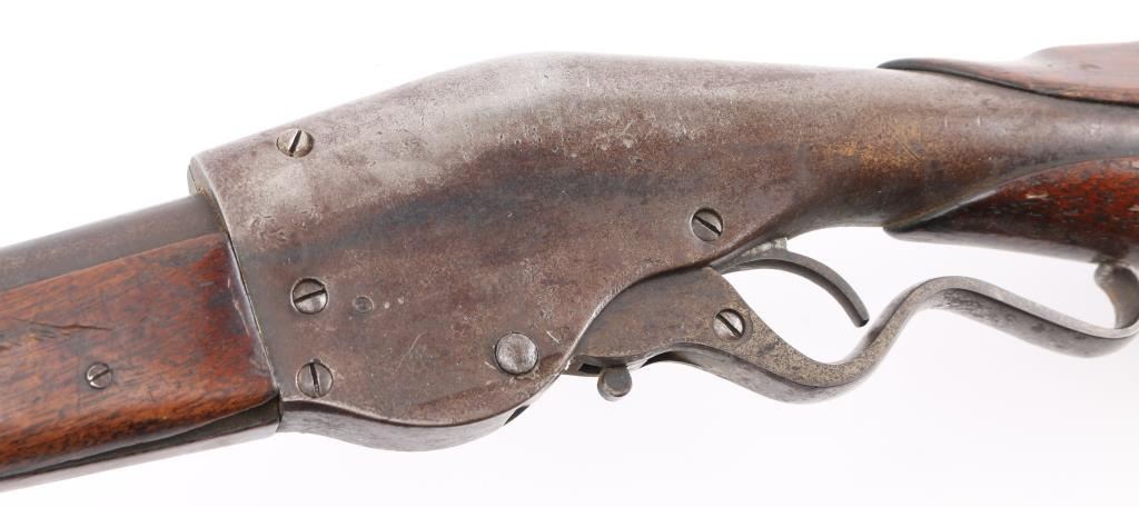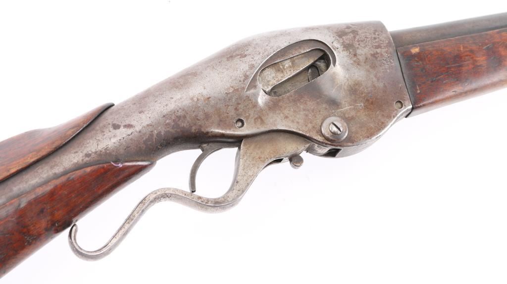 'New Model' .22 inch barrel refer to Flayderman 13-017, fair to good overall condition with rear sight, hammer and possibly other small parts missing. Traces of blue going to brown. Major split in the forend and otherwise be fair to good with normal imperfections and age. Action works well and clear address on the barrel. NRA Fair Antique Firearm.
