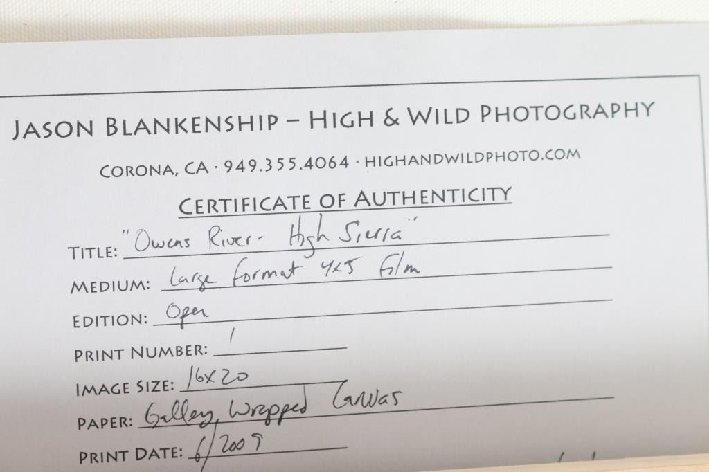 By "Jason Blankenship" entitled "Owens River" large format 4x5 film. 1 of 1 edition signed lower right. Image size measures 16x20. Printed in 2009, beautifully photo, in mint condition. Unframed. Also included is a photograph of indian in Kachina mask, signed "2" unframed measures 10x7 .