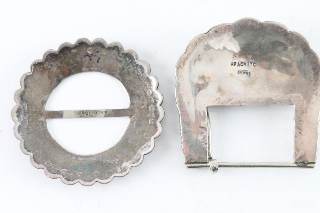 Including a mens sterling sliver and turquoise buckle, maker marked "APACHITO" the second belt buckle is ladies loop style, all sterling with stamp design, maker marked "RJ"