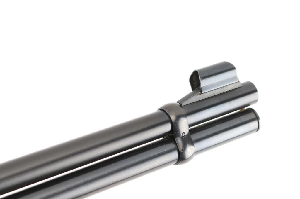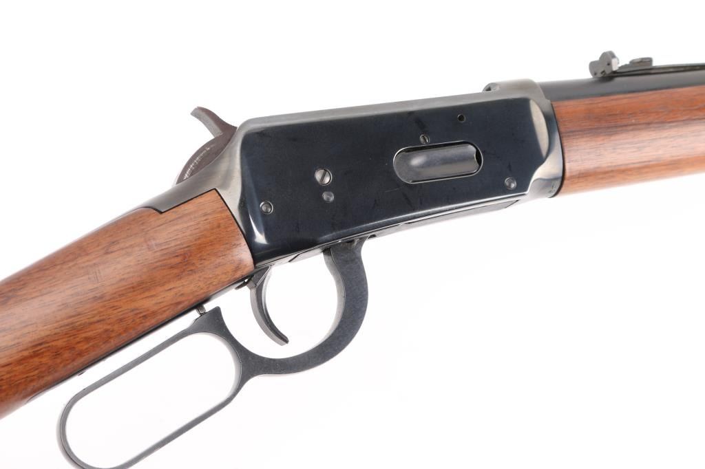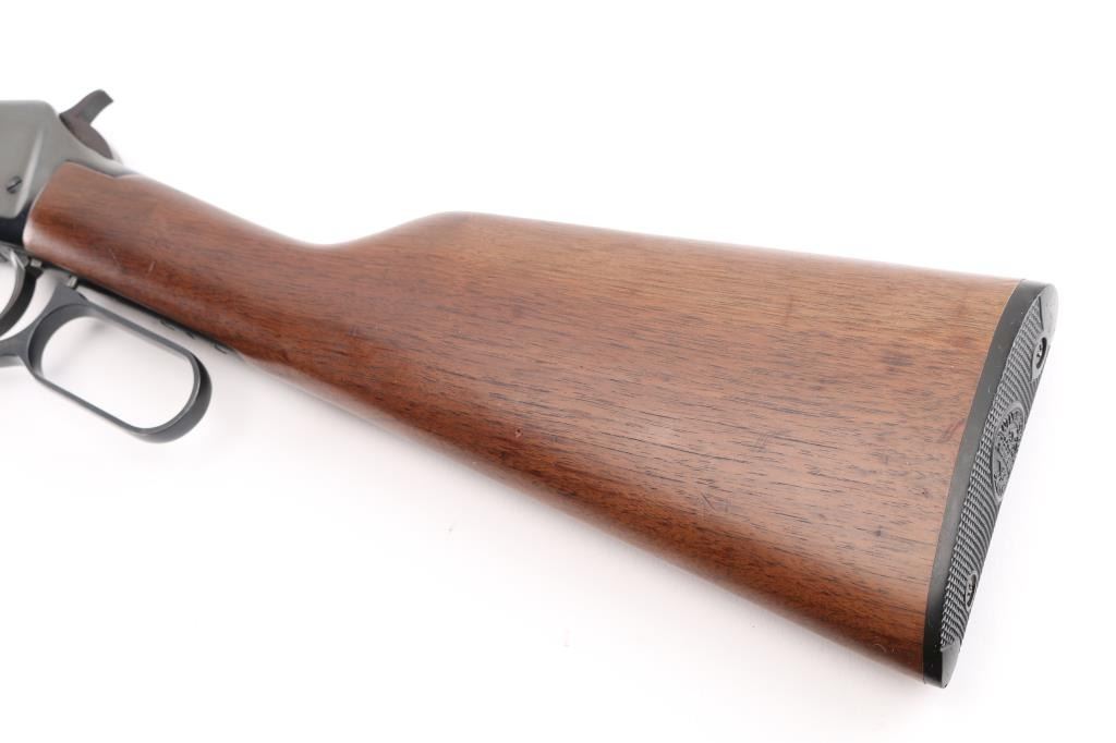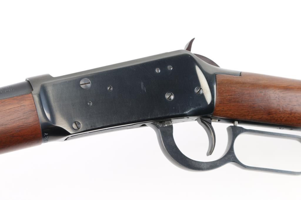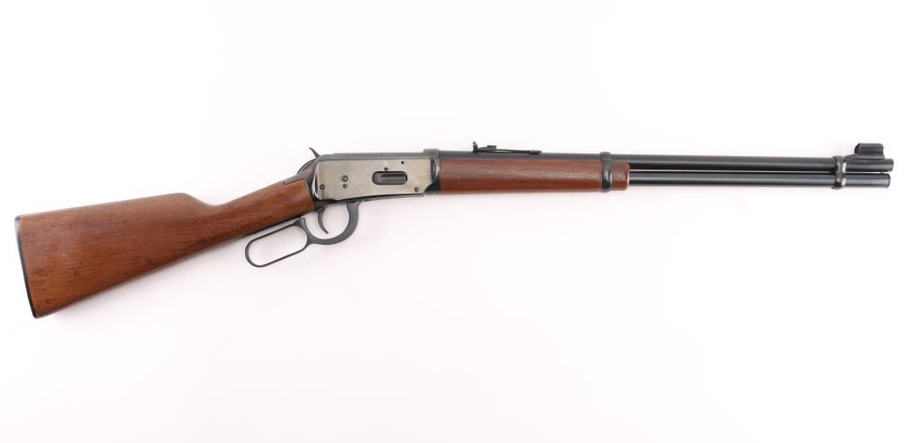 Lever action 'Eastern' carbine chambered for 30-30 WIN ammunition, circa 1955. It features a 20" blued round barrel, blued receiver, hooded front blade/bead sight, semi-buckhorn rear sight, smooth trigger, serrated hammer spur, two barrel bands, and two piece wood stocks with factory black butt plate. Blue finish is excellent, with some very minor scratches. The wood stocks are excellent, action is smooth Bore is excellent/bright. LOP is 13.50". Condition is NRA Excellent. Modern Firearm.