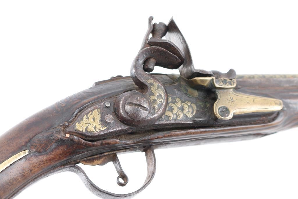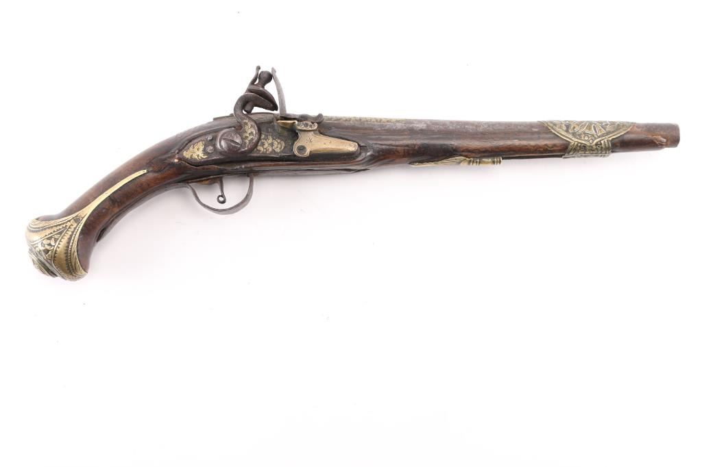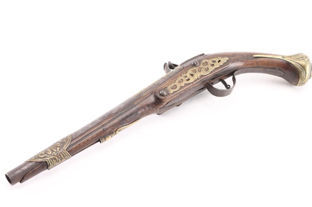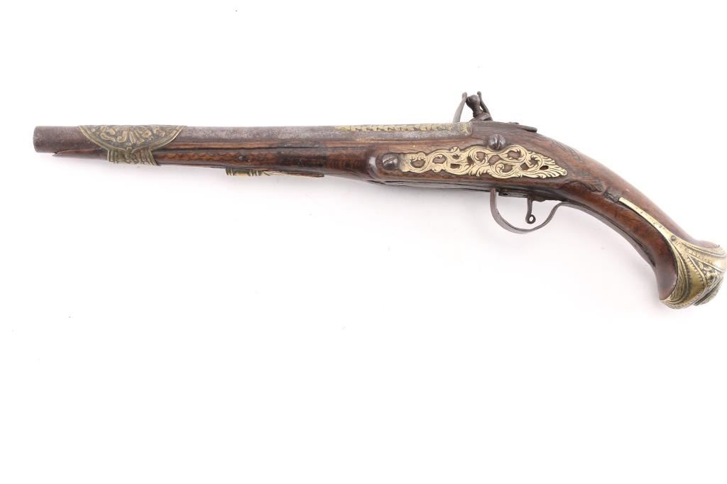 Approximately 52-caliber, 11-inch round to round barrel, scroll & floral brass furniture with brass barrel band decoration. brass inlayed embellished motifs in the barrel & lock. Detailed brass escutcheon on left stock. Lock plate & hammer have detailed scrollwork originally from European flintlock, possibly French. Ram rod not present. Overall length: 18-inches. Note: These types of pistols [or pattern] are similar to those used for the Trade, circa 1780-1810 Many European features present to this pistol. Two-cock action works well. there is slight wood loss near the muzzle, bottom triggerguard tang, & under the lock plate, wood is overall good/sound. Trigger plate is a little loose. NRA Condition-Very Good as Antique Firearm.