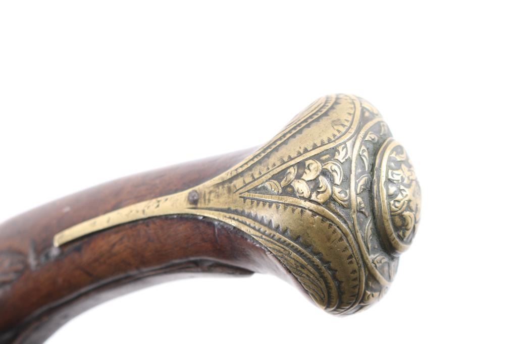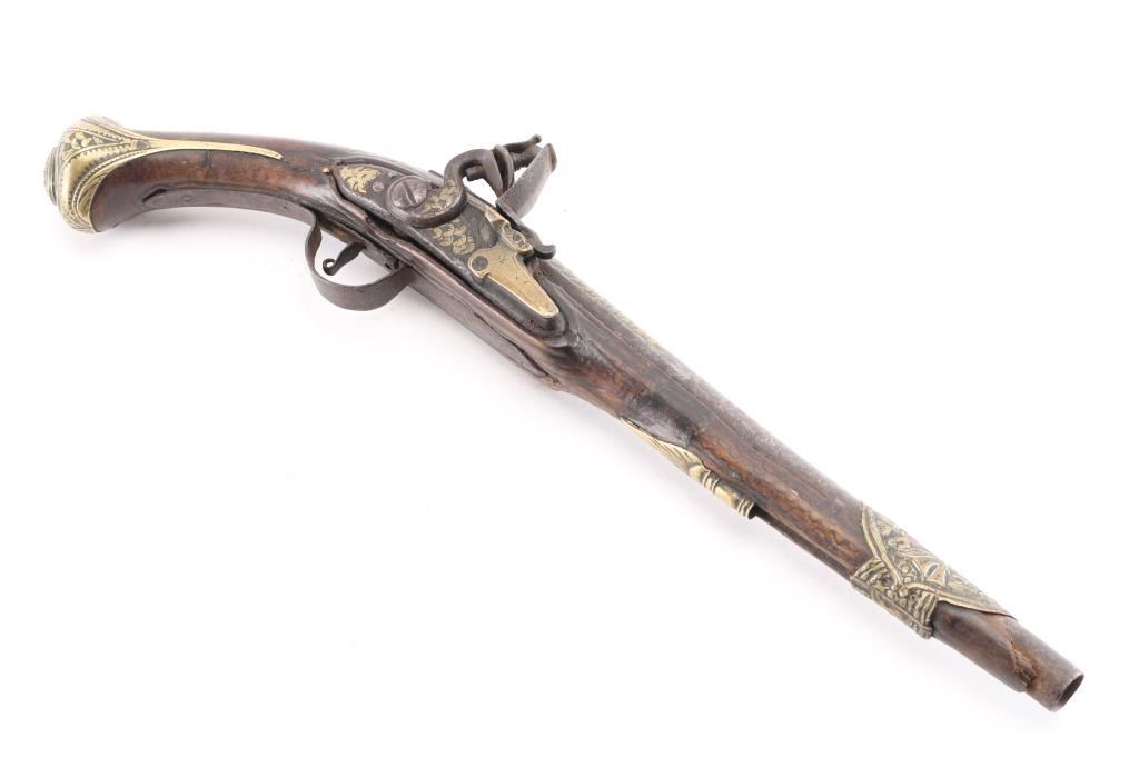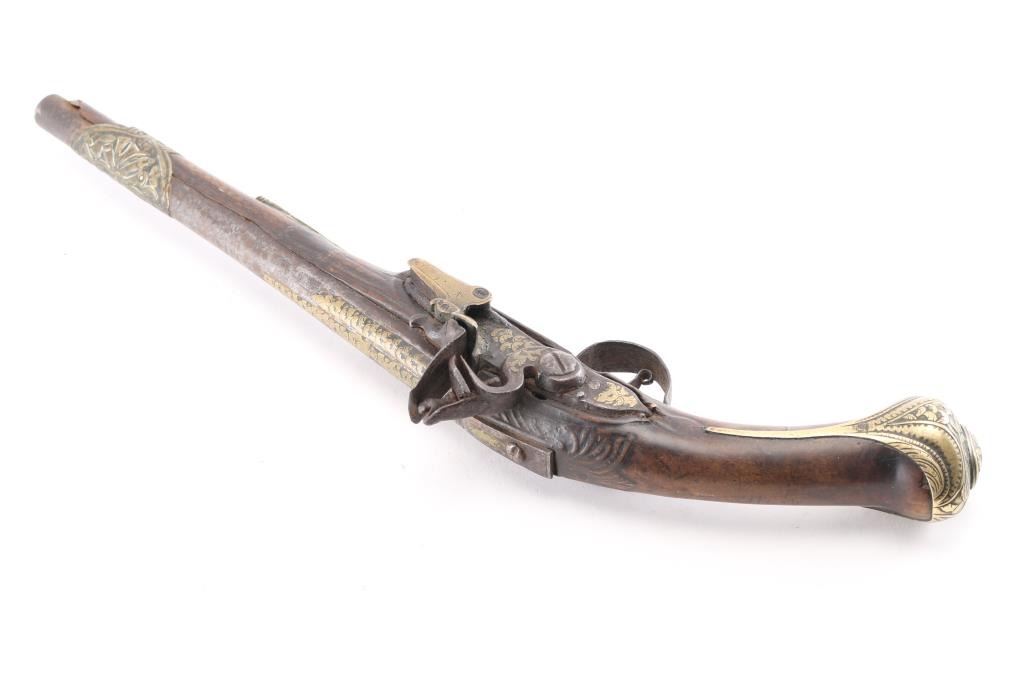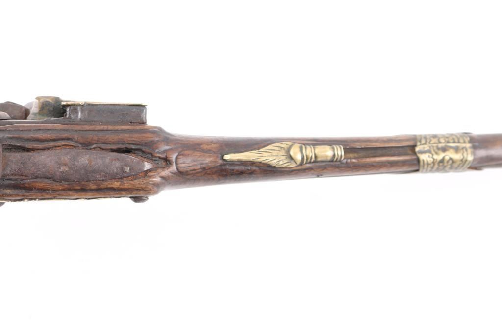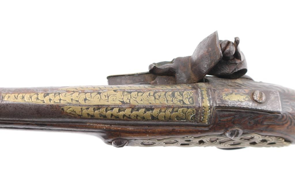 Approximately 52-caliber, 11-inch round to round barrel, scroll & floral brass furniture with brass barrel band decoration. brass inlayed embellished motifs in the barrel & lock. Detailed brass escutcheon on left stock. Lock plate & hammer have detailed scrollwork originally from European flintlock, possibly French. Ram rod not present. Overall length: 18-inches. Note: These types of pistols [or pattern] are similar to those used for the Trade, circa 1780-1810 Many European features present to this pistol. Two-cock action works well. there is slight wood loss near the muzzle, bottom triggerguard tang, & under the lock plate, wood is overall good/sound. Trigger plate is a little loose. NRA Condition-Very Good as Antique Firearm.