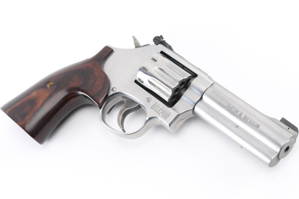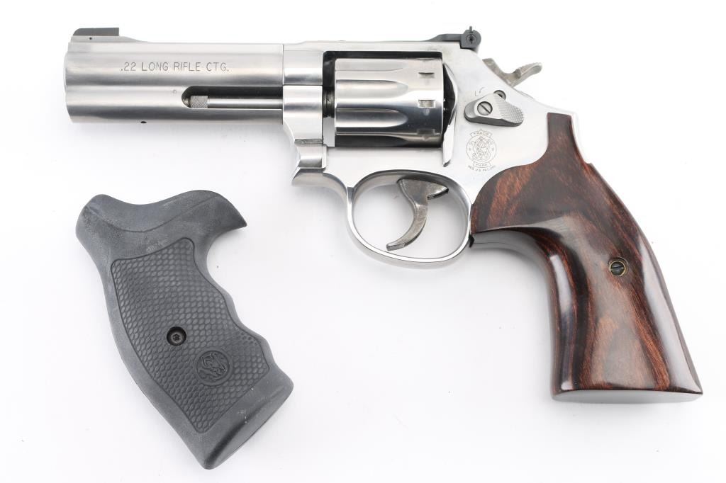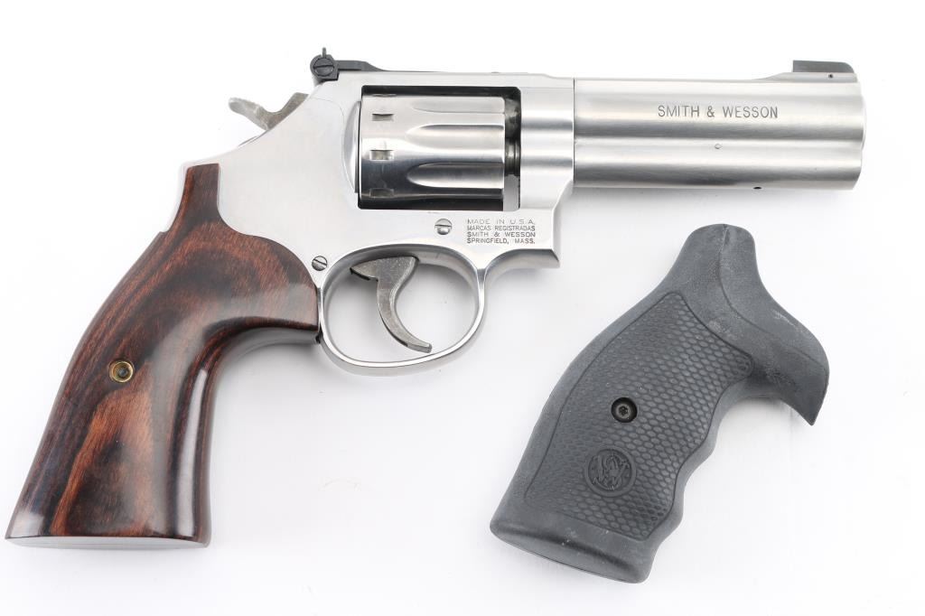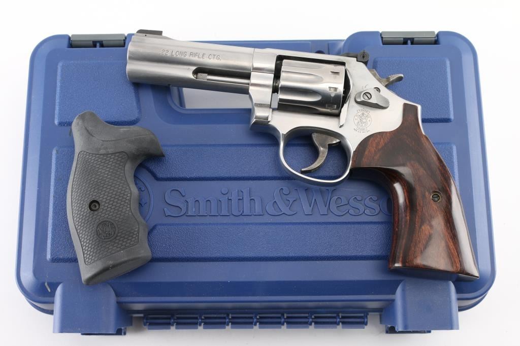 American made, stainless steel, 10 shot revolver. It features a 4" barrel with full underlug, raised front sight, adjustable rear sight, fluted cylinder, wide smooth trigger, wide knurled hammer spur with smooth rosewood target grips. The S&W black Monogrip finger groove grips are included. Bore looks great. Metal finish looks very good with minor scratches. Grips look great. Overall this gun shows very little signs of wear or handling. Comes with original hard case, lock, keys for internal safety, and owners manual. Condition is NRA Very Good. Modern Firearm.