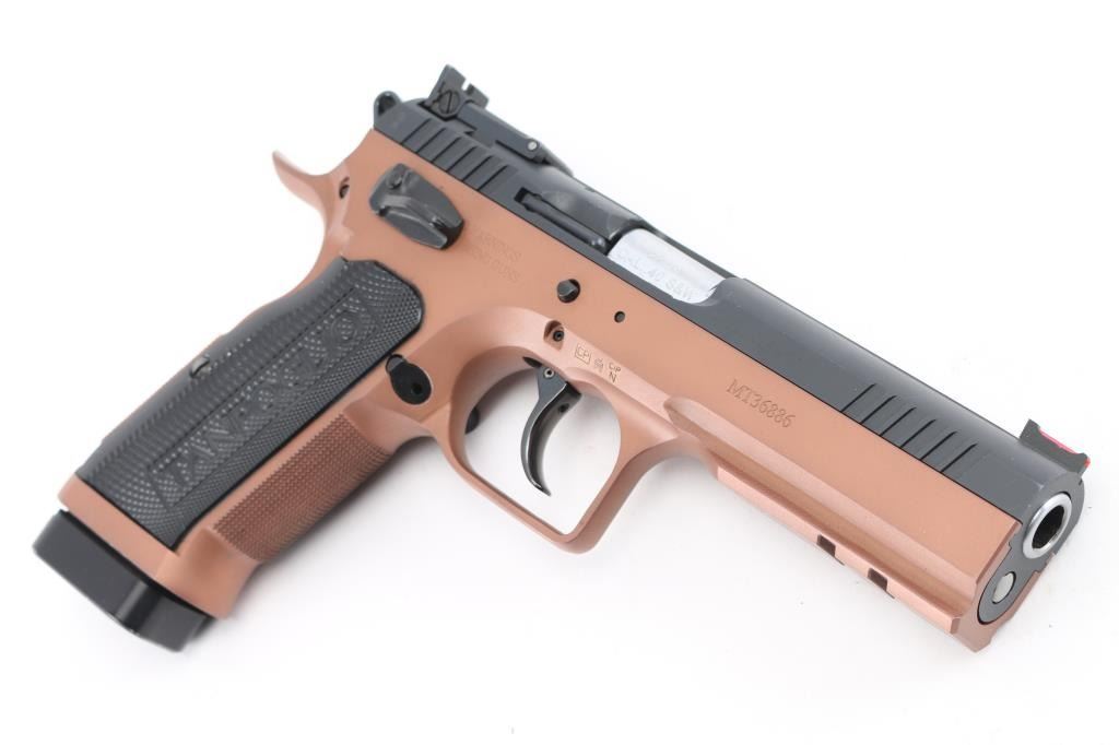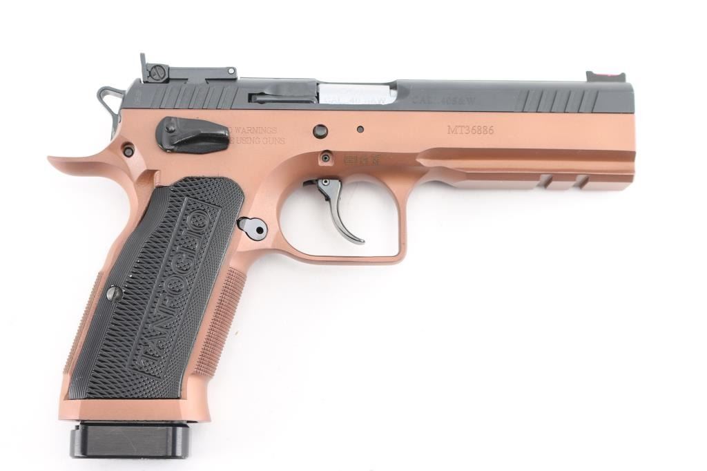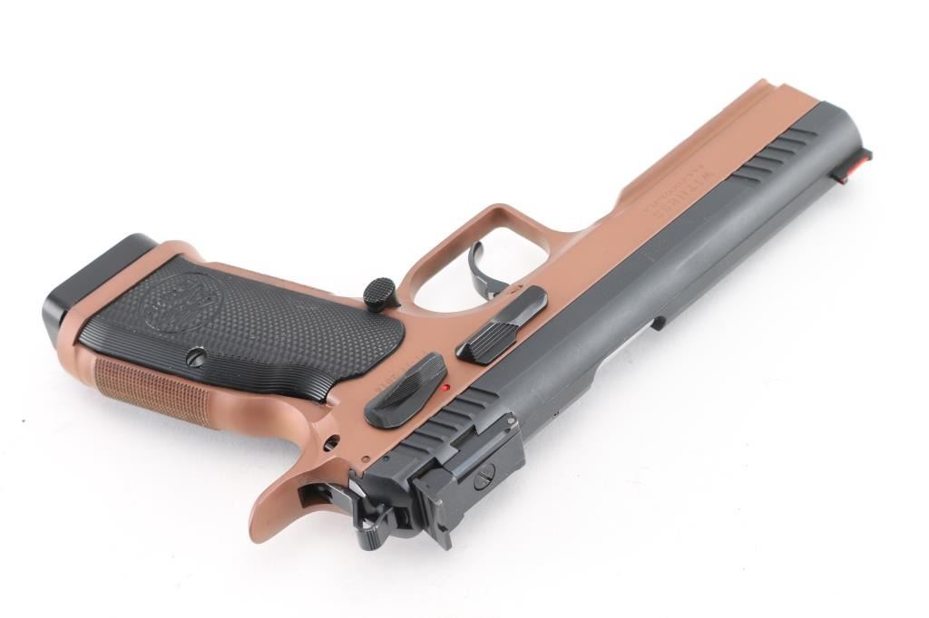 High Quality Italian made semiautomatic pistol imported by EAA, Cocoa FL. Features matte black slide, semi-gloss black controls, metallic copper color ceramic coating finished frame, checkered black aluminum grip panels, 4.75" barrel, red fiber optic front sight, fully adjustable rear sight, double action trigger, ambidextrous frame mounted safety, extended push button magazine release, accessory rail on dust cover. Bore is pristine. Overall condition is like new with few handling marks. Includes factory case, cleaning kit, assorted parts, four magazines, manual. Condition is NRA Excellent - like new *** Modern Firearm ***