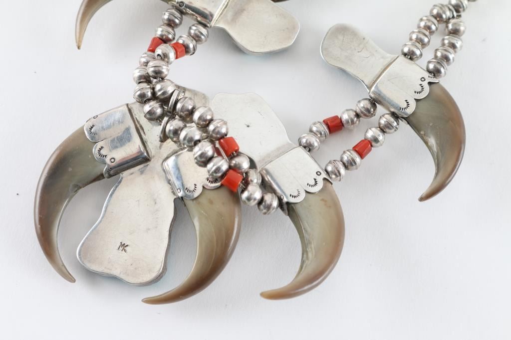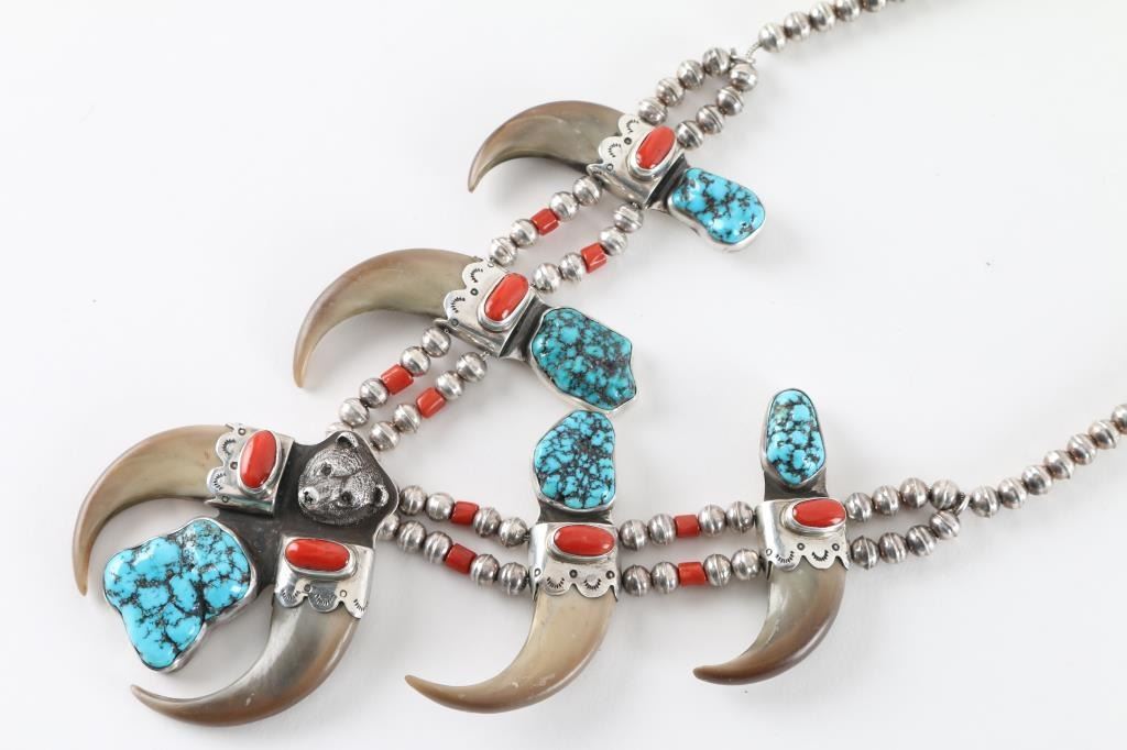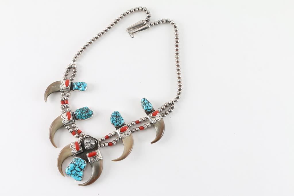 Lot 620 Navajo Bear Claw, Turquoise, and Coral Necklace