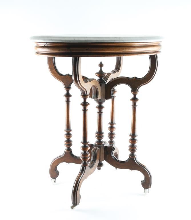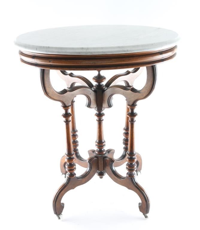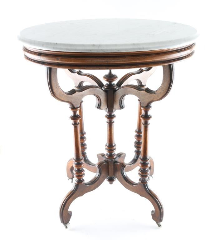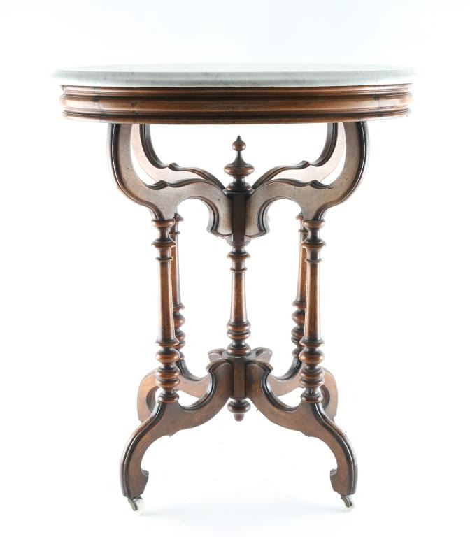 Dark wood base with white marble top, measures 25x30. In good condition.