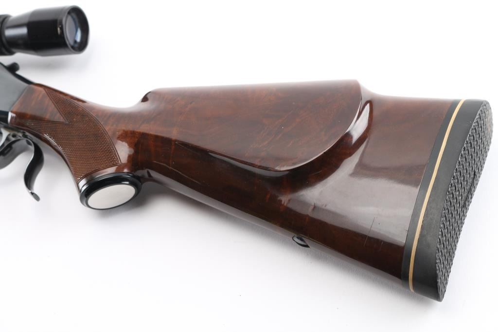 Japanese made single shot rifle imported by Browning Arms, Morgan UT, circa 1973. Lever action falling block action. Features walnut stock & handguard with urethane finish, curved wrist, right handed cheek piece, solid rubber butt pad, blued finish, 26" medium profile octagon barrel, no sights, 2 piece Browning scope mounts, slot type sling swivels, checkered panels at wrist & forend. Bore is very good condition. Retains 95% finish with handling marks, area of thinning finish on barrel, other minor blemishes. Wood is excellent. Mounts a very good condition Browning 2-7x scope with fine crosshairs, clear view, some scrapes to outside finish. Condition is near NRA Excellent *** C&R Firearm ***