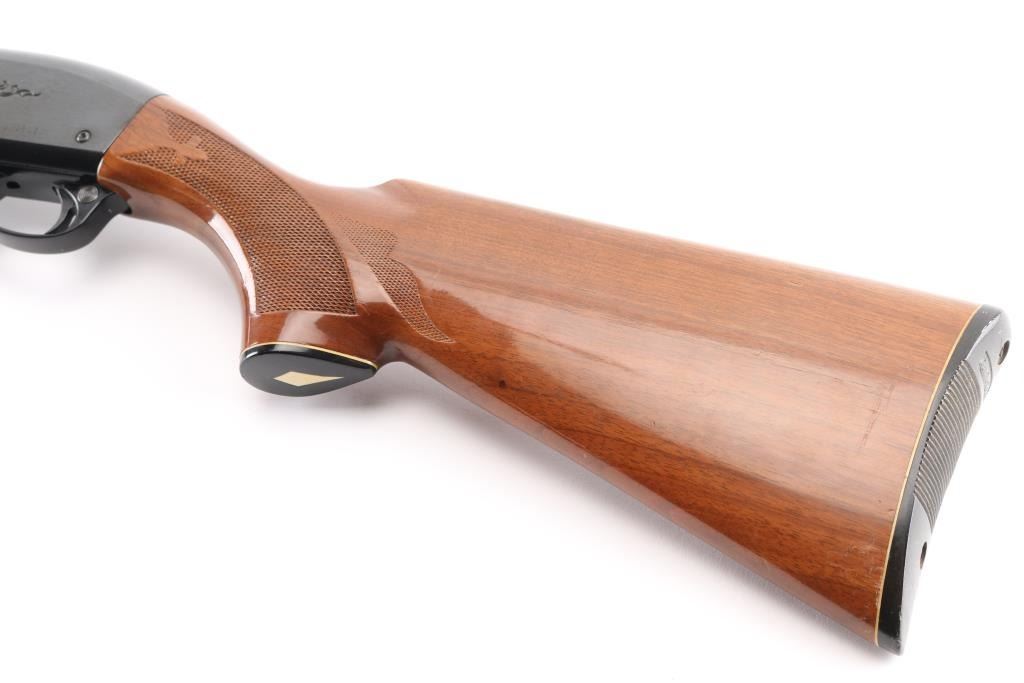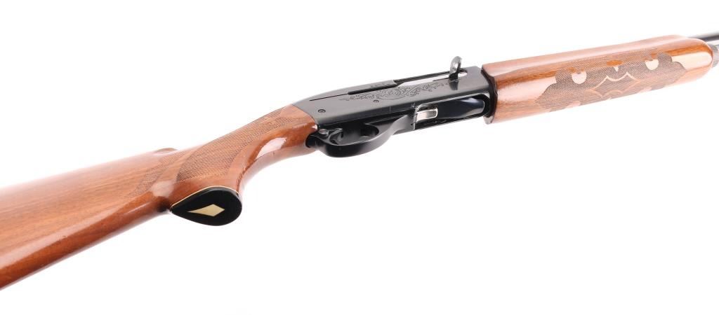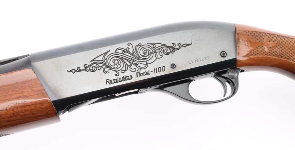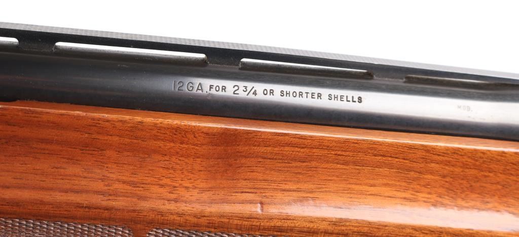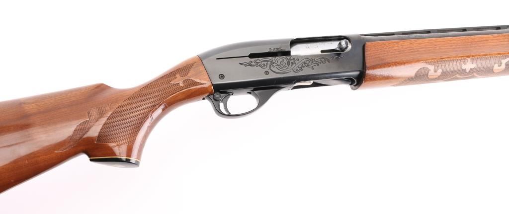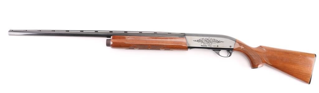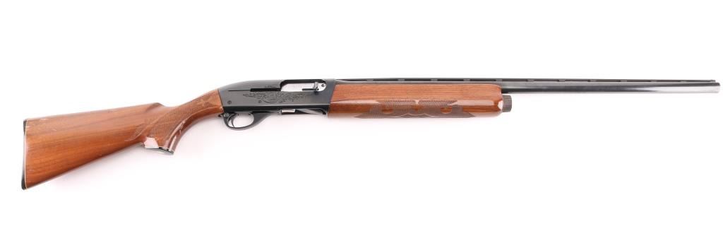 12 Ga. Shotgun. Semi-Automatic. Gas-Operated. Produced 1963-Present. 28" barrel with vented rib. sighting bead. 2 3/4" chamber. Mod. choke. 4-rd tube magazine. Push button safety. Bottom loading, side ejecting. Floral scroll designs on receiver. Bore is excellent. Action is crisp/tight. Blued finish is excellent. Checkered walnut stock and forearm are very good with very minor scratches. Black plastic Remington buttplate. NRA Condition-Excellent. Modern Firearm.