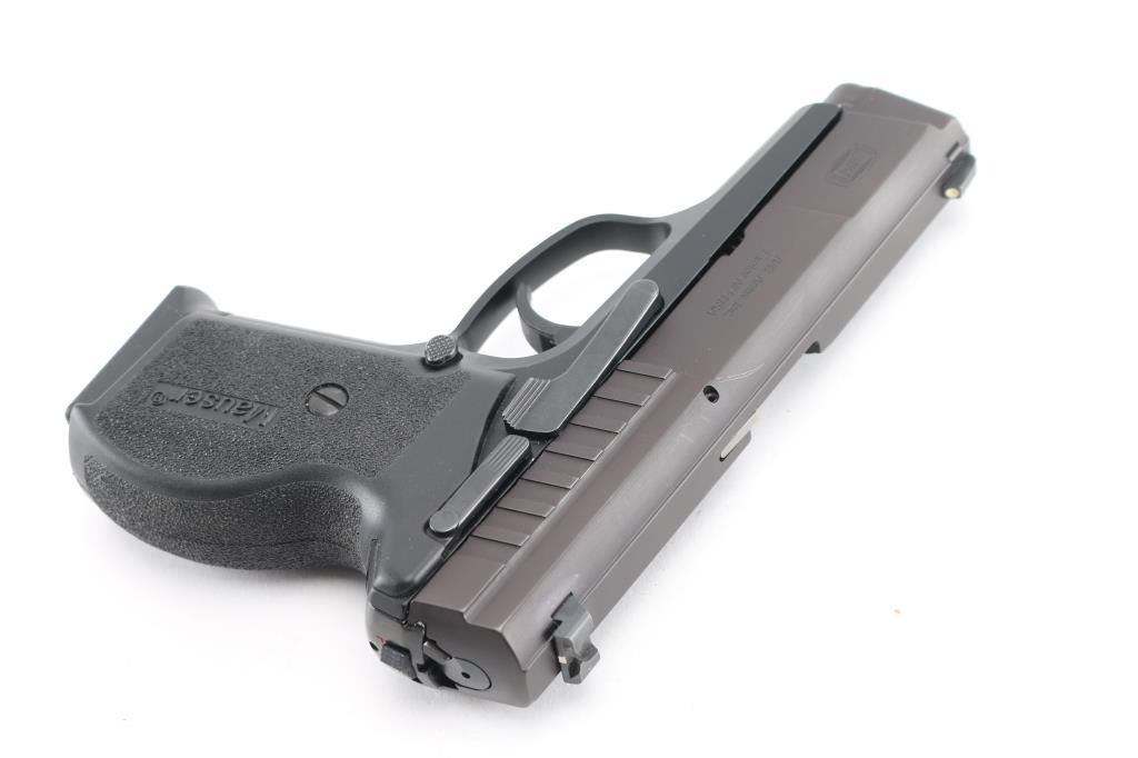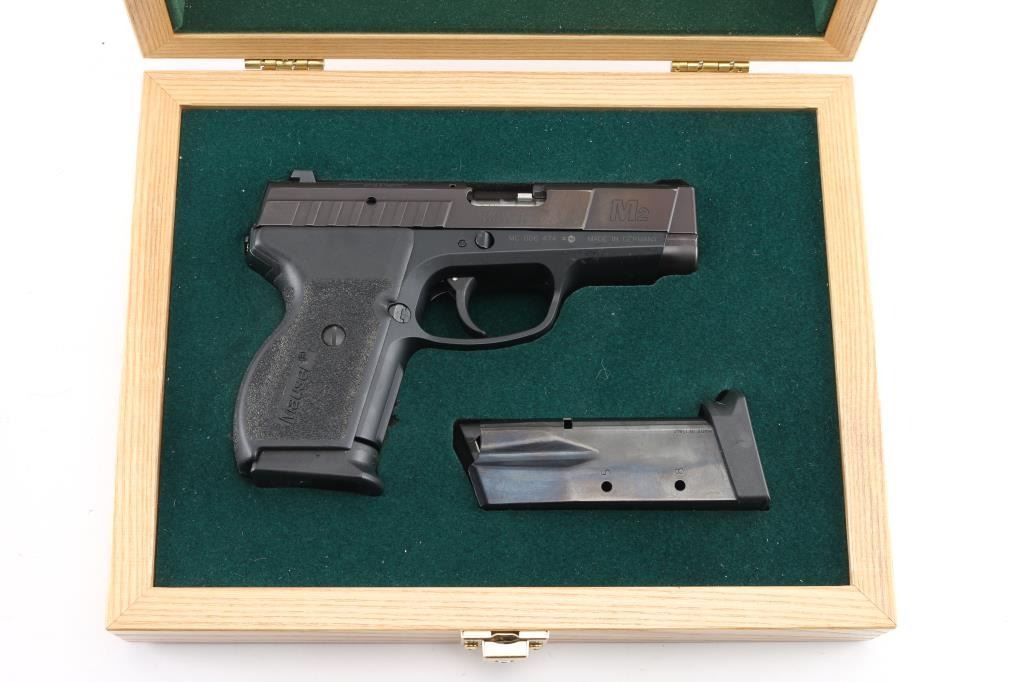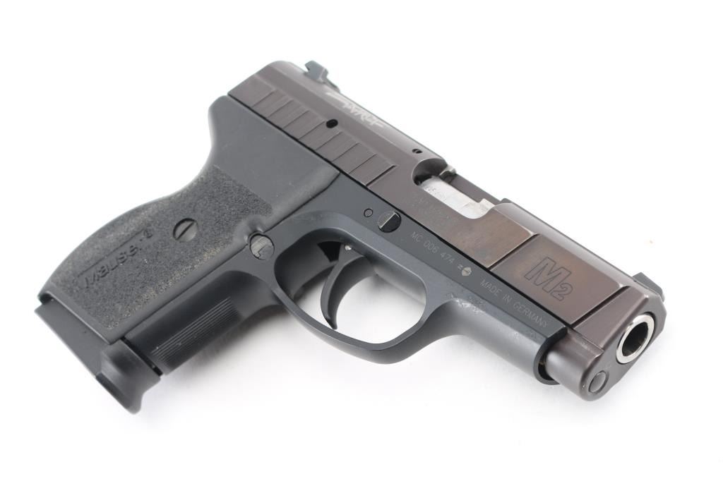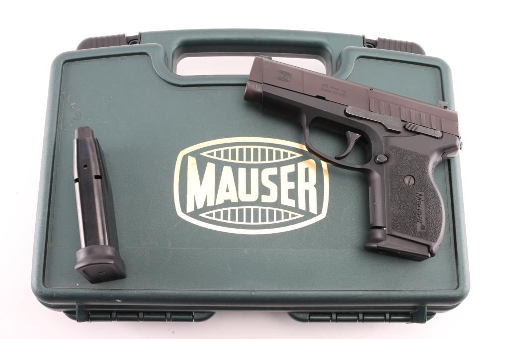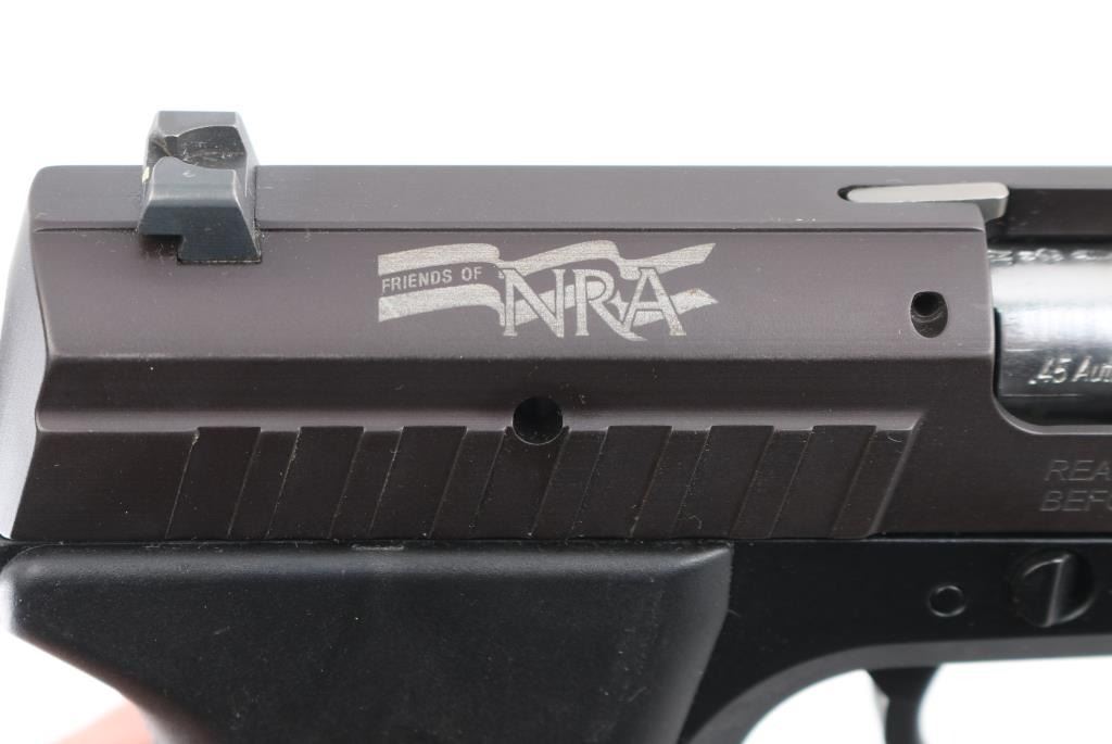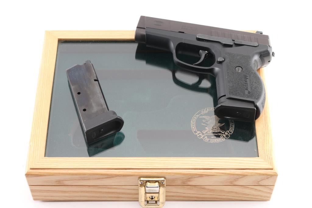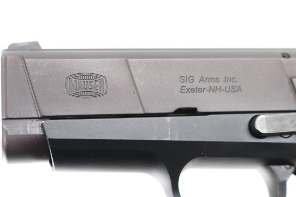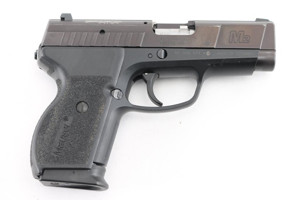 DAO semi-automatic pistol in 45 ACP. Manufactured & Imported by SigArms. Features a 3.5" barrel, White dot blade front sight, white line rear box sight, smooth trigger, safety on rear of frame and stippled black plastic grips. It uses short barrel recoil with rotating barrel locking. Mauser M2 features numerous safeties: automatic firing pin safety, trigger bar disconnector, loaded chamber indicator. The manual safety is located in unusual place - at the rear side of the frame, under the place where the hammer usually may be found. Also, M2 features aluminum alloy frame with steel serrated slide and replaceable slide rails. In very good condition overall with light edge wear. "Friends of NRA" logo added to top right of slide Includes original box, two magazines, wood display box with National Rifle Association logo etched into the glass lid top. Condition is near NRA Excellent *** Modern Firearm ***