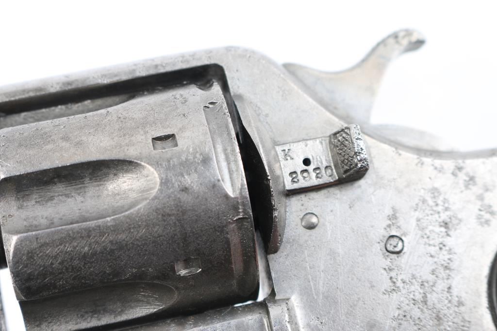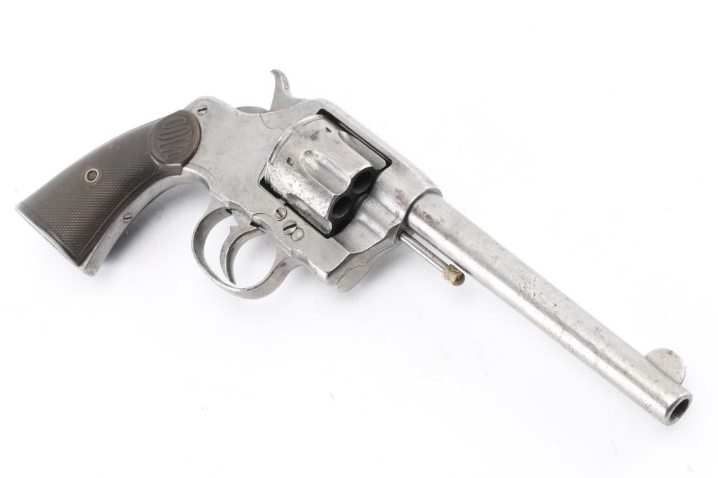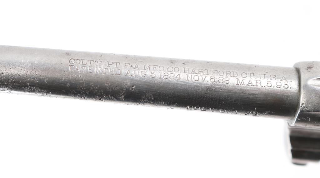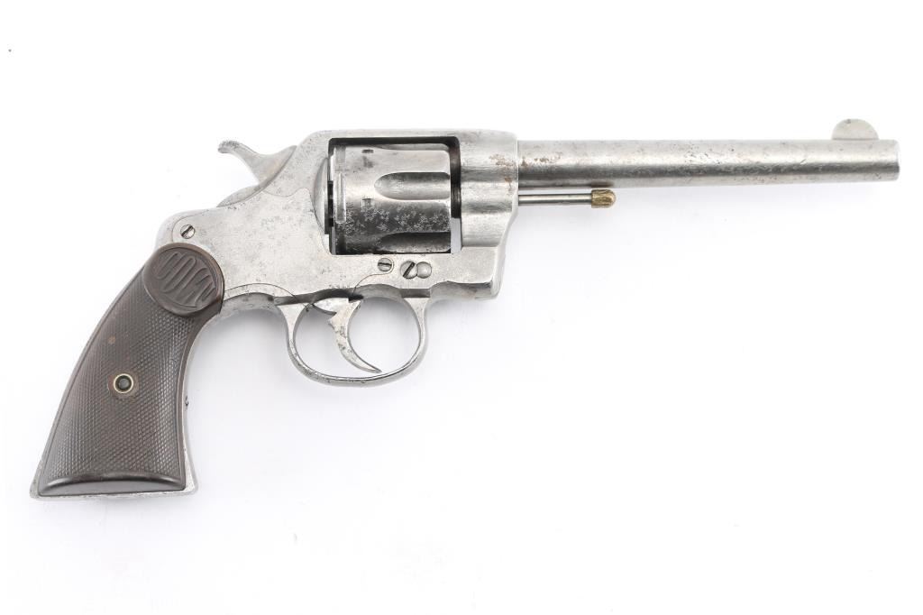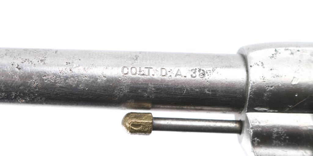 US Military revolver made circa 1901, features 6" barrel, fixed sights, swing-out 6 shot cylinder, single/double action. Replacement Colt logo brown checkered polymer grips are a bit too small, frame shows proud around toe & heel. Bore is fair to good condition with visible pitting and minor roughness, good visible rifling. Cylinder charge holes are fair to good with little roughness. All finish is removed, showing bare metal, light pitting throughout. Grips are very good condition with small missing chip from bottom of left panel. Action does not always operate properly, often fails to rotate cylinder. Markings include "RAC" on frame, "US ARMY MODEL 1896" on bottom of frame, "K 2920" on cylinder latch, "Colt DA 38" and two line Colt address/patents on barrel. Markings are generally readable, partially obscured barrel markings and mostly eroded "US" on butt due to light pitting. Ejector rod head is a brass replacement part. Condition is NRA Fair (needs repair) *** C&R Firearm ***