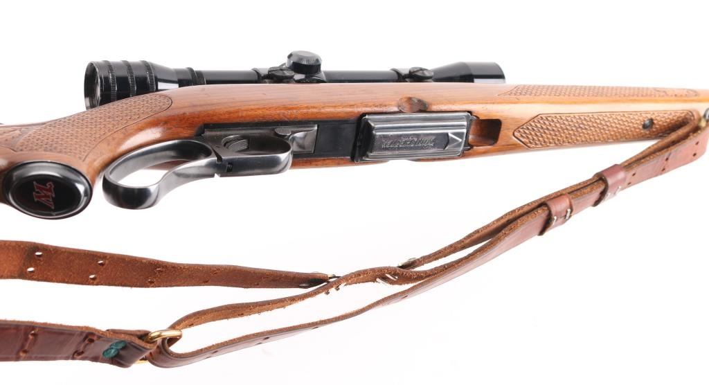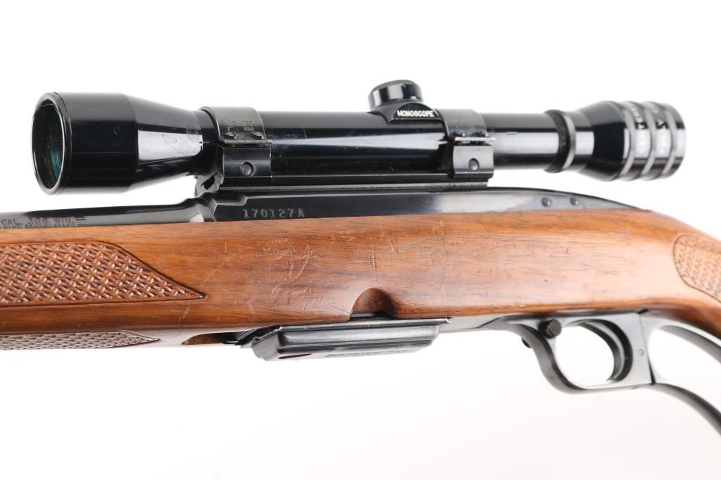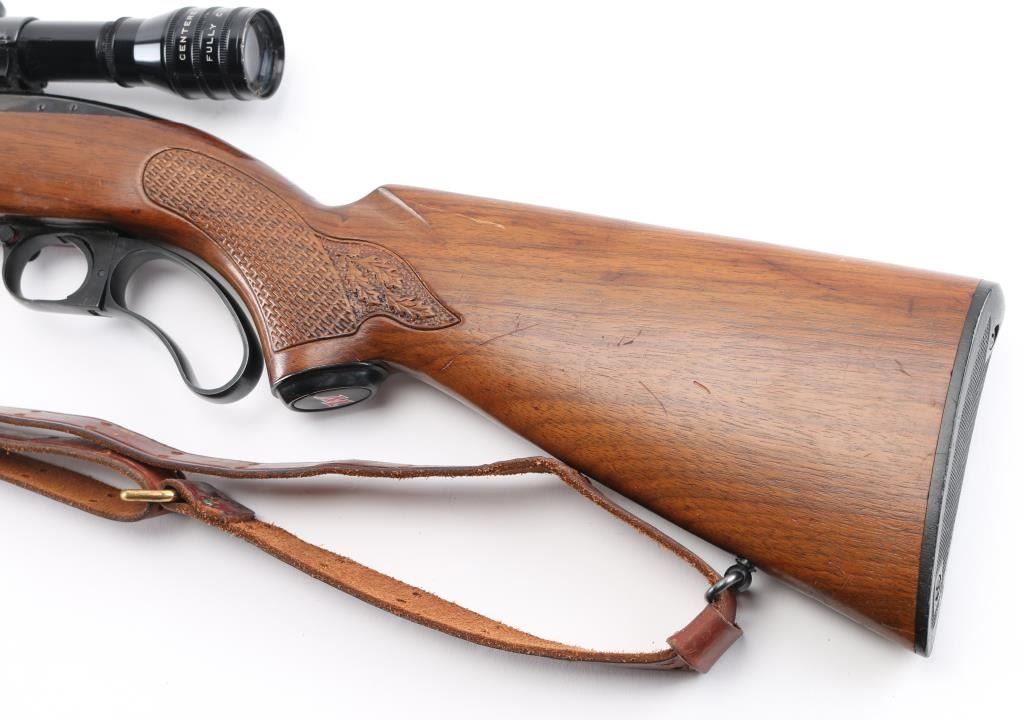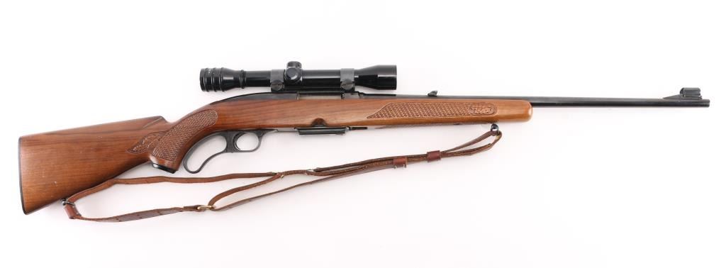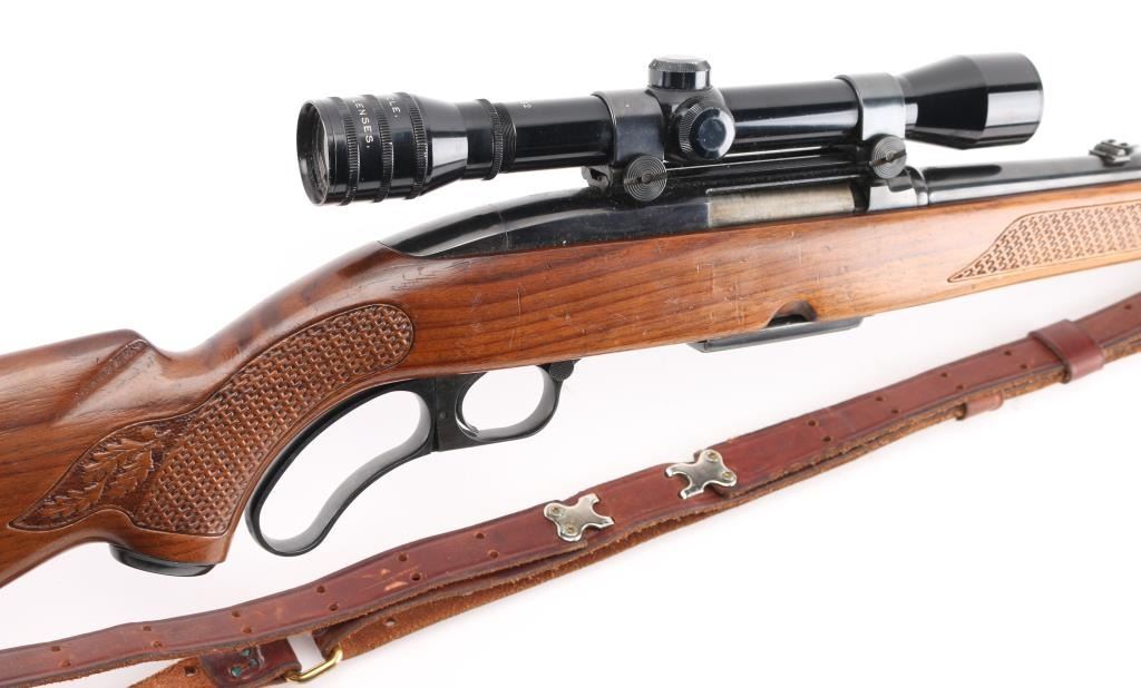 Lever action rifle manufactured circa 1966. Features blued finish, wood stock with curved grip, impressed basket weave pattern textured panels at wrist & forend, checkered black polymer buttplate, 22" barrel, ramped blade front sight with hood, folding adjustable rear sight, one piece Weaver base & rings, vintage Monoscope 4x32mm scope, accepts detachable box magazine (one magazine provided), manual safety, sling swivels. Bore is very good condition. Retains 85% blue, with edge losses & handling marks. Wood is very good condition with small dents & scratches. Scope is very good condition, clear view, fine crosshair. Includes good condition leather sling. Condition is NRA Very Good+ *** C&R Firearm ***