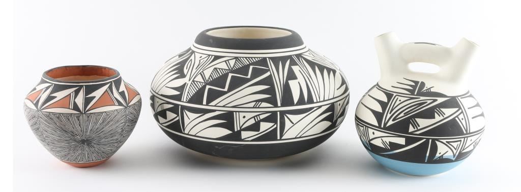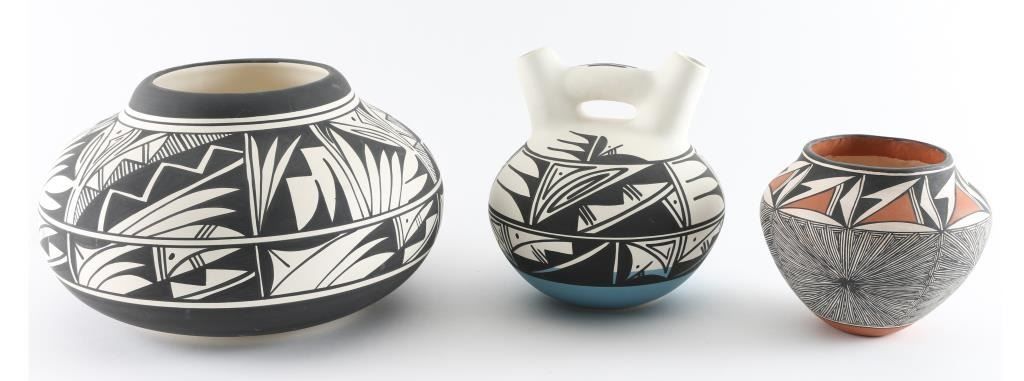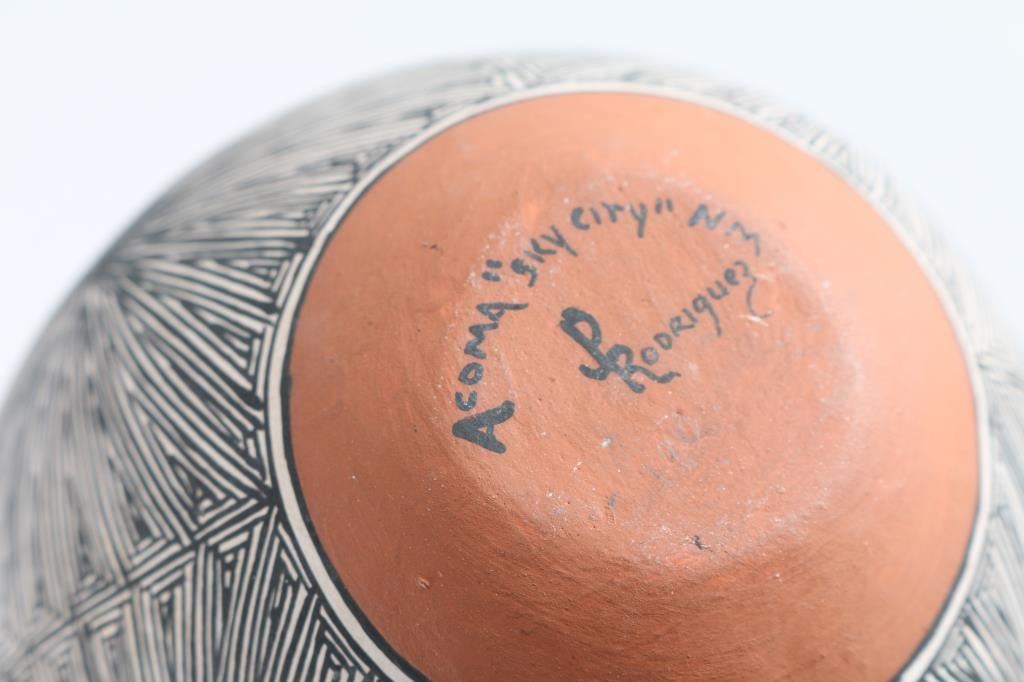 Includes a Acoma pot, by "P. Rodriguiz" measures 5x6. Large B&W pot signed in base "Talk-unp" (3.) B&W wedding vessel marked "Ump Pidllia"