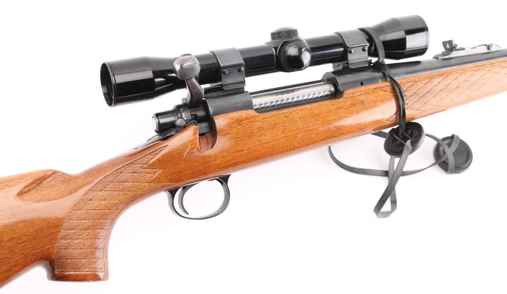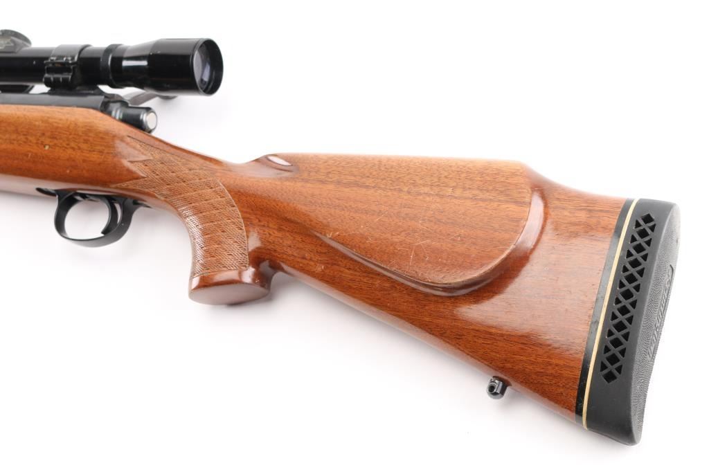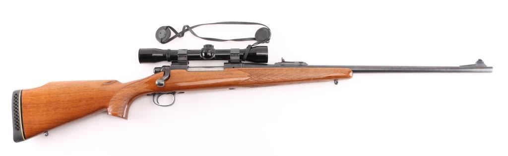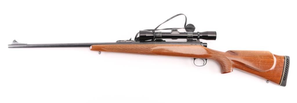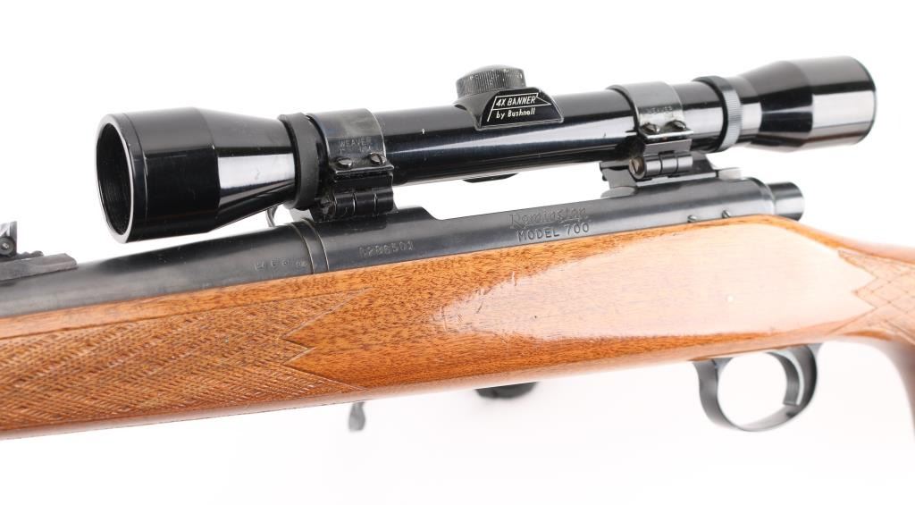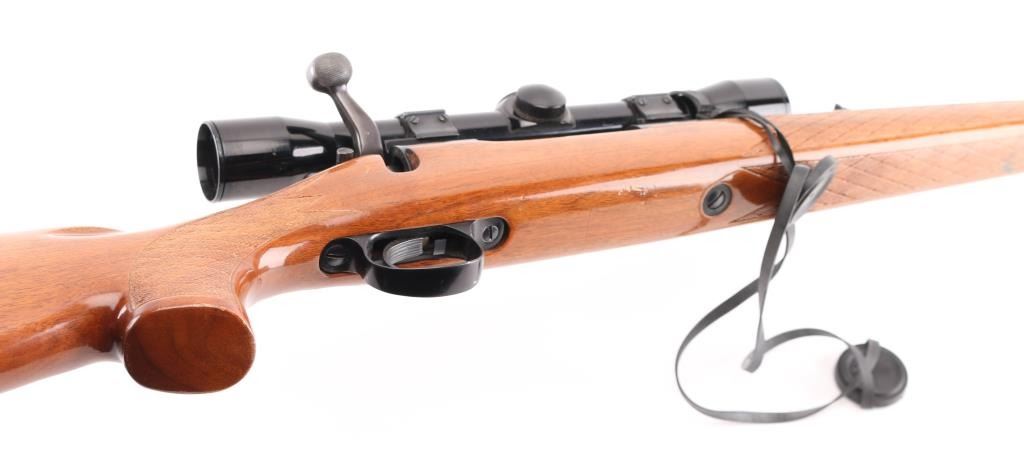 Vintage bolt action sporting rifle chambered in 7mm Remington Magnum, manufactured circa 1962-1970. Features a blued finished 24" stainless steel barrel with ramped blade front sight with brass bead, sport rear sight with white triangle, Bushnell 4X Banner scope with bikini cover, adjustable serrated trigger, checkered bolt knob, manual safety on the right side of the receiver, internal box magazine with no floorplate, press checkered Monte Carlo style shoulder stock with factory recoil pad. Rifle exhibits approximately 98% of it's original finish showing slight edge wear, scratches on the barrel and nicks on trigger guard. Action is smooth, the bore is excellent but dirty, the optics are sharp and the wood stock is very good with scattered small scratches. Condition is NRA Excellent. ***Modern Firearm***