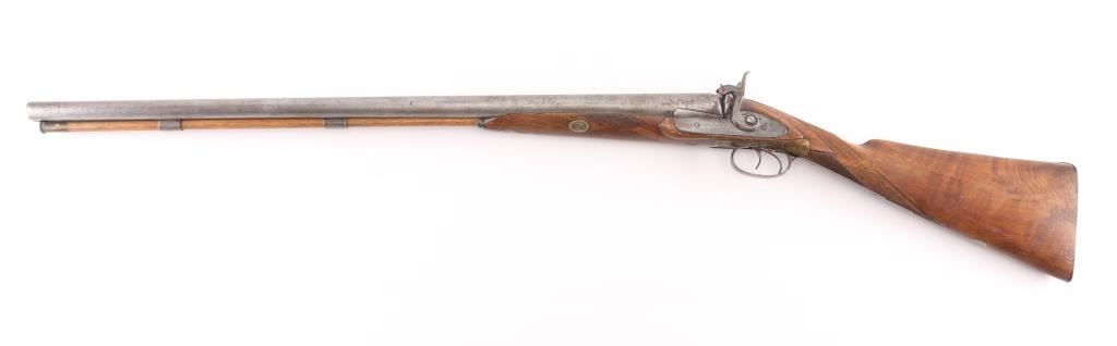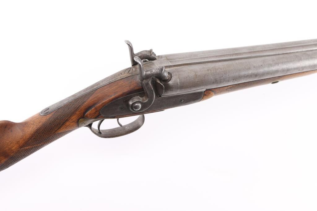 Antique English muzzling SxS shotgun, approx. 16 ga. 29 3/4' Damascus barrels, double triggers, brass sighting bead. Smooth rib marked "Moore London Fine Twist", lock plated marked " Moore & C". Hammers lock up tight, brass tipped wood ram rod, one piece wood stock has checkering on the forearm and wrist, steel buttplate. Two strips of 4" brass have been screws under the hammers to the wrist for reinforcement, appear period. Metal is in the white, wood appears to have been cleaned. NRA Condition-Very Good. Antique firearm.