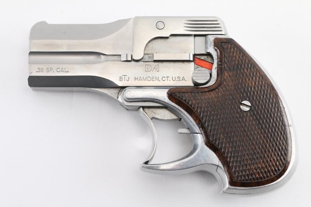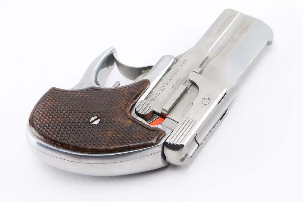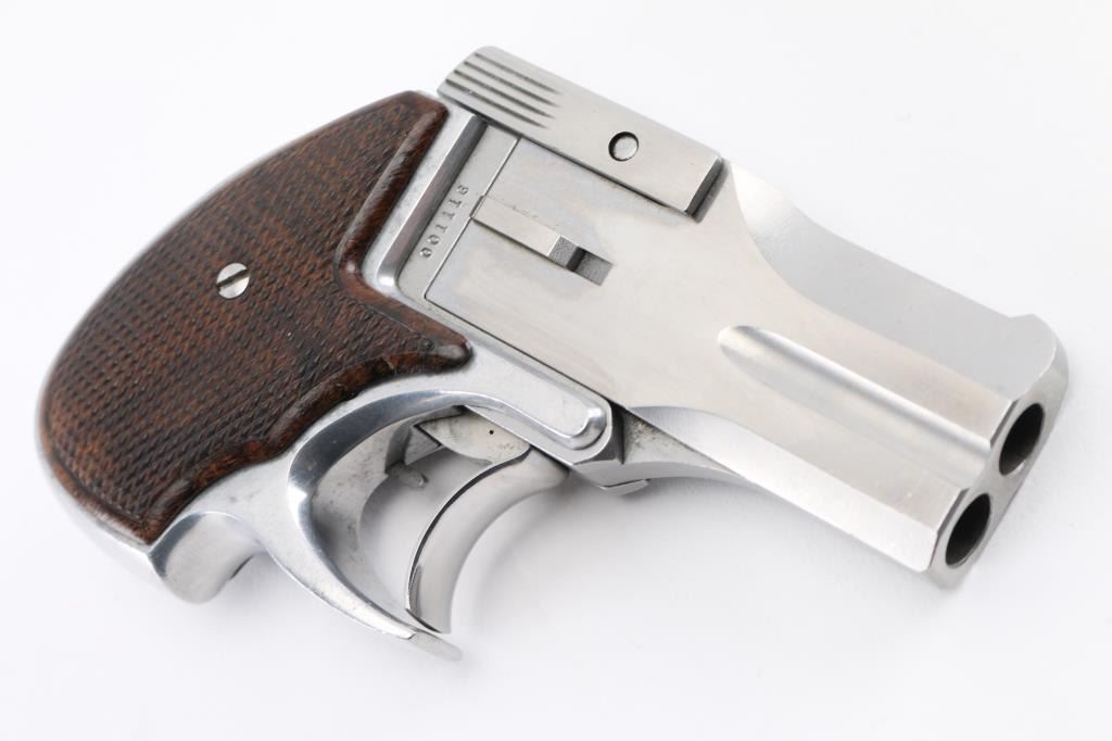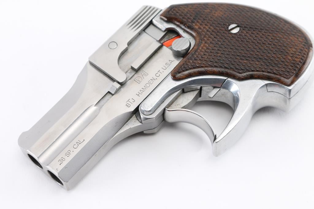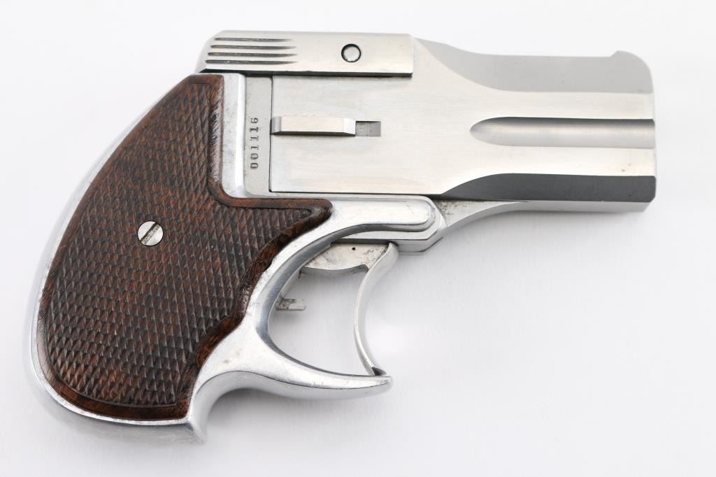 Double action only (DAO) break open double barrel derringer. Appears similar to the High Standard derringer, although a bit larger and centerfire. Features 3" barrels, stainless steel construction, checkered wood grip panels, fixed sights, manual safety. Bores are very good condition, need cleaning. Finish is near excellent, shows handling marks. Grips are excellent. Condition is near NRA Excellent *** Modern Firearm ***
