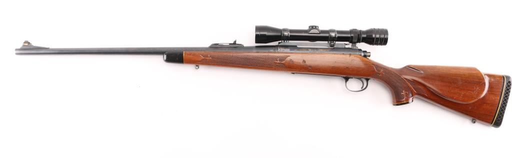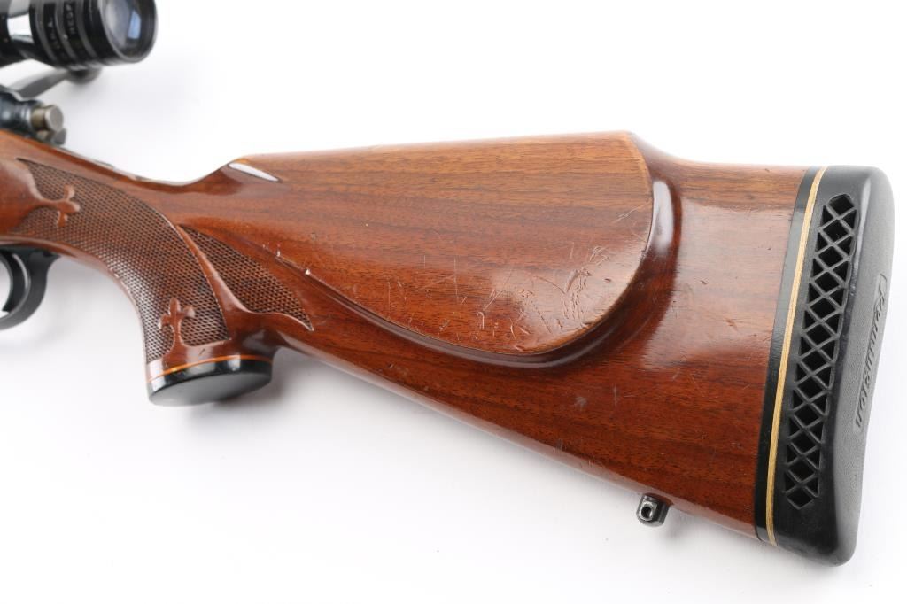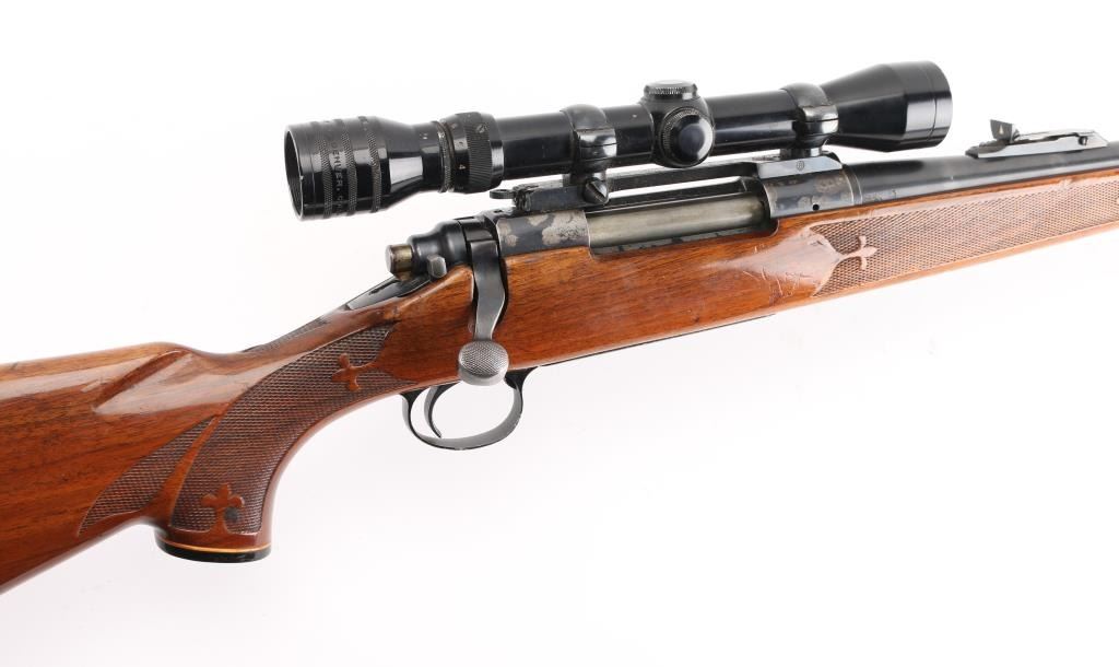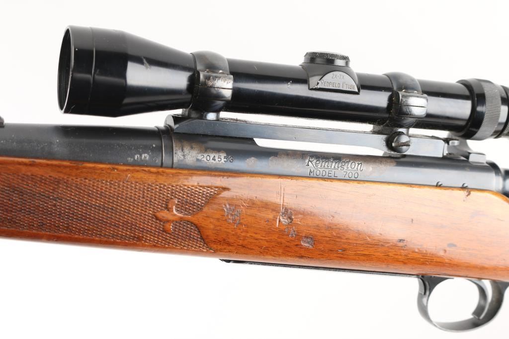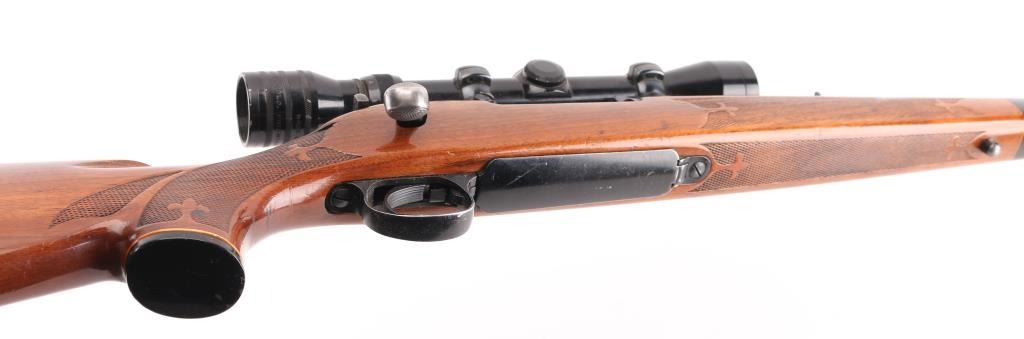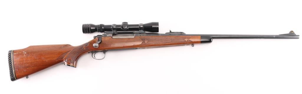 Bolt action rifle features blued finish, wood stock, ramped blade front & sporting rear sights, Redfield base & rings with Redfield 2-7x scope mounted, hinged floorplate, manual safety. Stock has pressed checkering panels, right hand cheek piece, sling studs, ventilated rubber recoil pad. Bore is very good, appears dirty. Retains 40% finish with losses and mottled colors on much of receiver and underside of barrel, edge losses. Wood is good to very good with scrapes and dents, some loss the urethane finish. Scope is very good condition, clear view, fine crosshair. Condition is NRA Good++ *** Modern Firearm ***