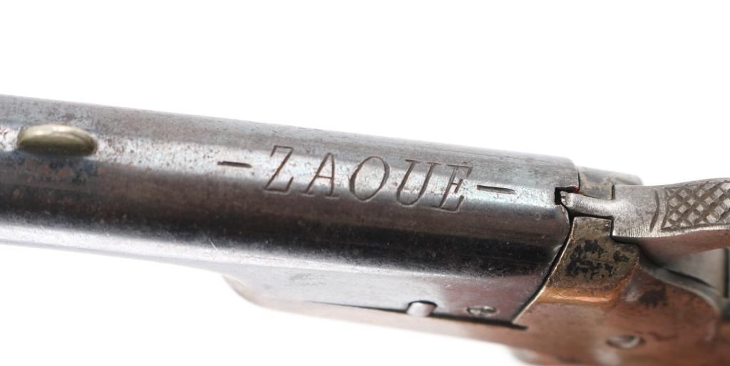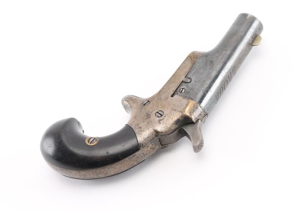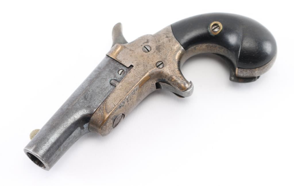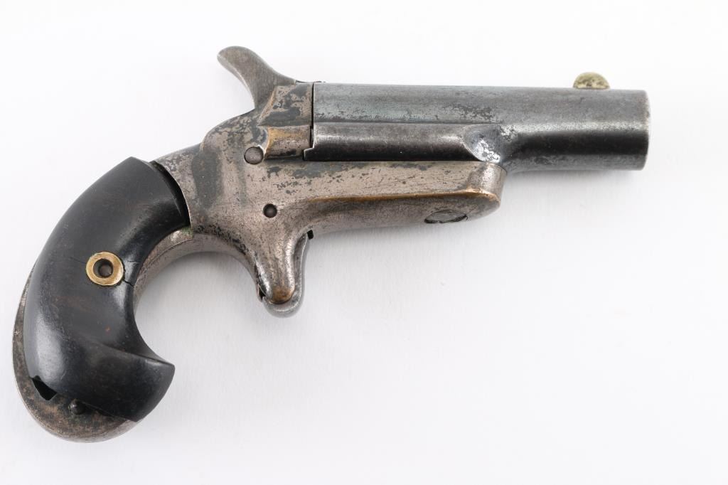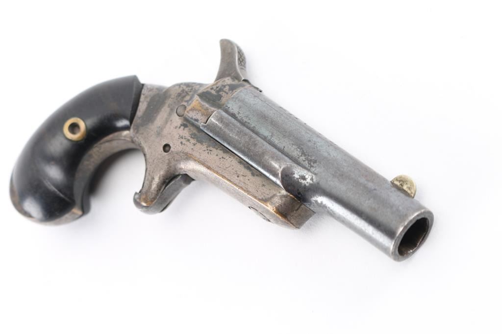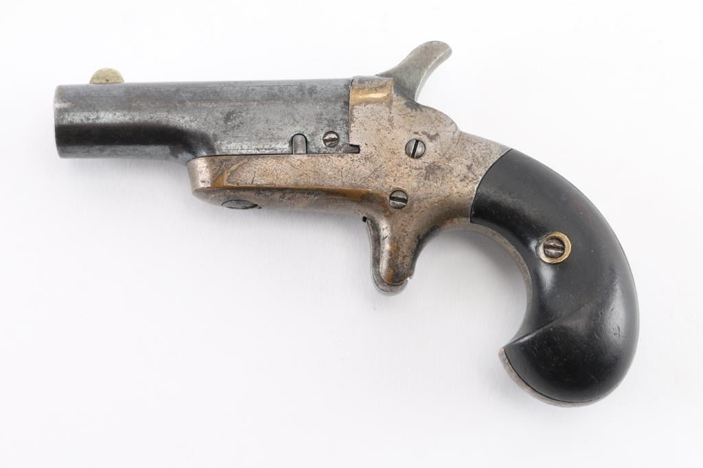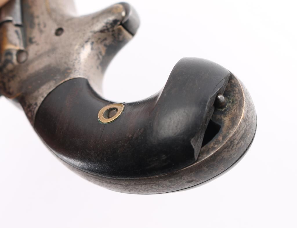 French copy of the Colt deringer. Features 2.5" barrel that rotates sideways for loading, spur trigger, single action, bird's head grip frame. Barrel is blued, with brass blade front sight. Frame is nickel plated brass. Smooth walnut grips. Bore is poor to fair, pitted and dark with visible rifling. Barrel retains 70% finish, fading to brown, with edge losses. Frame shows much thinning and loss of plating, with brass visible on corners. Right grip is broken. Barrel does not latch well into frame. Hammer does not stay cocked. Condition is NRA Poor *** C&R Firearm ***