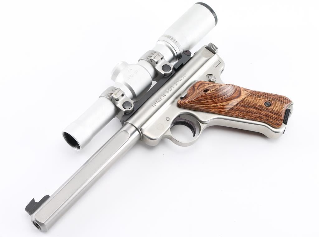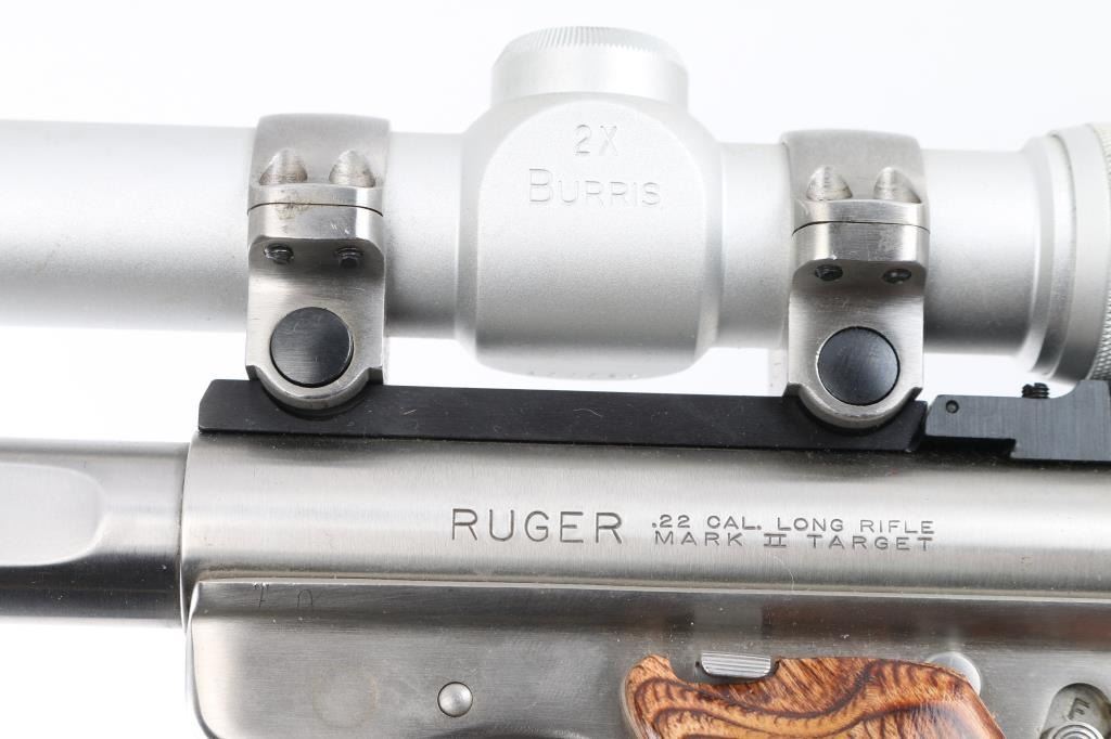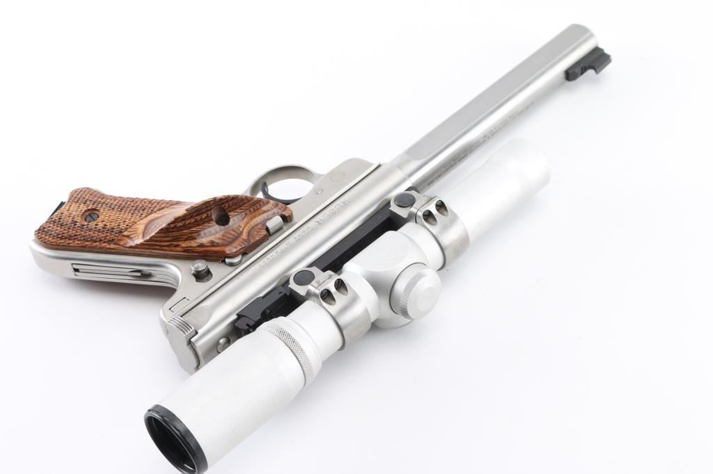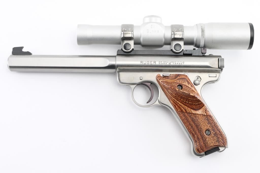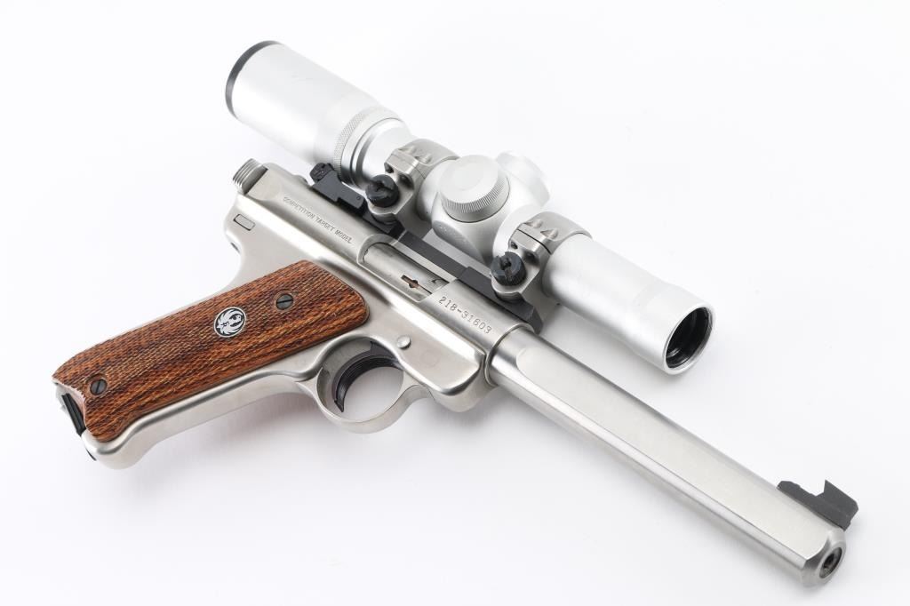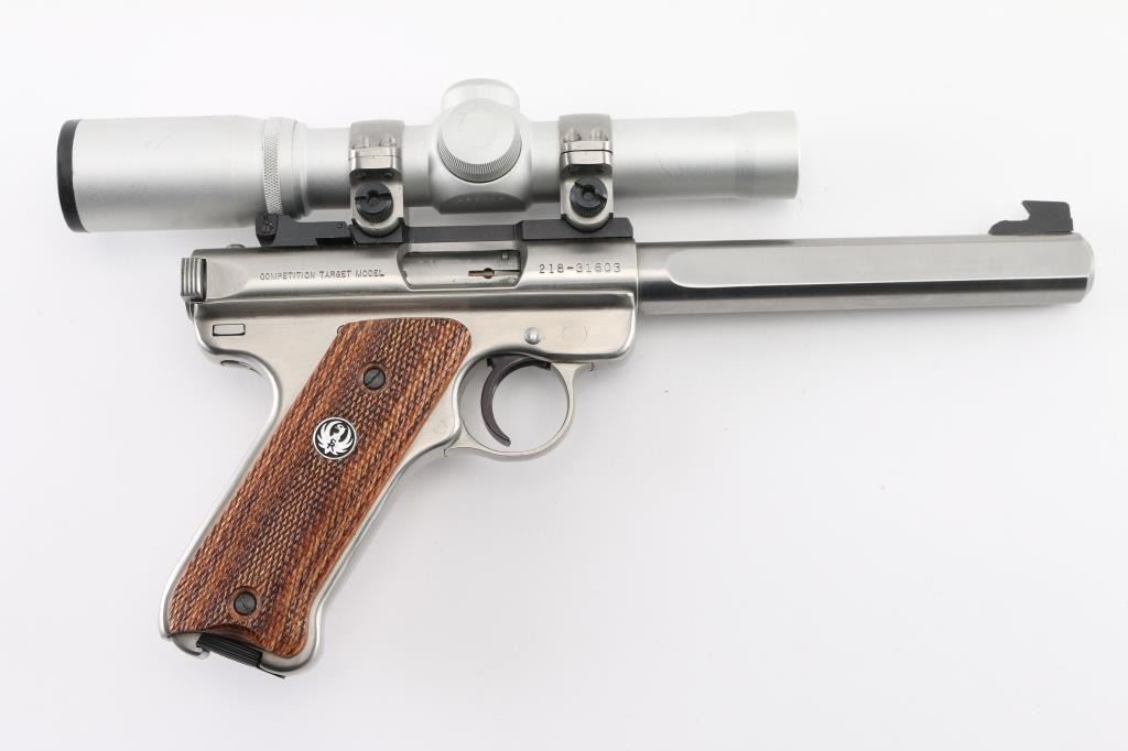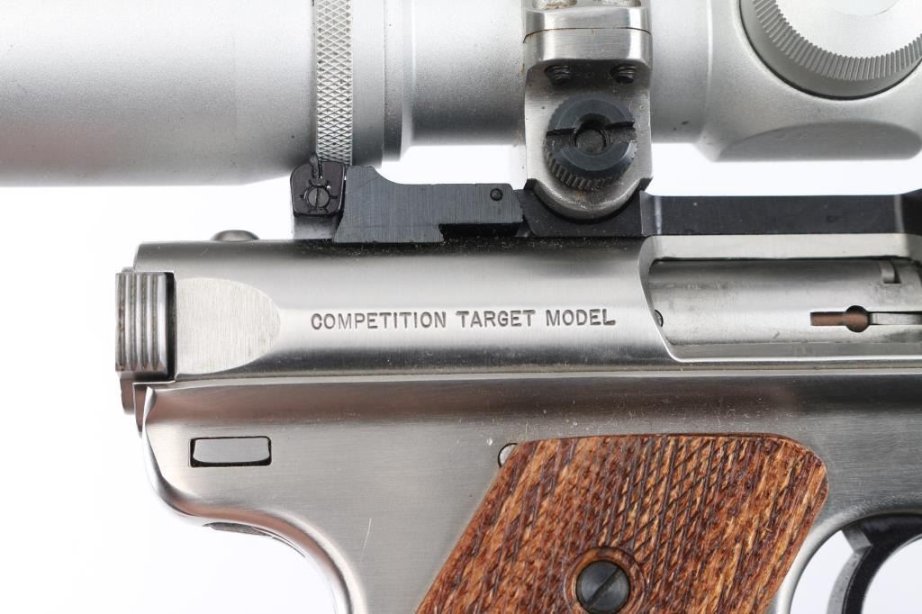 'Competition Target Model" American made semi-auto pistol chambered for .22 LR ammunition. It features stainless steel barrel and action, 7" slab side barrel, raised blade front sight, adjustable rear sight, alloy frame, serrated trigger, checkered wood target grips with thumb rest, and Ruger medallion on right grip. Comes with one 10 round factory magazine. Mounted with a Burris 2X scope, clear optics, Bore is excellent/bright. Metal finish looks great. Grips are fine. Condition is NRA Excellent. Modern Firearm.