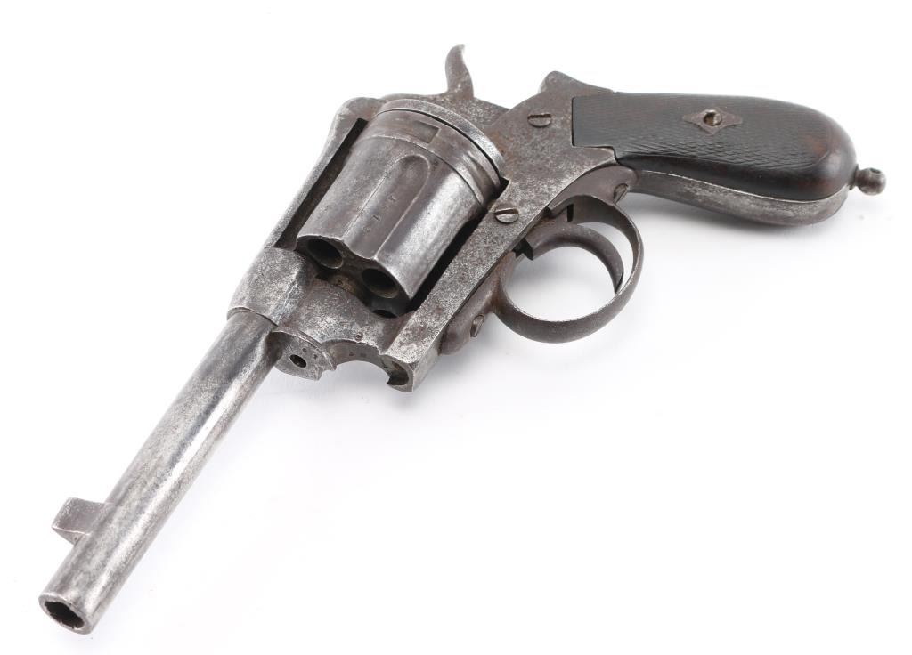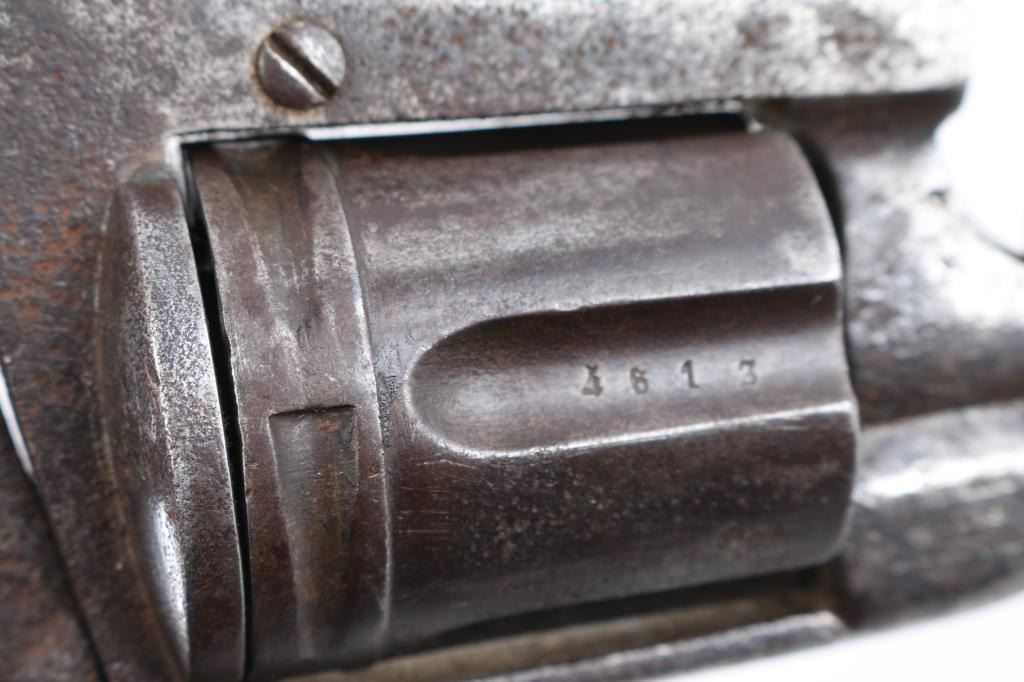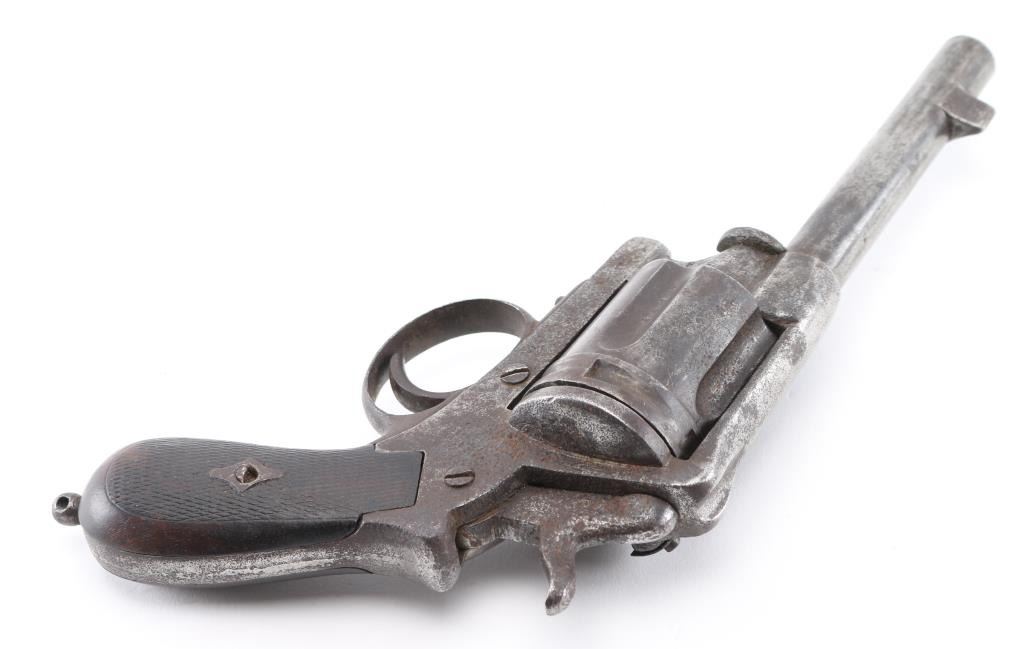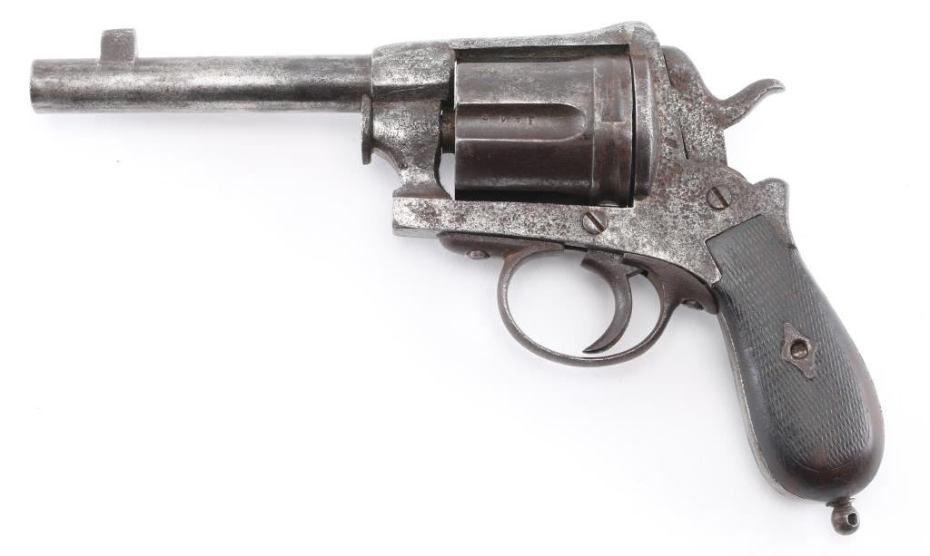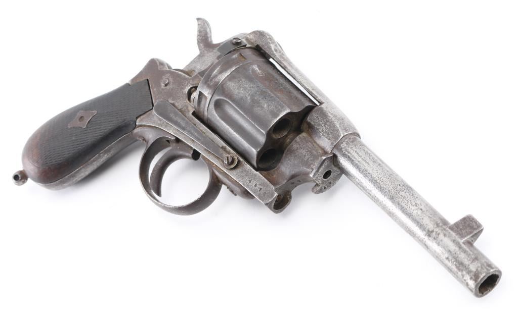 Belgian made antique large frame single-action revolver in the style of the "Constabulary" revolver. Liege proof mark on cylinder face. Royal British Cipher "Crown over GR" on left frame. and Birmingham re-proof "Crown over R" on left frame. Markings are faint, other markings are unreadable. 5" barrel, lanyard ring stud, no ring, wood bag grips. Matching serial number on frame and cylinder. Relic condition, hammer does not stay cocked, trigger does not return, missing loading gate, and extractor rod. The bore is dark/dirty, grips are worn, finish is a dark gray/brown pitted patina. NRA Condition-Poor as Antique Firearm.