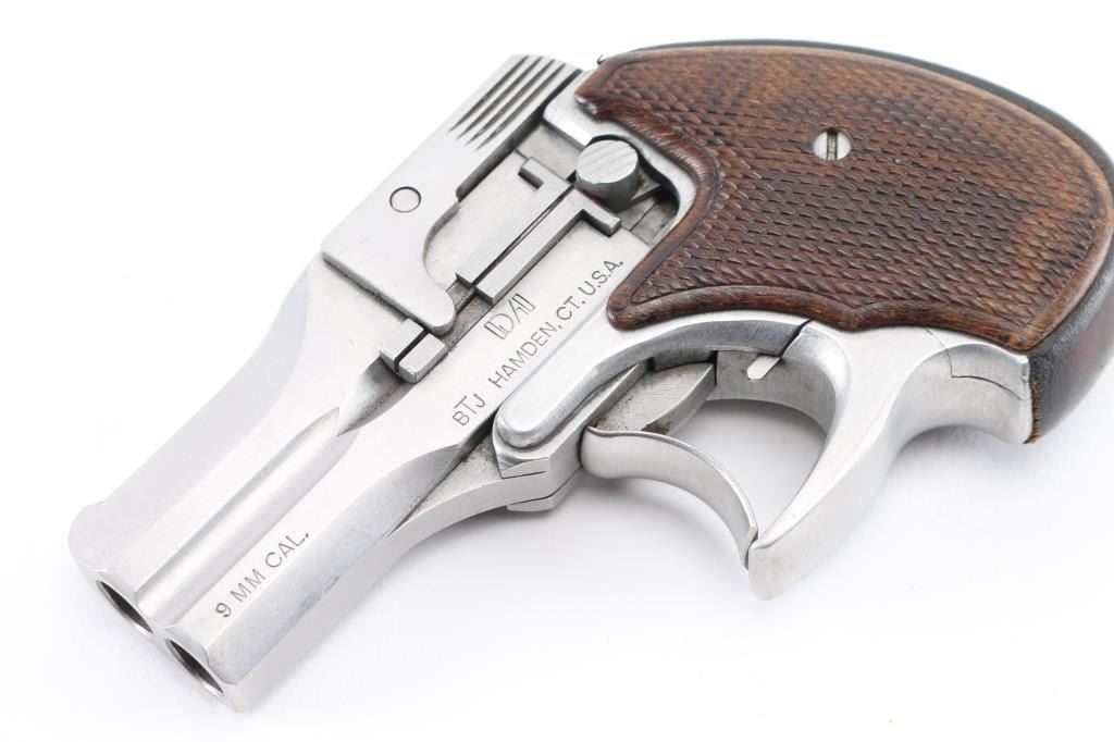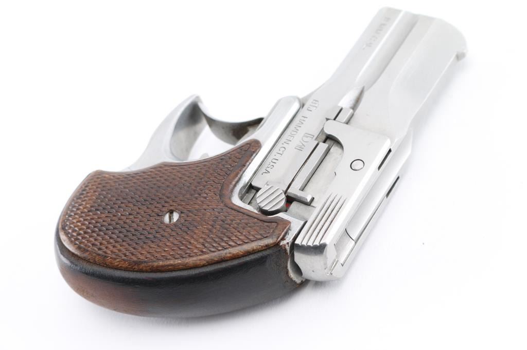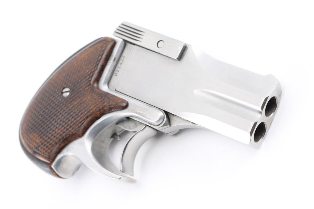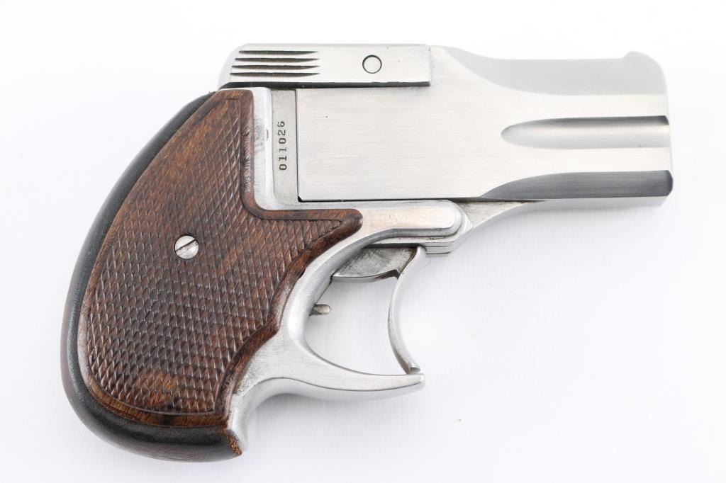 Double action only (DAO) break open double barrel derringer. Appears similar to the High Standard derringer, although a bit larger and centerfire. Features 3" barrels, stainless steel construction, checkered wood grip panels, fixed sights, manual safety. Bores are very good condition, need cleaning. Finish is near excellent, shows handling marks. Grips are excellent. Electrical tape added to rear of frame. Condition is near NRA Excellent *** Modern Firearm ***