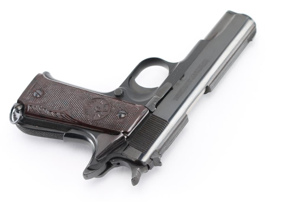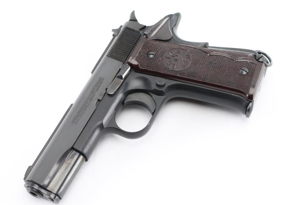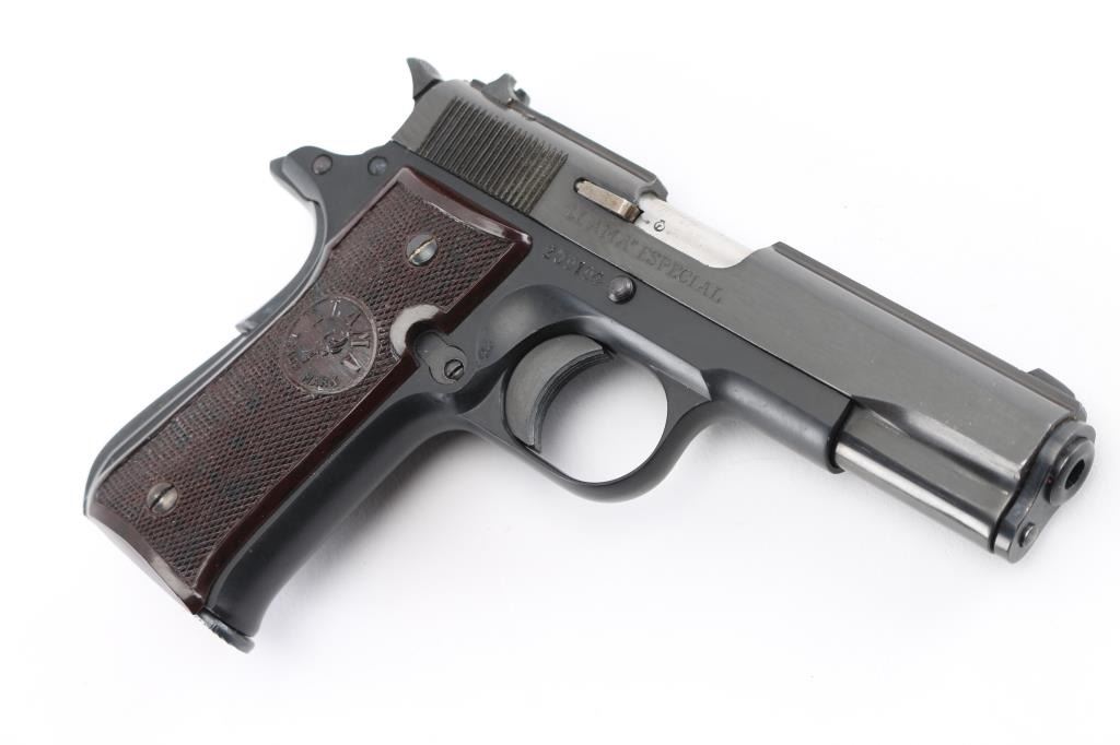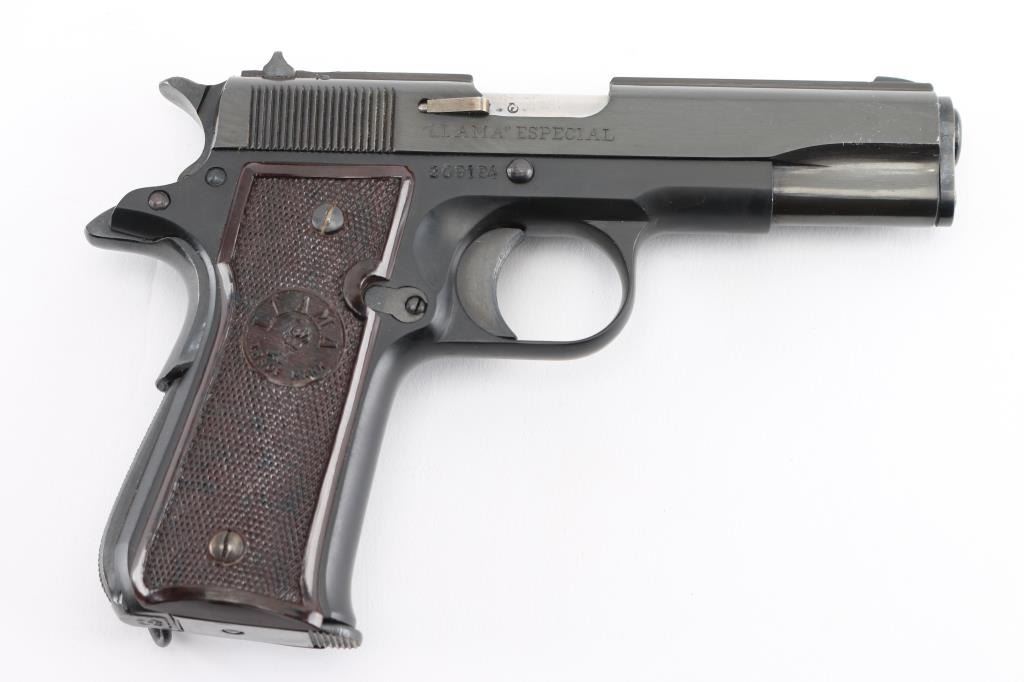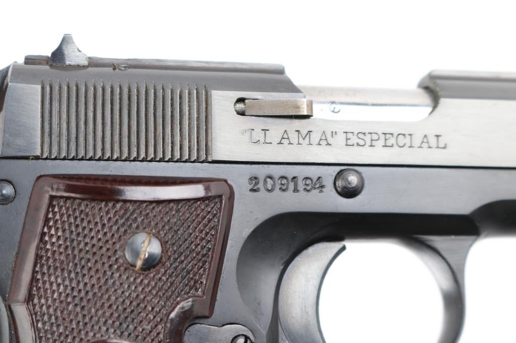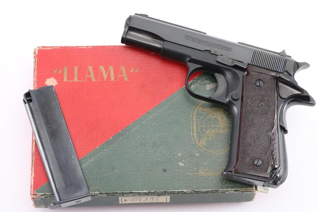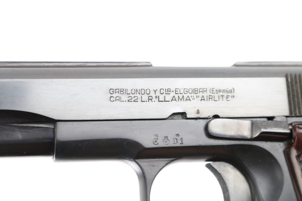 'Airlite' Spanish semiautomatic rimfire pistol, date coded 1958. Features blued finish, matching color lightweight alloy frame, checkered brown plastic grips with "LLAMA" medallions, single action trigger, 3.75" barrel, blade front sight, notch rear sight in dovetail, frame mounted manual safety, grip safety, lanyard ring. Bore is very good condition. Retains 95% dark blue with small scratches, bare metal at sharp edges. Grips are very good condition. Includes two magazines, manual, in fair condition factory box numbered to gun Condition is near NRA Excellent *** C&R Firearm ***