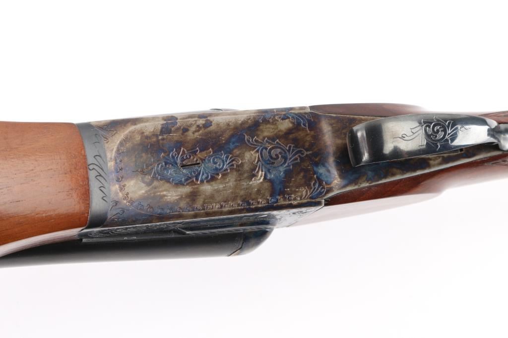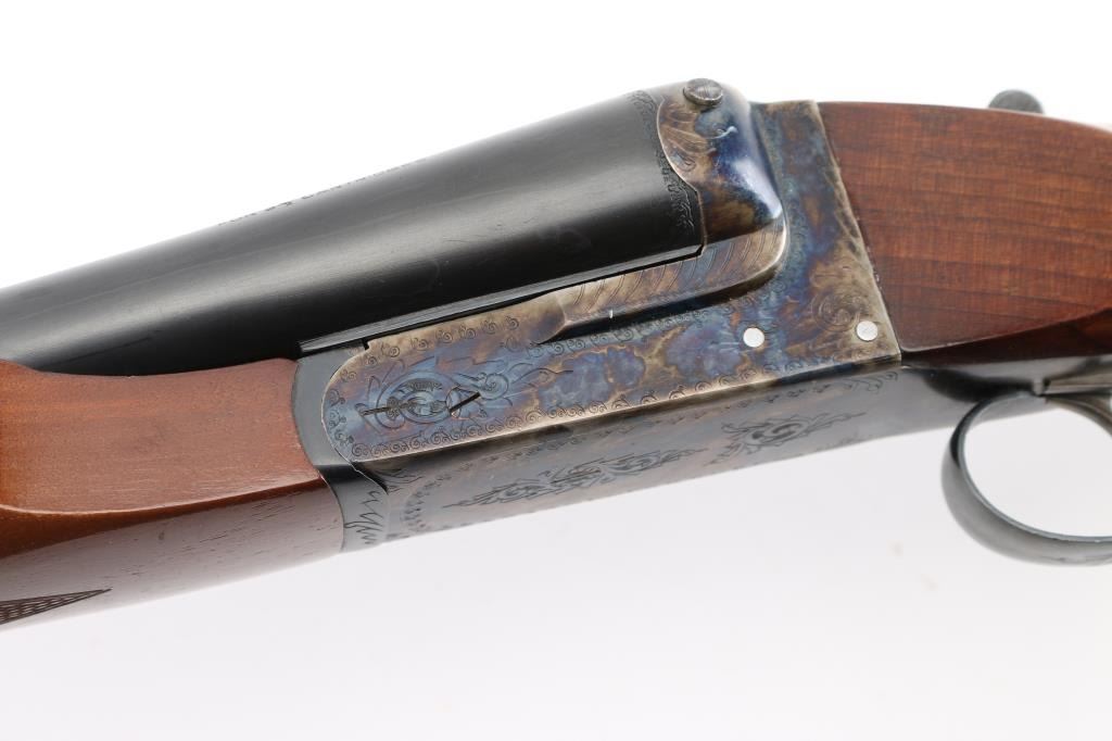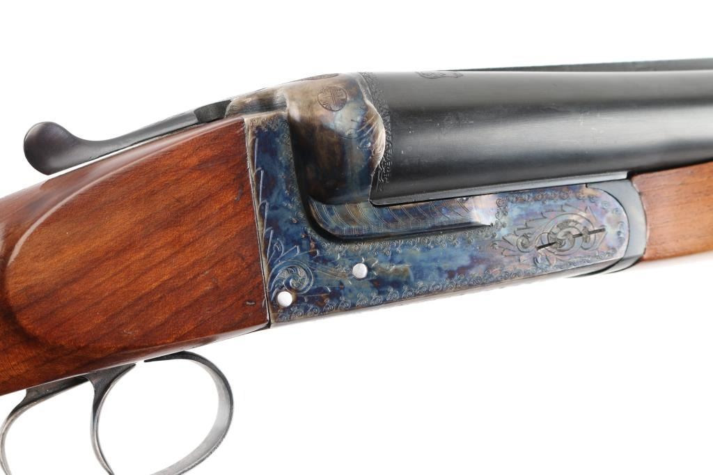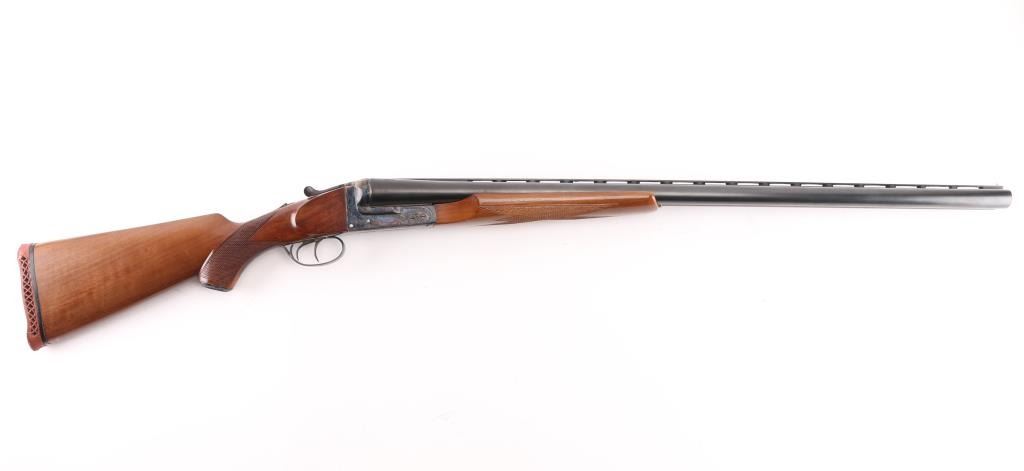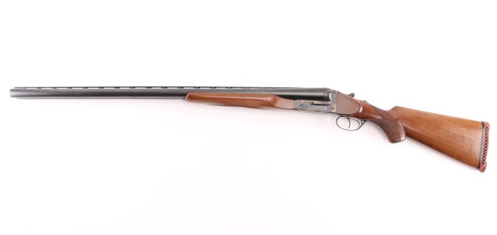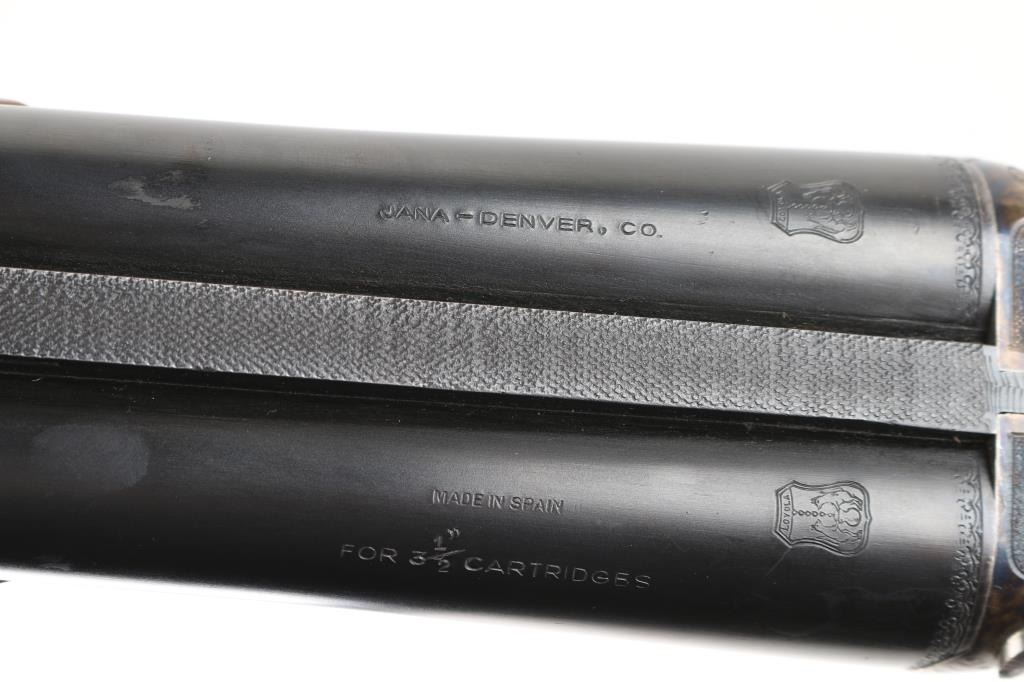 Spanish double barrel side-by-side break-action shotgun, imported by Jana, Denver CO. chambered in 10 gauge for 3-1/2" shells. Features Greener cross bolt, blued barrels, case color action, checkered wood beavertail forend, wood pistol grip butt with checkering at wrist, ventilated rubber recoil pad, 32" barrels with a textured vent rib and a steel front bead sight, internal hammers, double triggers, tang safety, ejectors. Bores are excellent. Retains 98% bluing with a few scattered marring on the barrels. Case color on receiver is bright, showing very little fading at corners. Wood is very good condition with few scratches and shallow dents. Recoil pad has gone hard, needs replacement. Stock measurements: 14" Length of Pull, 1-1/2" Drop at Comb, 2-3/4" Drop at Heel. Engraved "LOYOLA" shields on both chambers. Receiver has stippled panels on top, floral scroll engraving on majority of flat surfaces. Condition is NRA Excellent. *** Modern Firearm ***