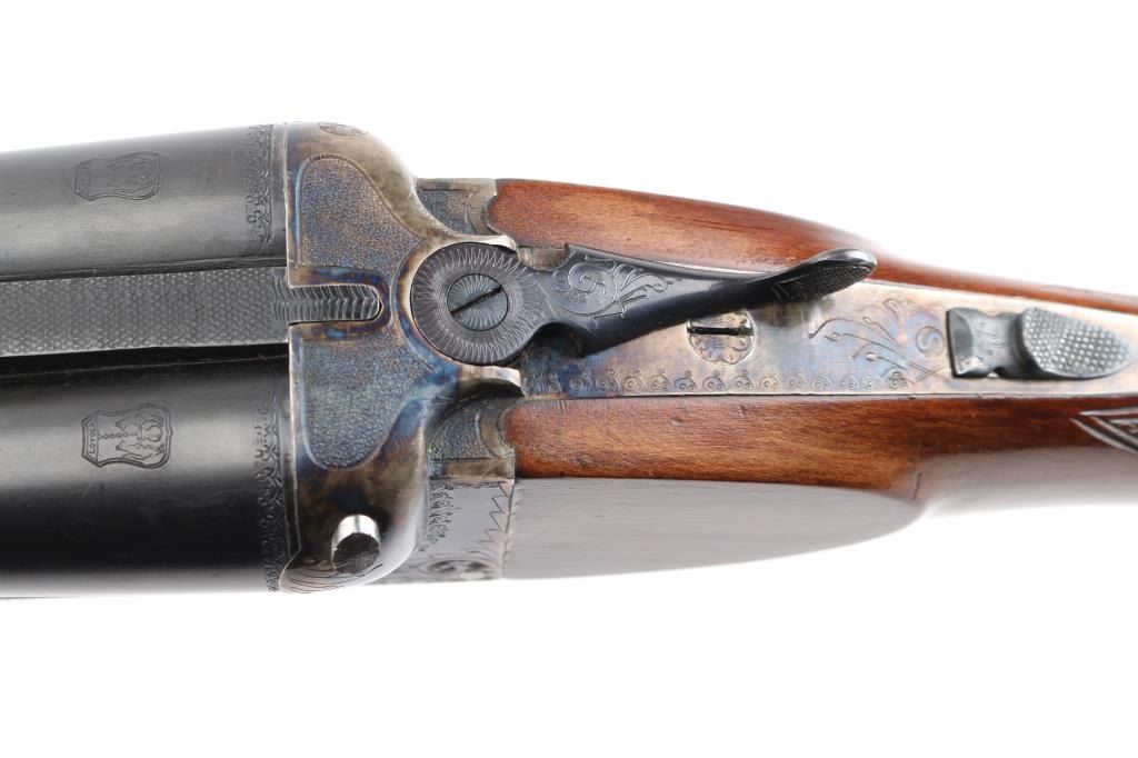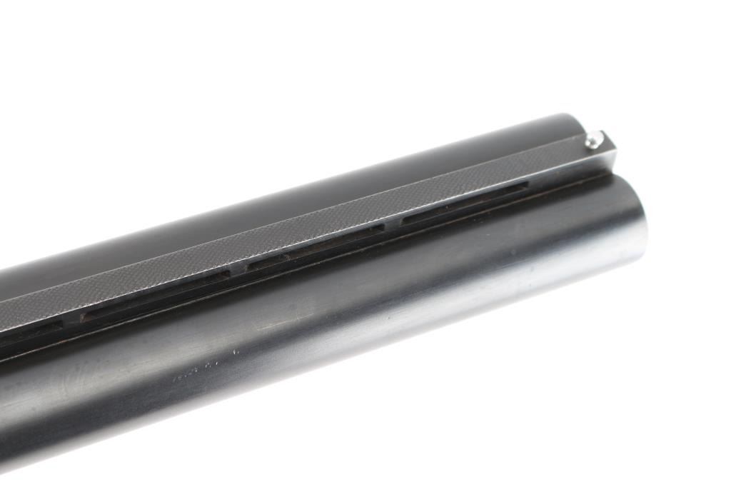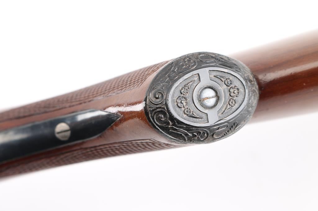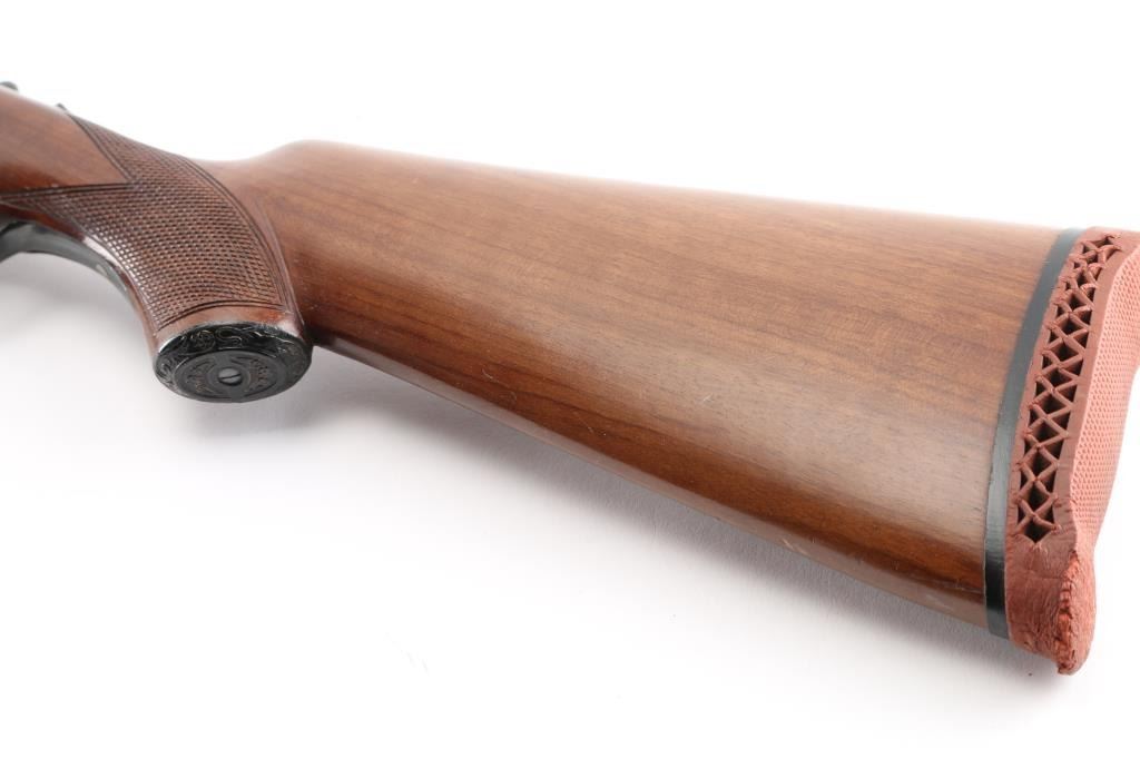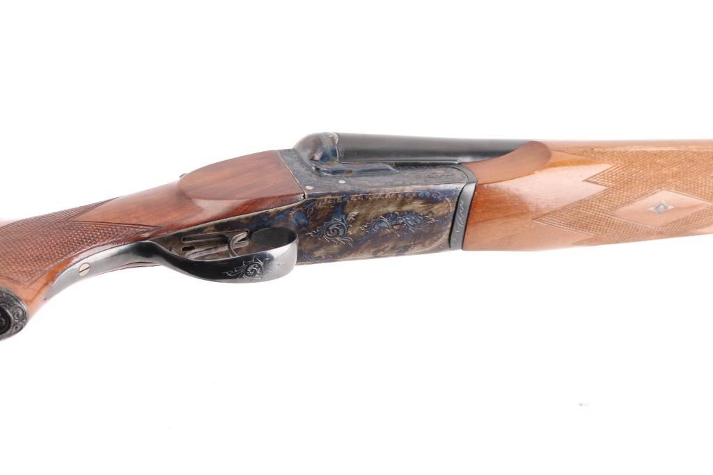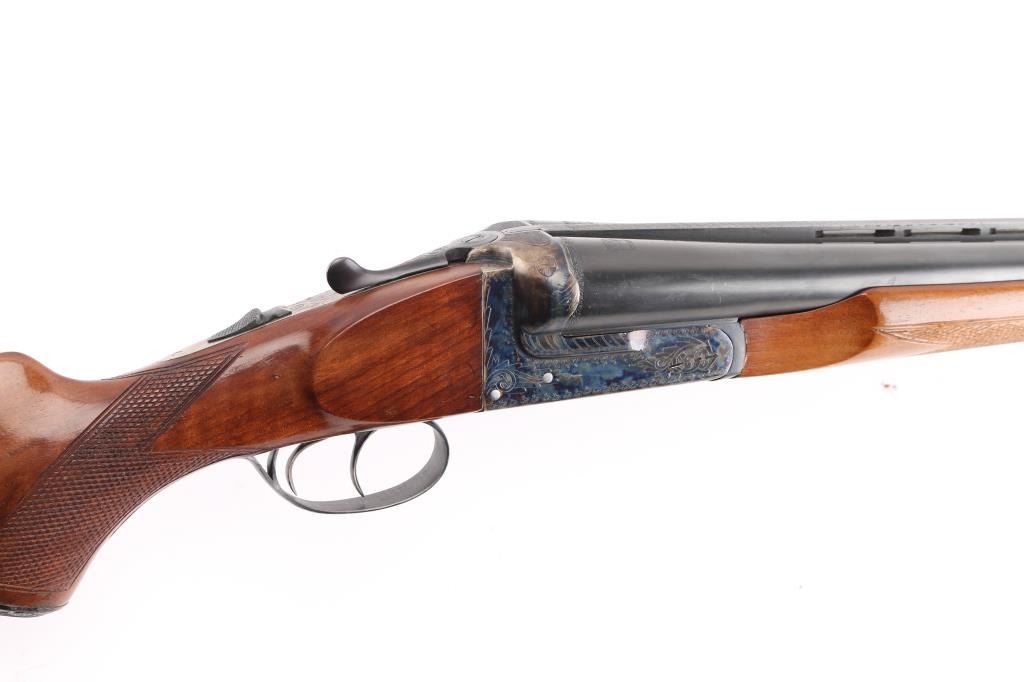 Spanish double barrel side-by-side break-action shotgun, imported by Jana, Denver CO. chambered in 10 gauge for 3-1/2" shells. Features Greener cross bolt, blued barrels, case color action, checkered wood beavertail forend, wood pistol grip butt with checkering at wrist, ventilated rubber recoil pad, 32" barrels with a textured vent rib and a steel front bead sight, internal hammers, double triggers, tang safety, ejectors. Bores are excellent. Retains 98% bluing with a few scattered marring on the barrels. Case color on receiver is bright, showing very little fading at corners. Wood is very good condition with few scratches and shallow dents. Recoil pad has gone hard, needs replacement. Stock measurements: 14" Length of Pull, 1-1/2" Drop at Comb, 2-3/4" Drop at Heel. Engraved "LOYOLA" shields on both chambers. Receiver has stippled panels on top, floral scroll engraving on majority of flat surfaces. Condition is NRA Excellent. *** Modern Firearm ***