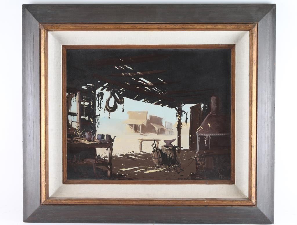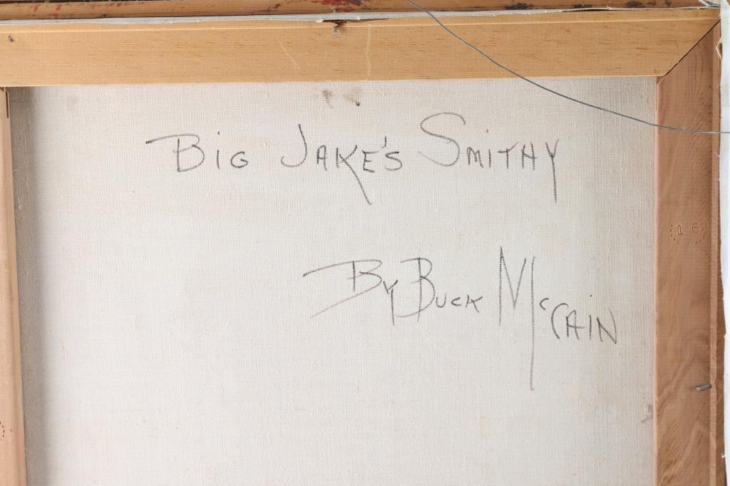 By artist "Buck McCain" entitled "Big Jakes Smithy" framed and triple matted, signed bottom right, and on back. Image size measures 20x16".