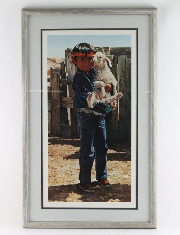 By profound artist "Ray Swanson" depicting Navajo Child, signed and numbered 118/500 in lower left corner. This piece is triple matted and framed. Image size measures 25x13.5.