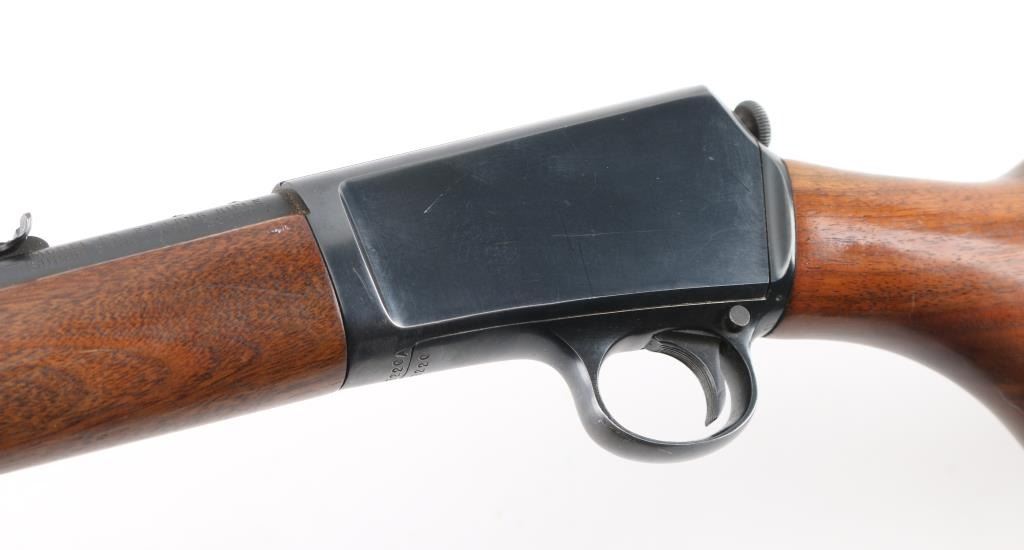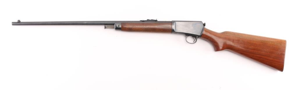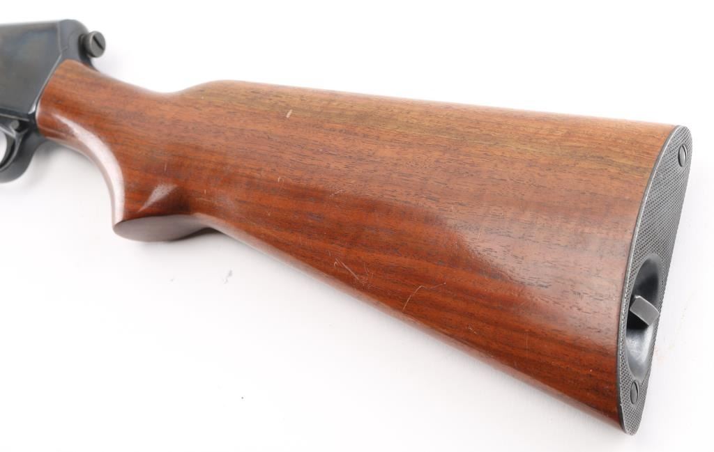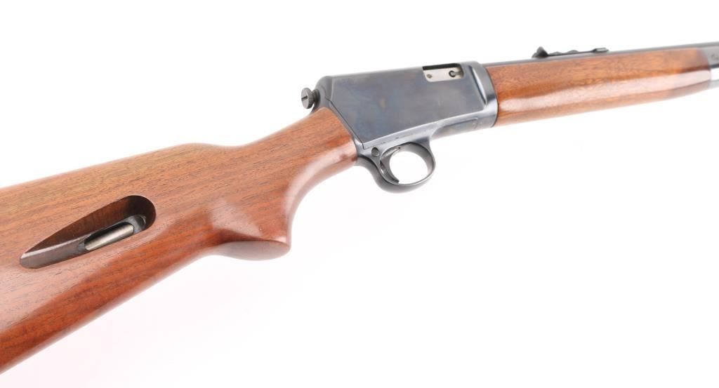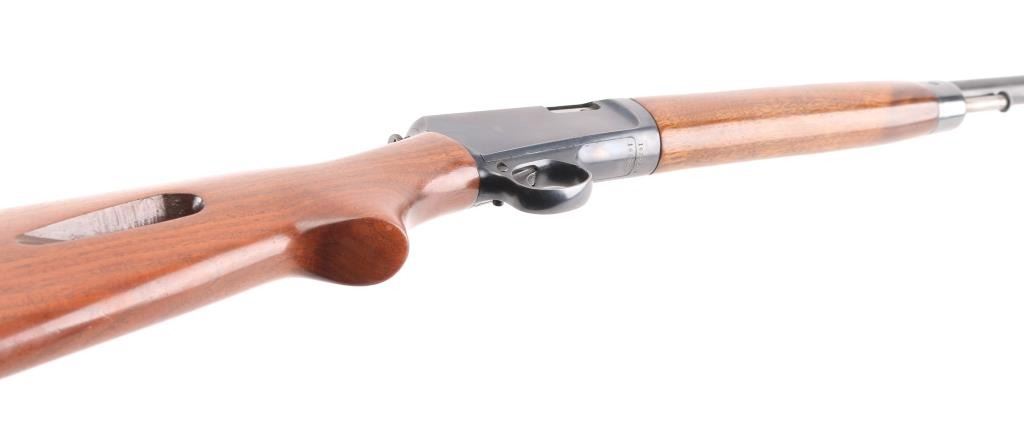 Vintage semiautomatic rimfire rifle manufactured circa 1956. Features blued finish, wood forend with steel nose cap, wood butt with curved grip, checkered steel buttplate, 23" barrel, dovetailed blade/white bead front sight, sporting rear sight, magazine tube in butt, manual safety, takedown screw at receiver rear. Charging rod in forearm. Drilled & tapped on top of receiver/barrel for optics. Bore is excellent condition. Retains 90+% finish, muzzle wear, some handling loss on bottom of receiver, minor scratches. Markings are crisp. Wood is very good condition overall, lightly varnished over small dents. Numbers on receiver & trigger guard match. Condition is NRA Very Good. C&R Firearm.