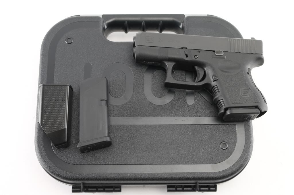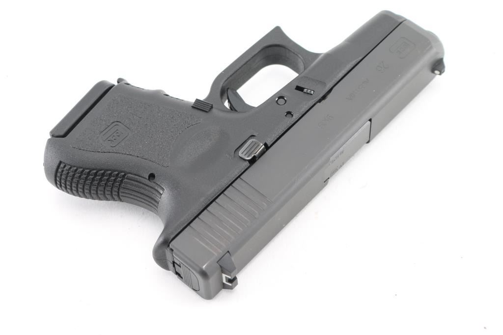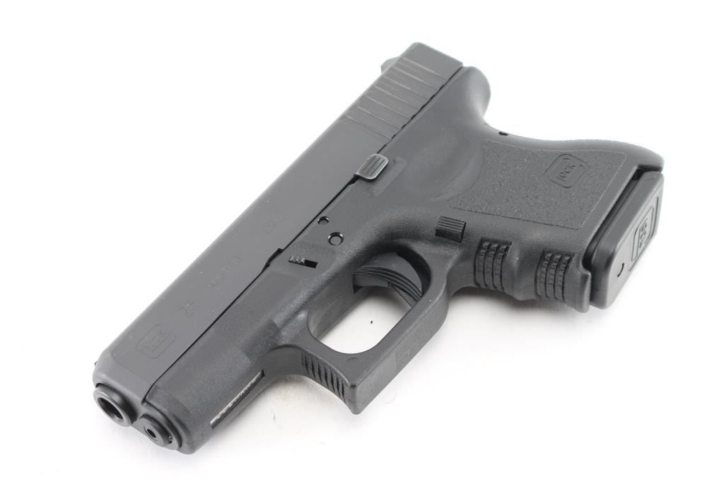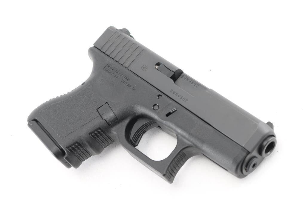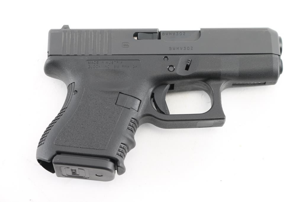 'Short Frame' Austrian made sub-compact safe-action semi-automatic pistol imported by Glock, Smyrna GA. Features a black finished slide, 3.3" barrel, front dot, rear white outline night sights, trigger safety, push button magazine release, factory 10 round magazine, black polymer frame with textured finger groove grip. Pistol has seen little use Like new. Action is smooth, the bore is excellent, and the polymer is fine. Includes the original factory hard case with documents, cleaning rod (1) spare magazine (2 total), and magazine loader. Condition is NRA Excellent. Modern Firearm.