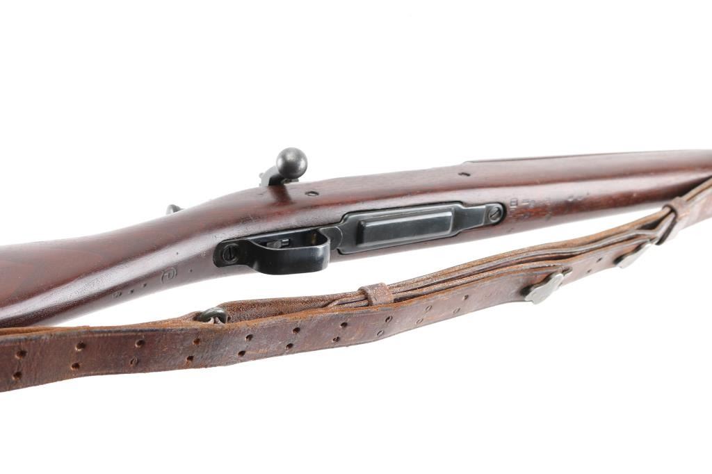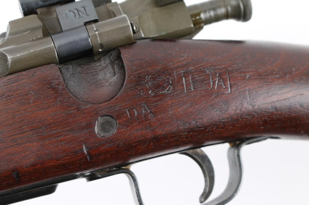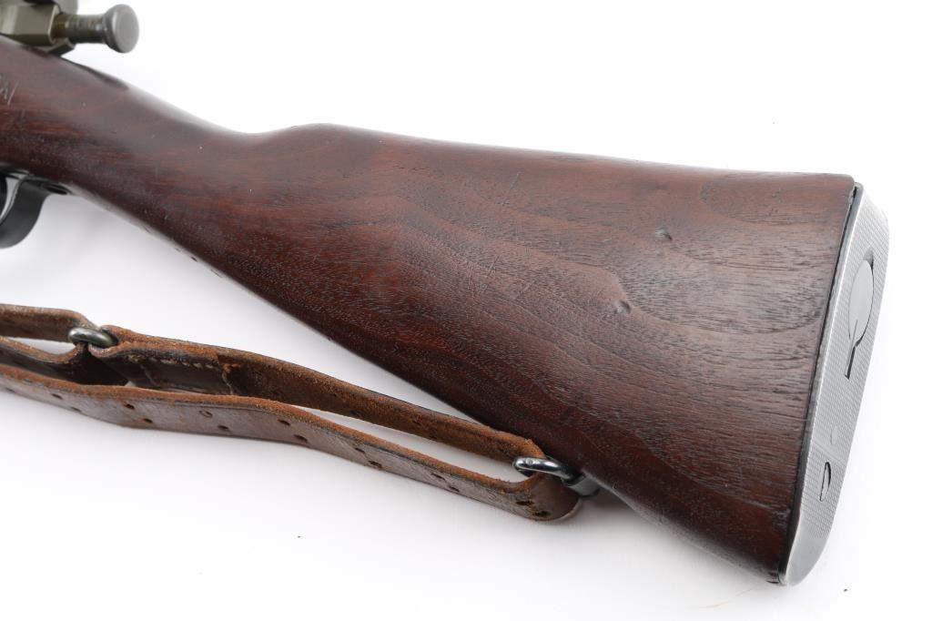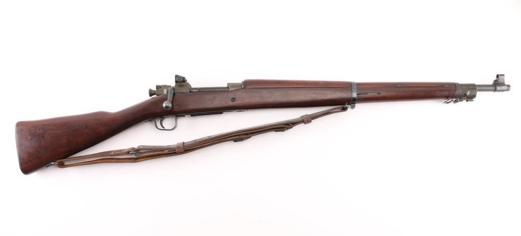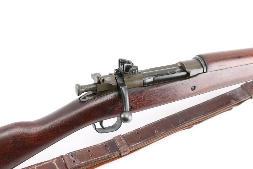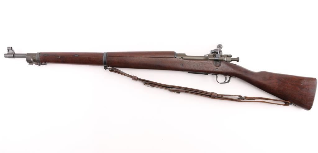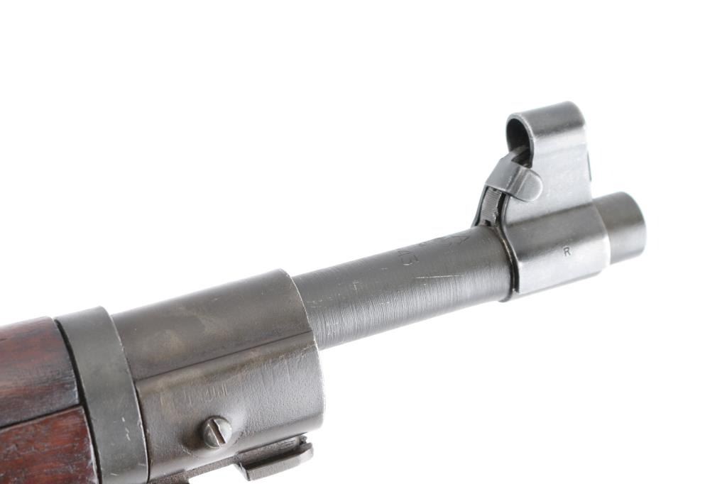 US Military WWII era bolt action rifle features parkerized finish, wood handguard & straight grip stock, blade front sight with protector installed, peep rear sight, bayonet lug, 24" barrel, three position safety, magazine cut-off, sling swivels, stacking swivel. Bore is very good condition. Retains 90% of the parkerized finish, greenish tint on receiver. Bands and bottom metal are blued, stamped metal. Barrel marked "RA / (flaming bomb) / 4-43". Wood is very good condition, with small dents and other evidence of service use. Visible stock cartouches include: "FJA", "RA", "P" proof, crossed cannons cartouche. Includes good condition leather sling. Condition is NRA Very Good++ *** C&R Firearm ***